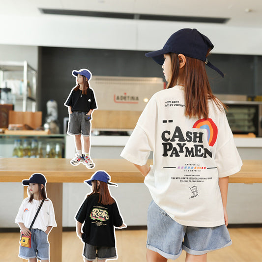 Z25030434女童短袖純棉洋氣兒童t恤女童夏季寬鬆前後印花半袖上衣童裝潮