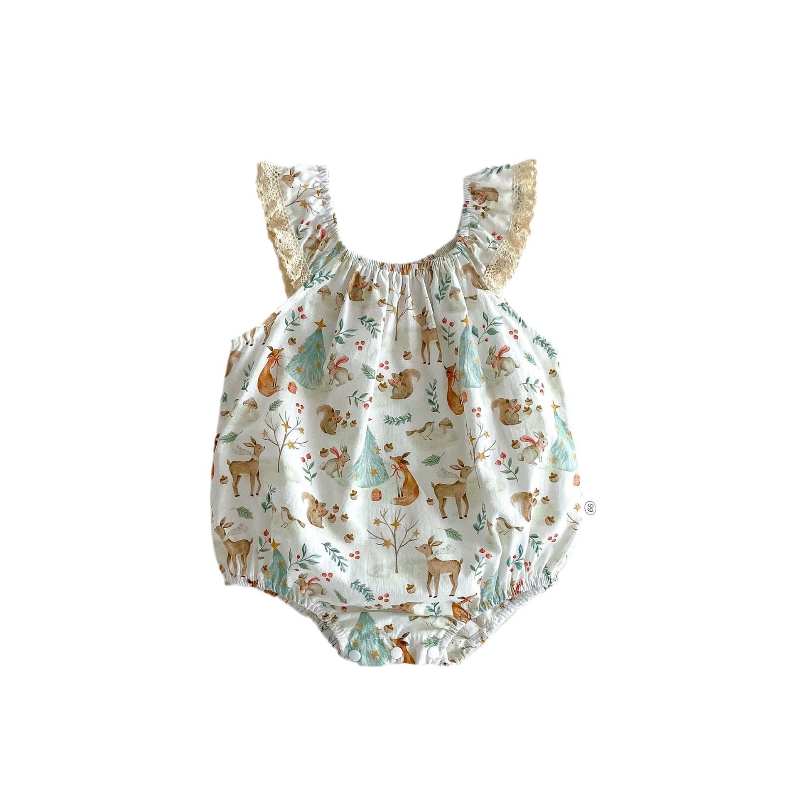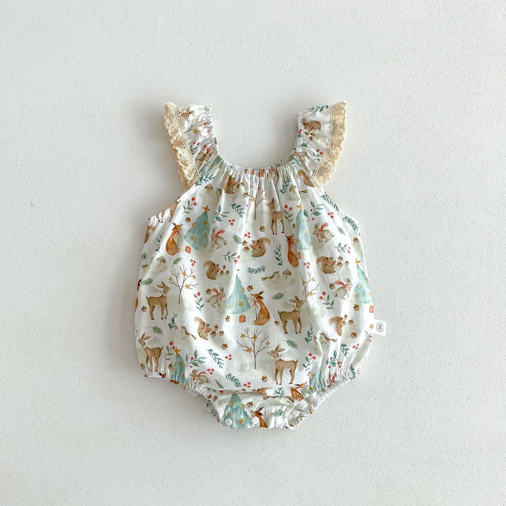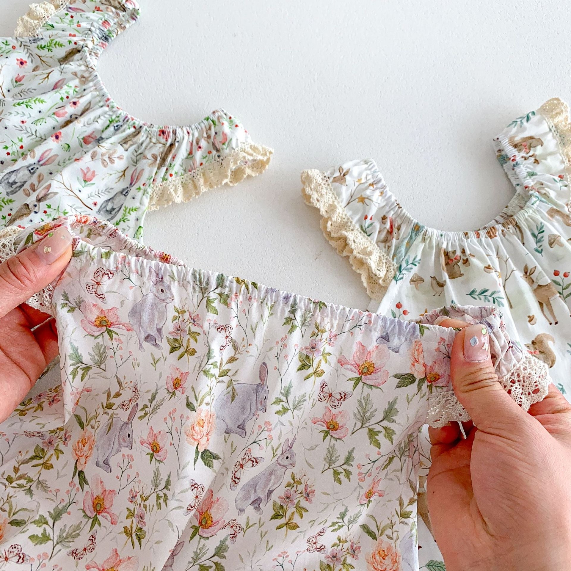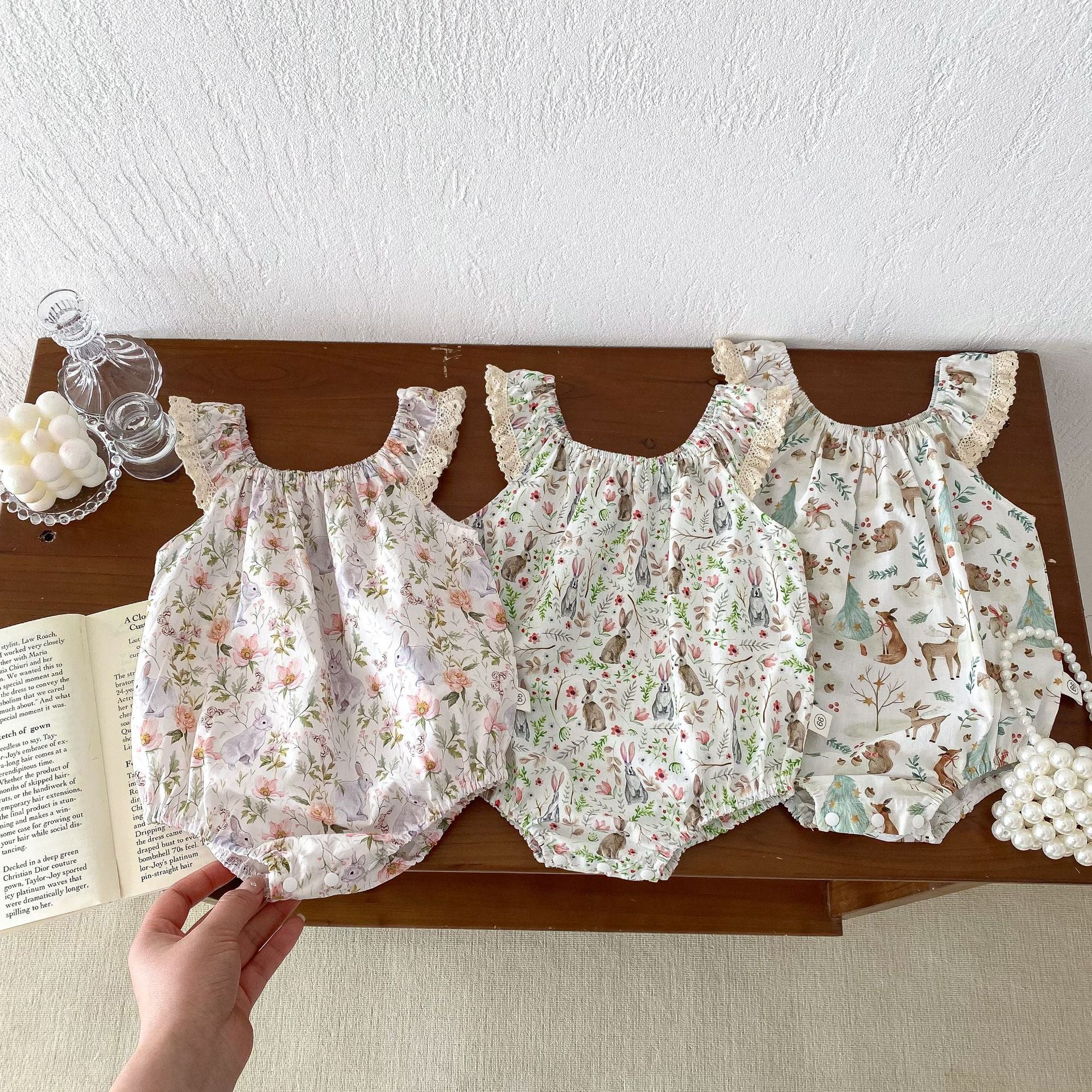 240414I14 寶寶夏季兔子印花飛袖吊帶無袖哈衣女寶寶薄韓版連身爬服