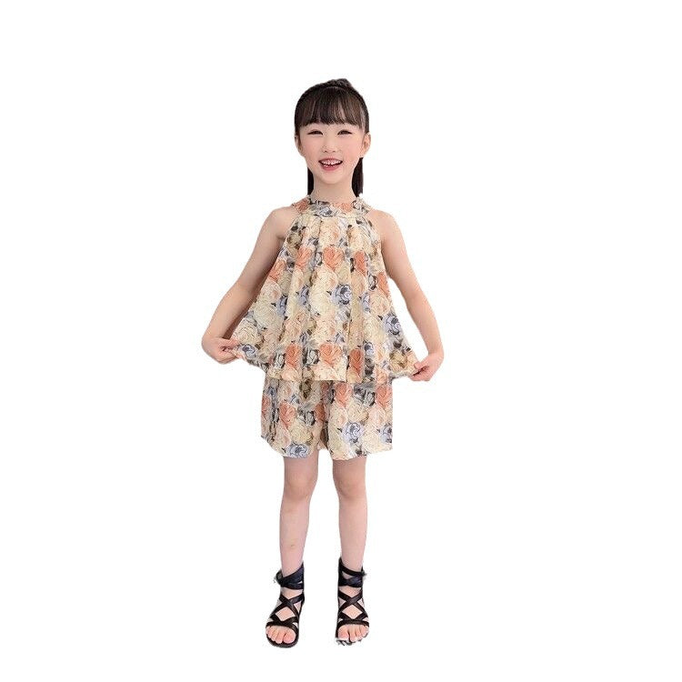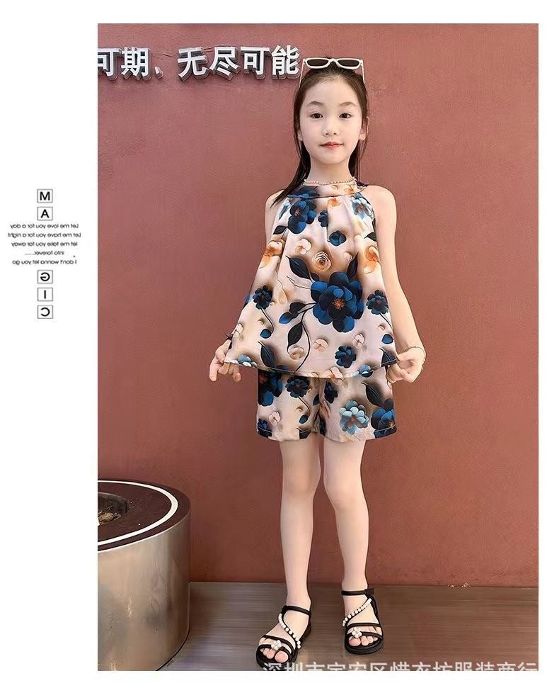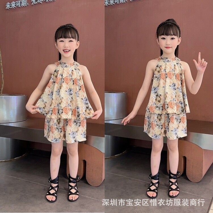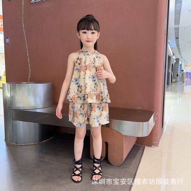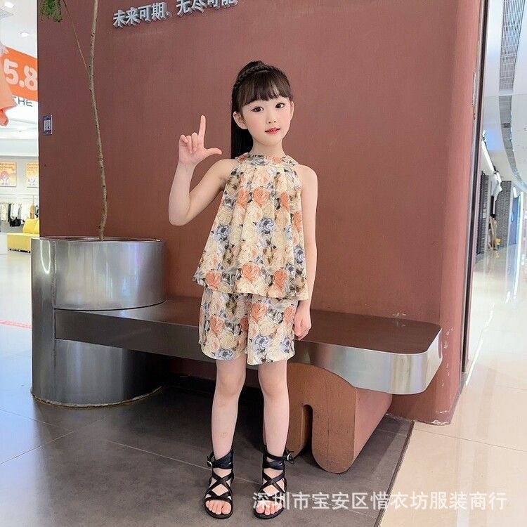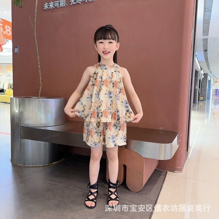 A25072303女民族風夏季新款女童無袖套裝兒童女孩洋氣薄款雪紡中小童