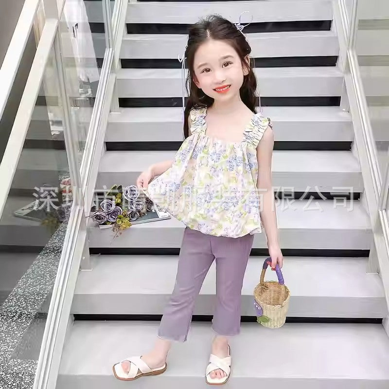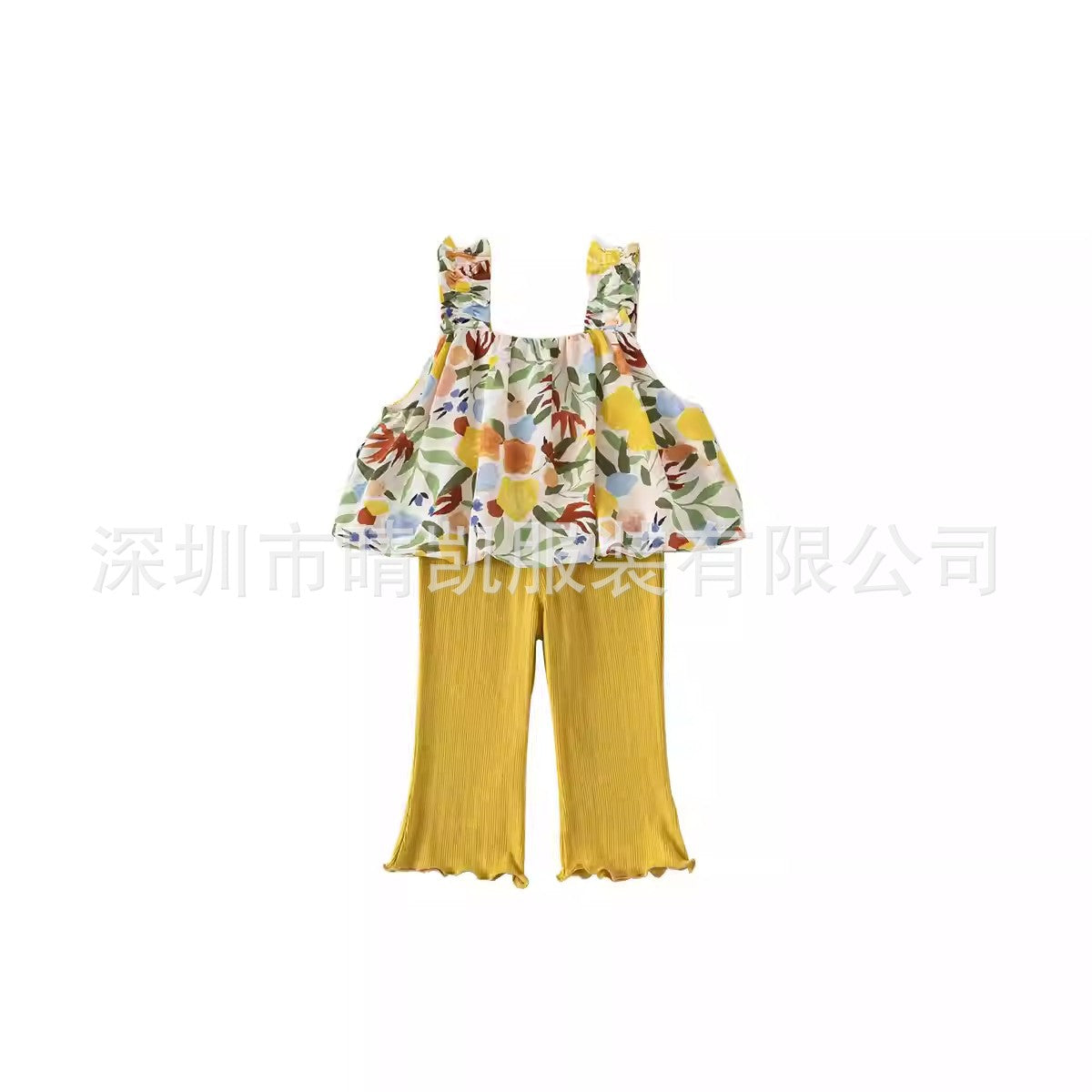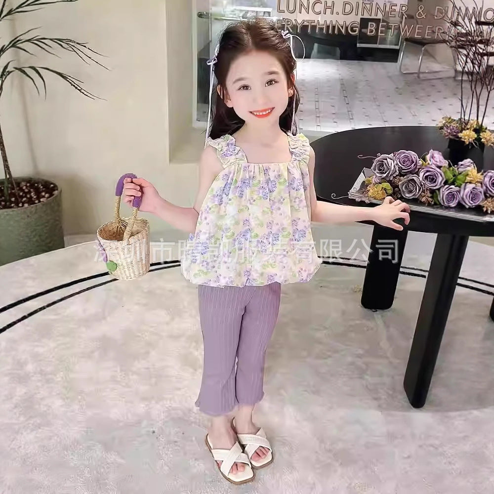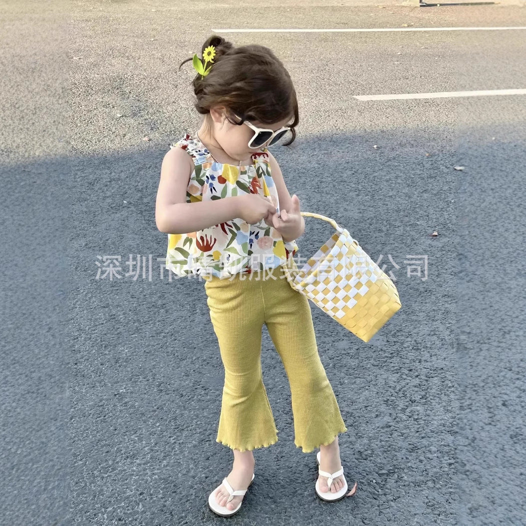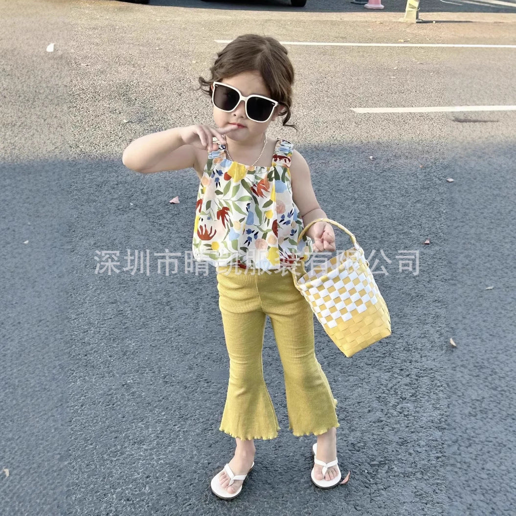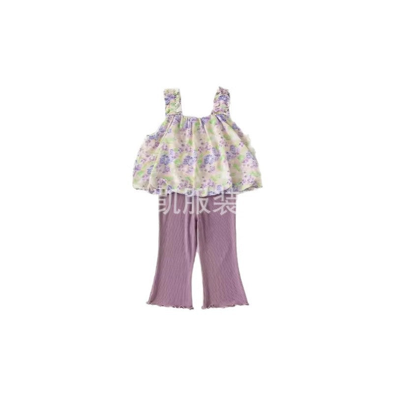 A25072304女童碎花吊帶套裝夏季女寶寶無袖背心喇叭褲兩件套