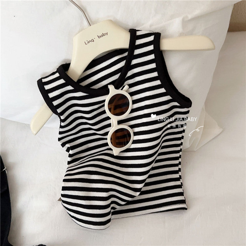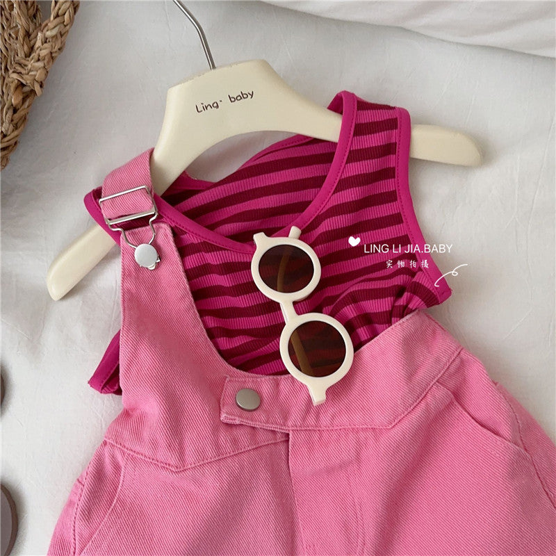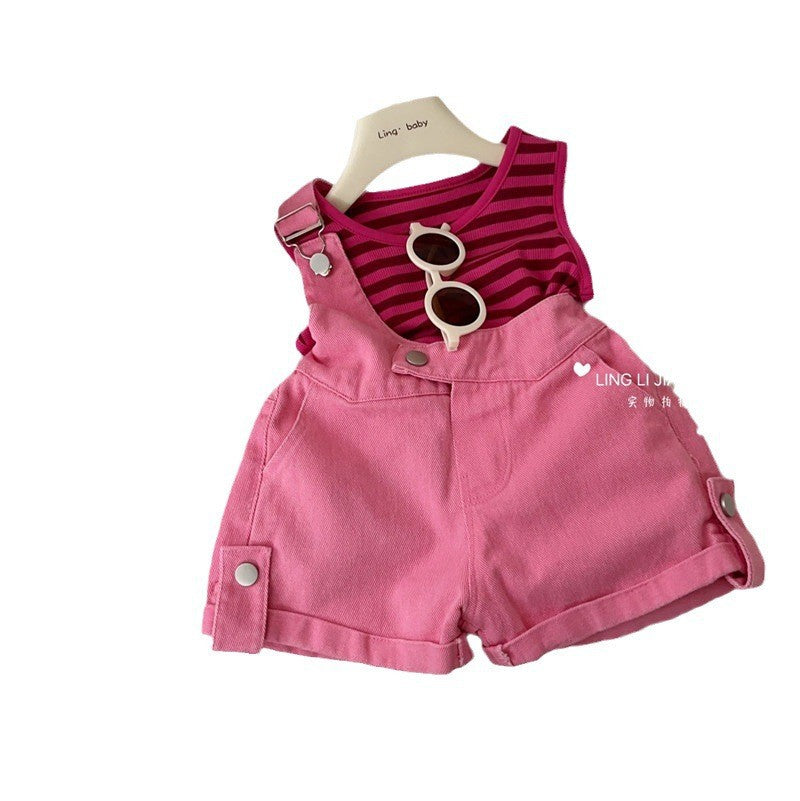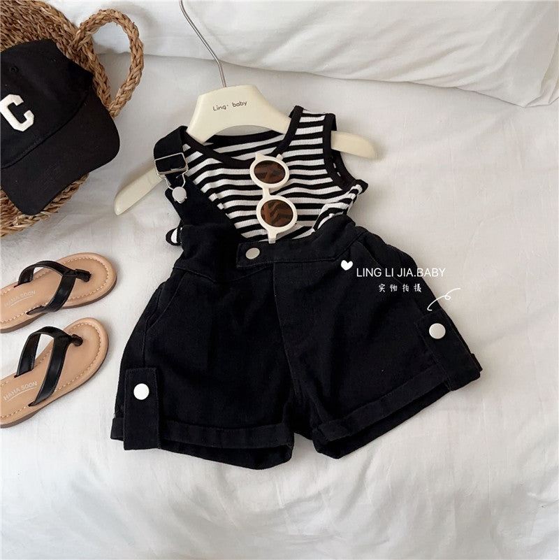 C24032405童星圓女童牛仔背帶褲套裝 新款兒童男孩夏裝條紋背心背帶褲兩件套