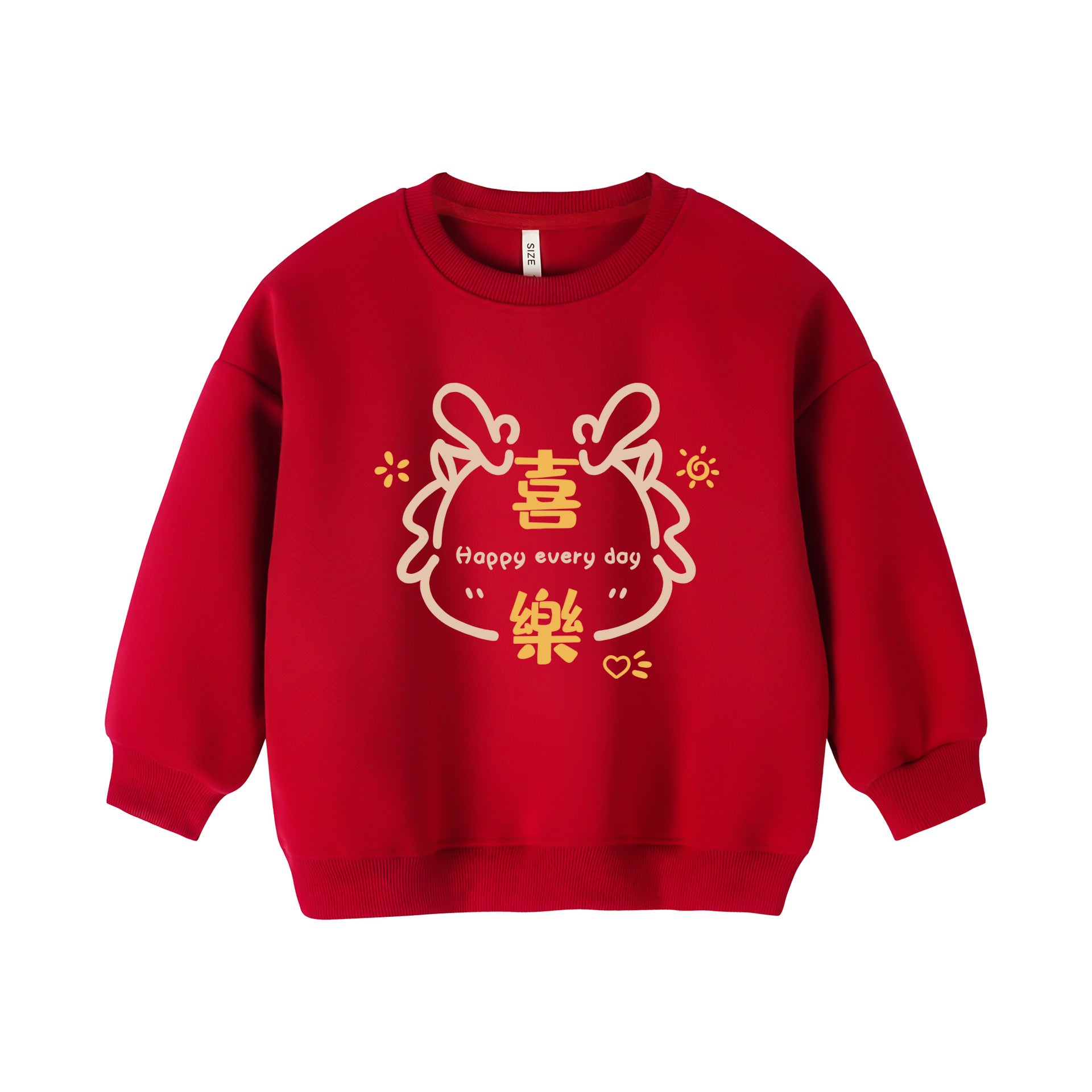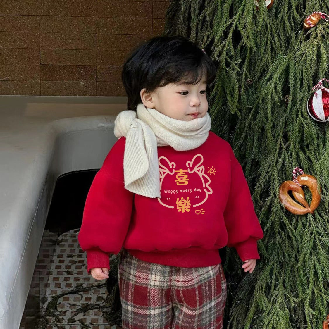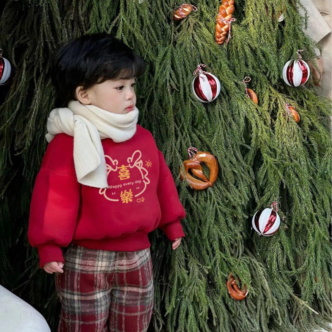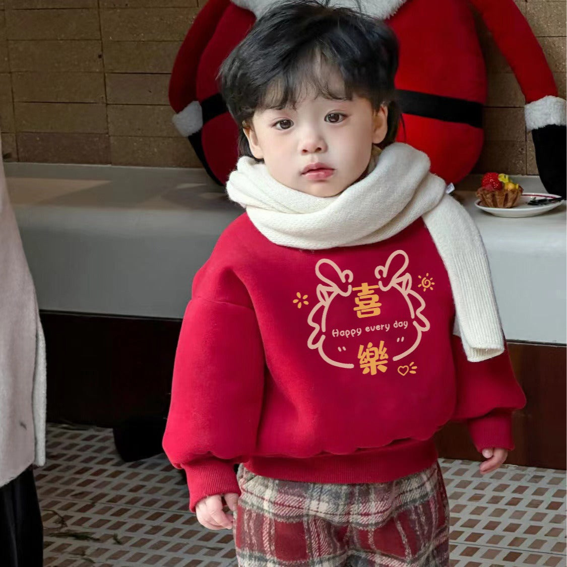 CA24011808紅色新年款喜慶男女童衛衣套裝加絨韓版冬裝保暖寶寶圓領絨衫上衣