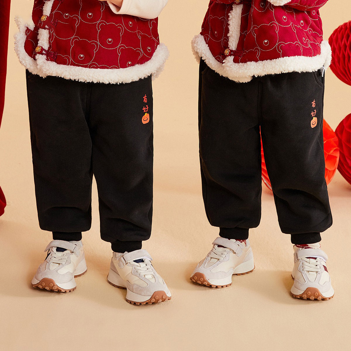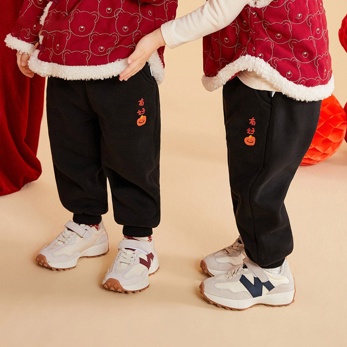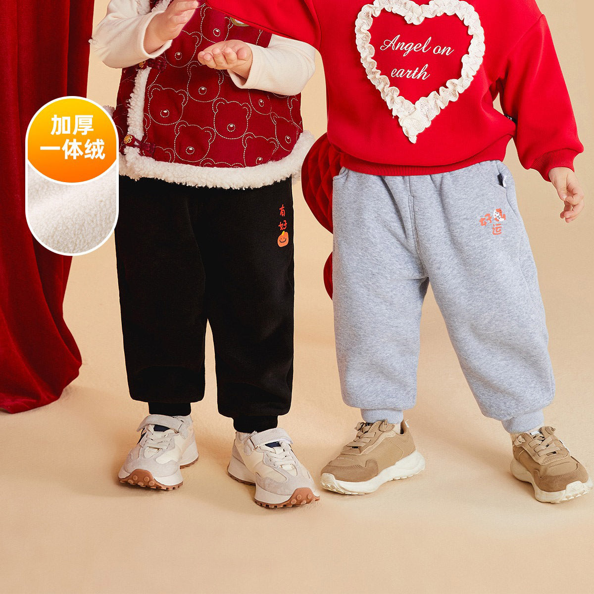 CA24011810兒童保暖褲子龍年拜年服男童加絨衛褲2023秋冬新款棉褲女童加厚褲