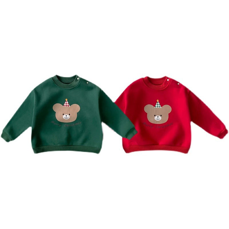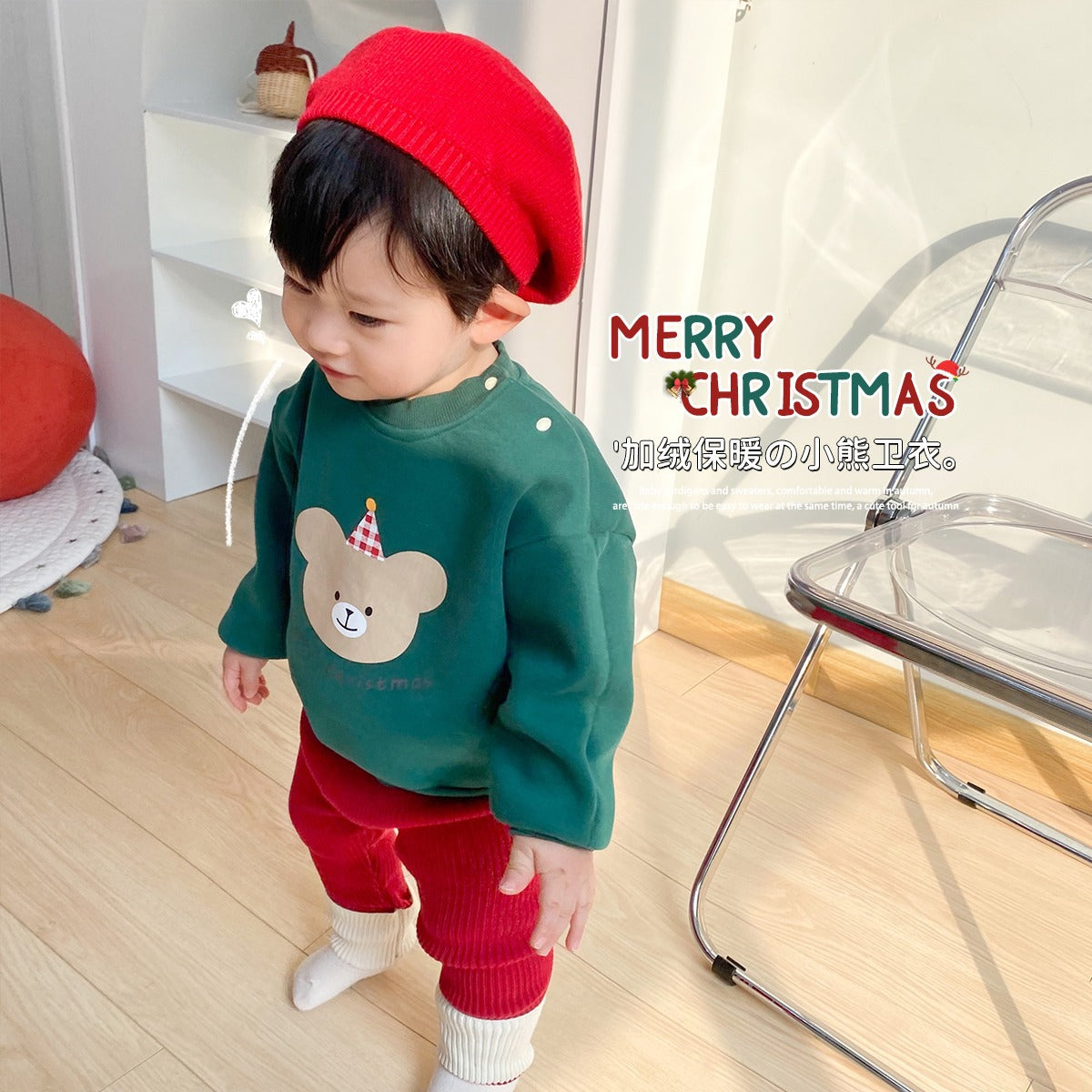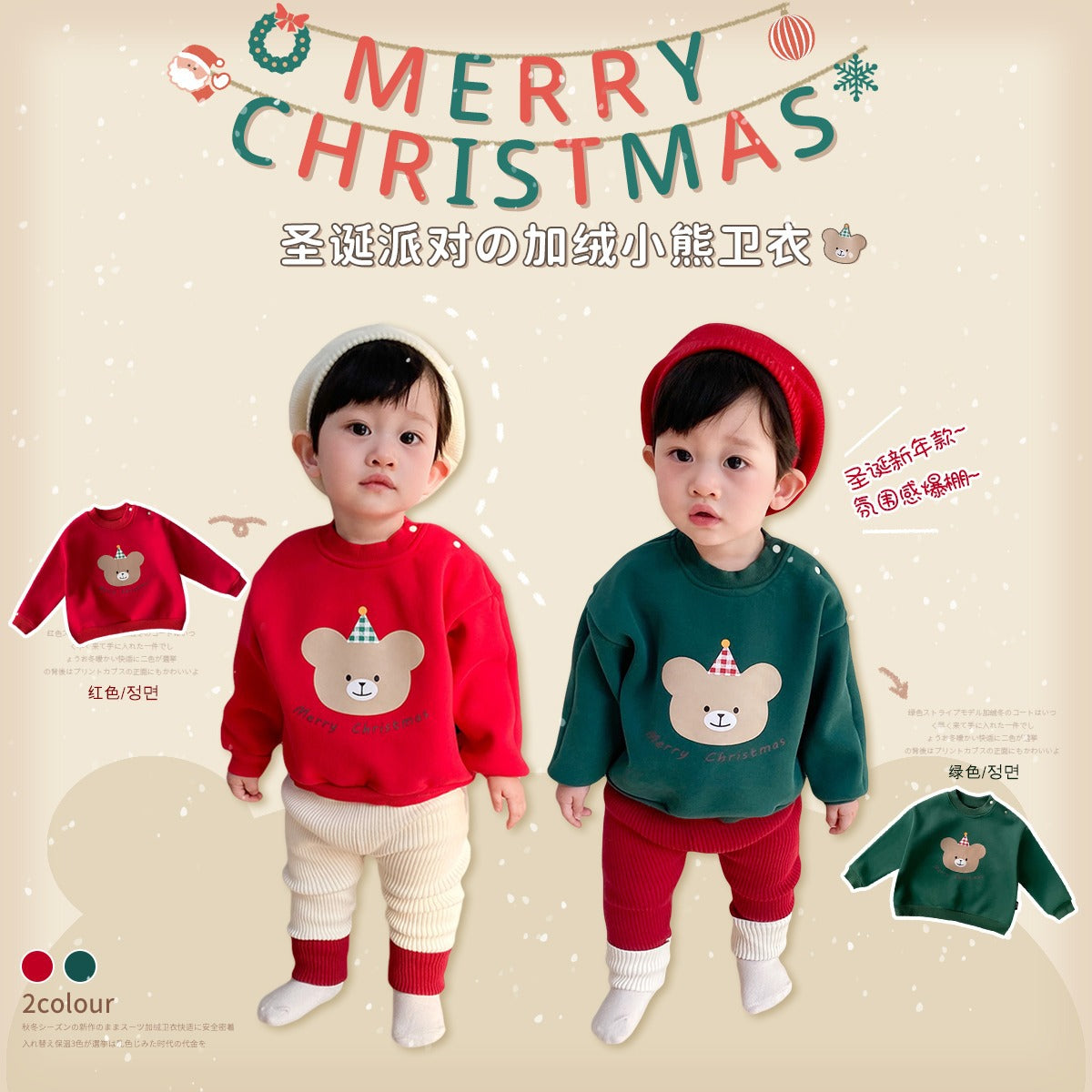 CA25112702一體絨寶寶聖誕新年上衣可愛卡通小熊秋冬季寶寶加絨保暖套頭衛衣