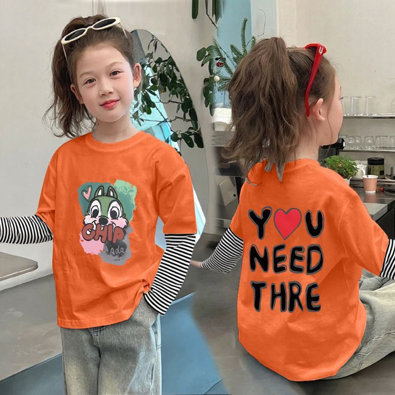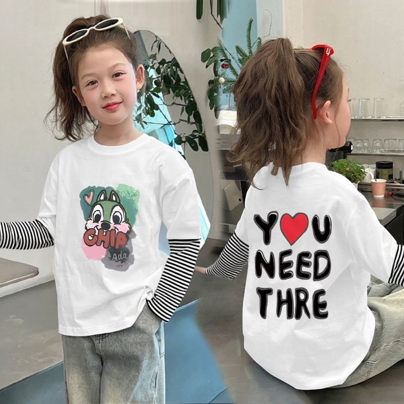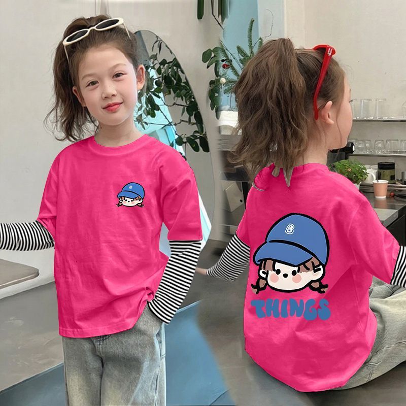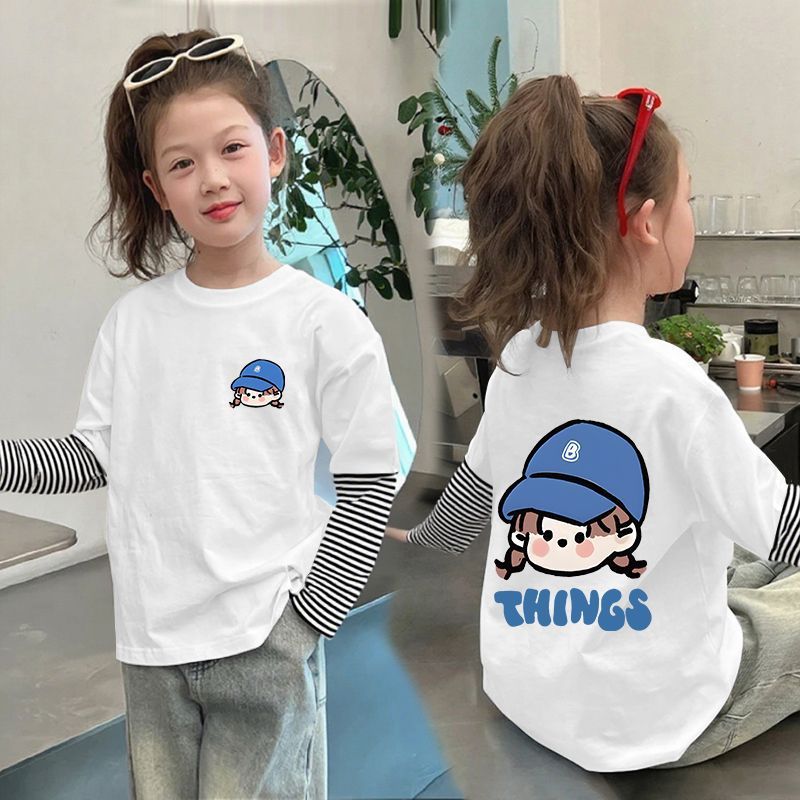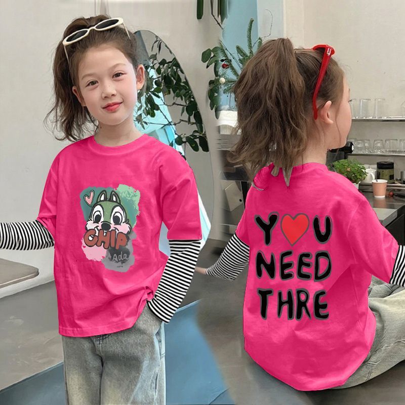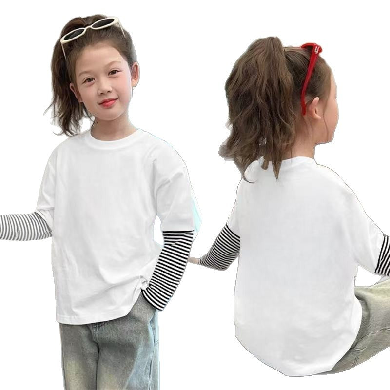CE25091902女童純棉長袖T恤兒童假兩件條紋上衣春秋裝新款小孩洋氣打底衫