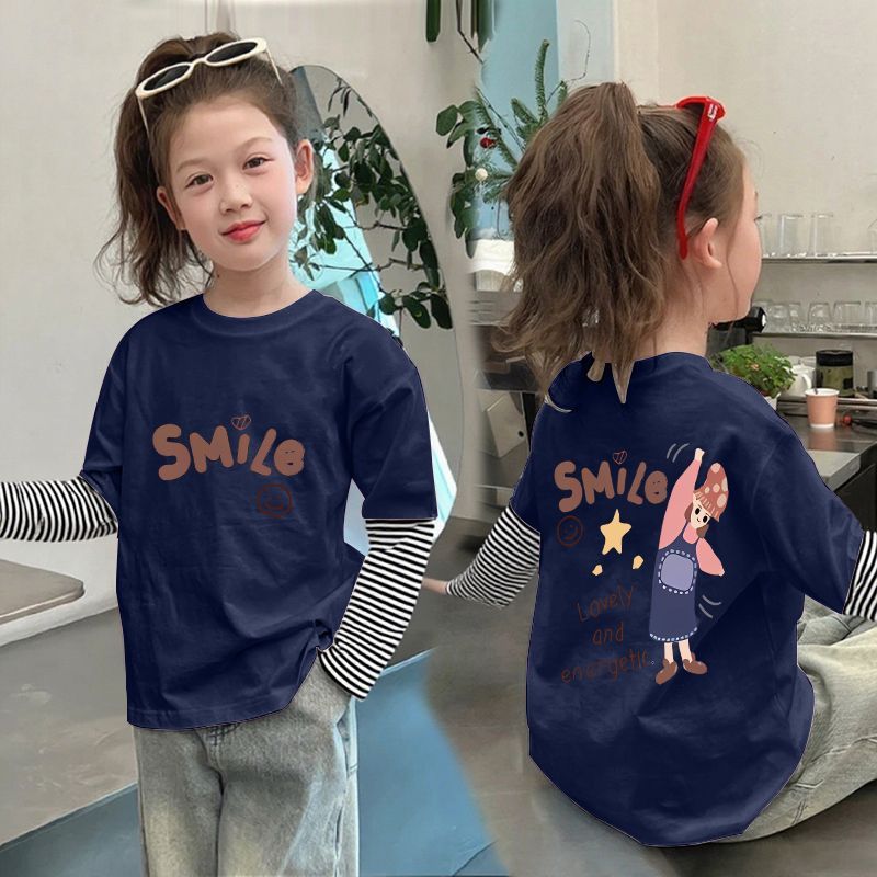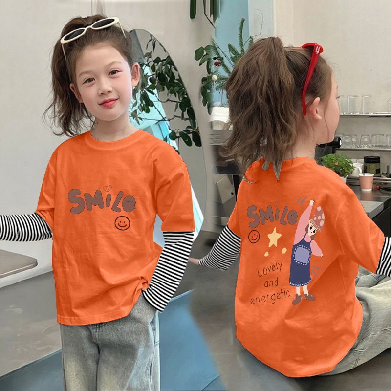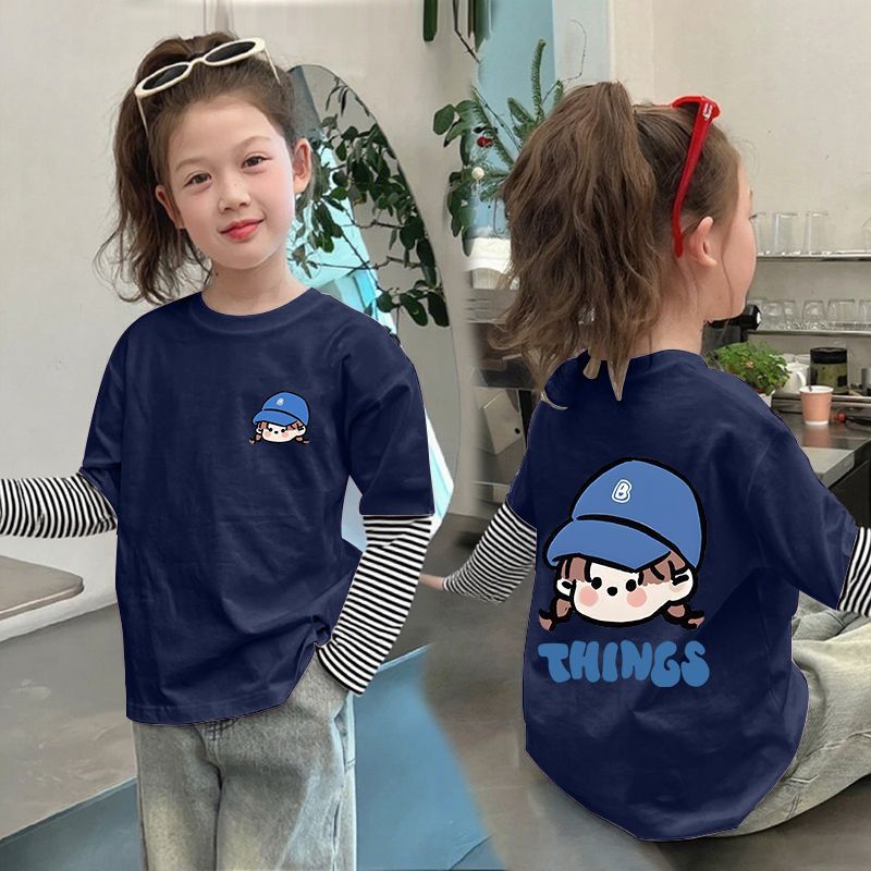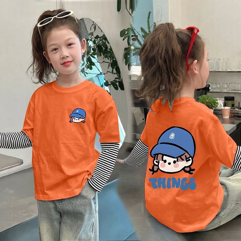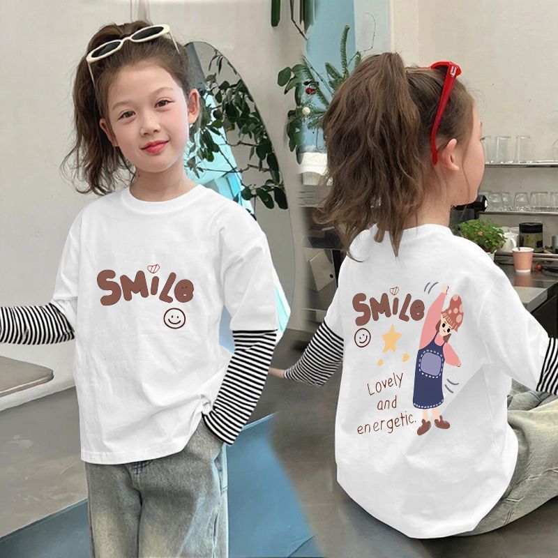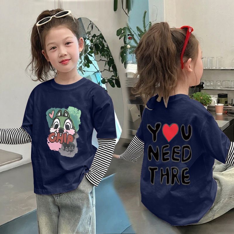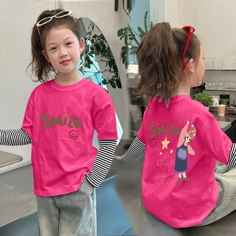 CE25091902女童純棉長袖T恤兒童假兩件條紋上衣春秋裝新款小孩洋氣打底衫