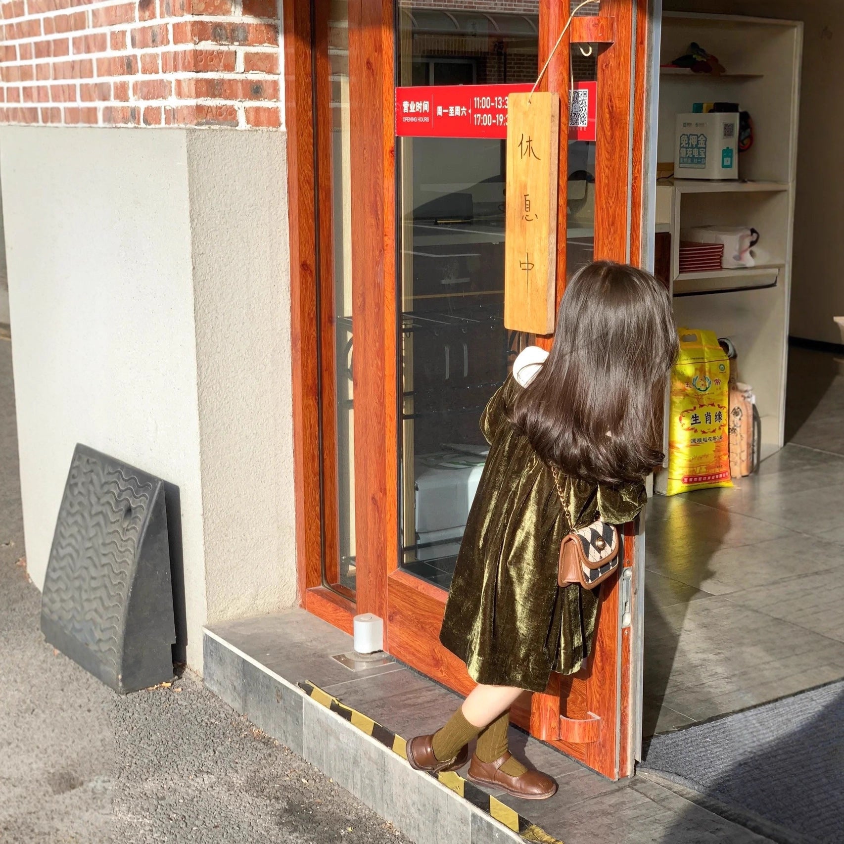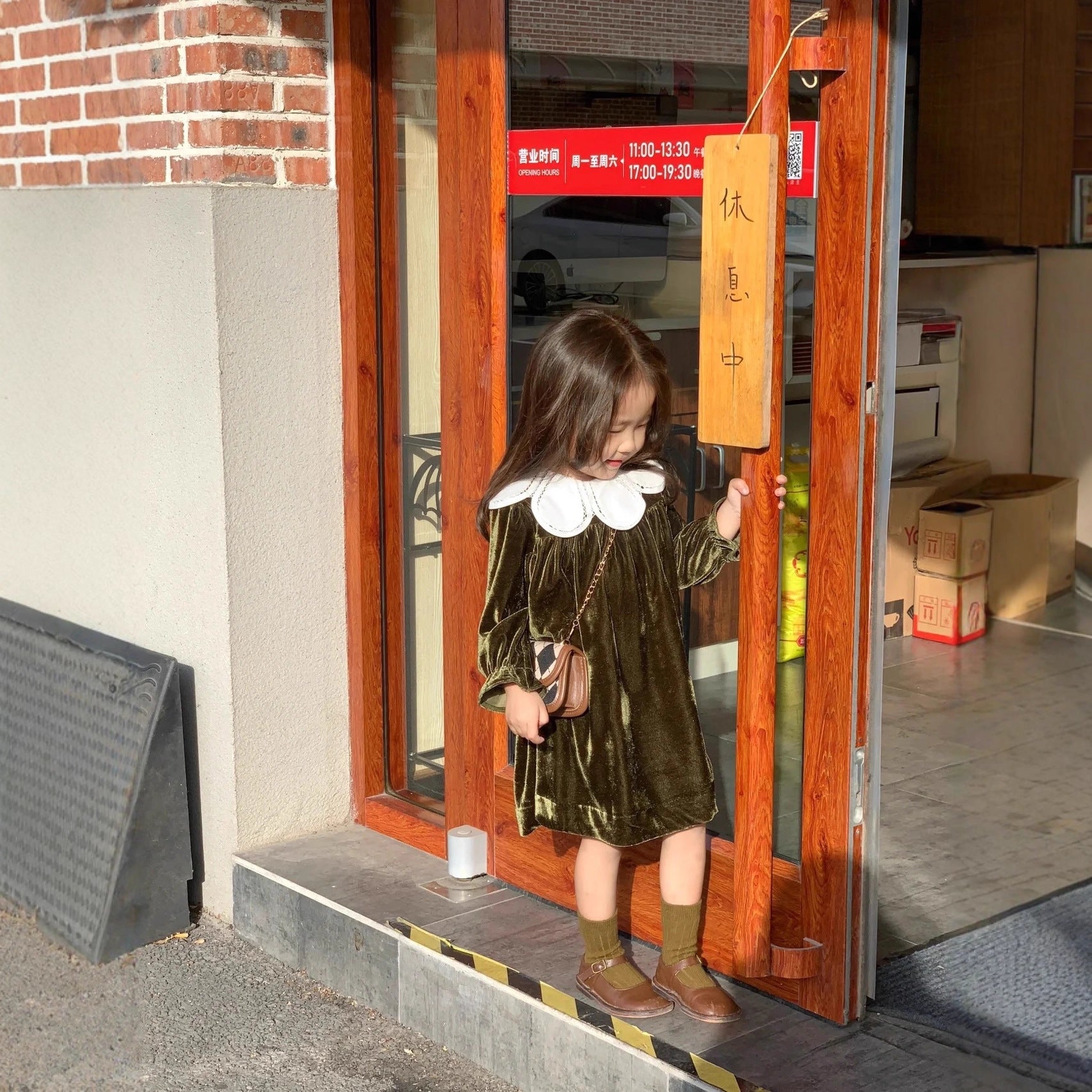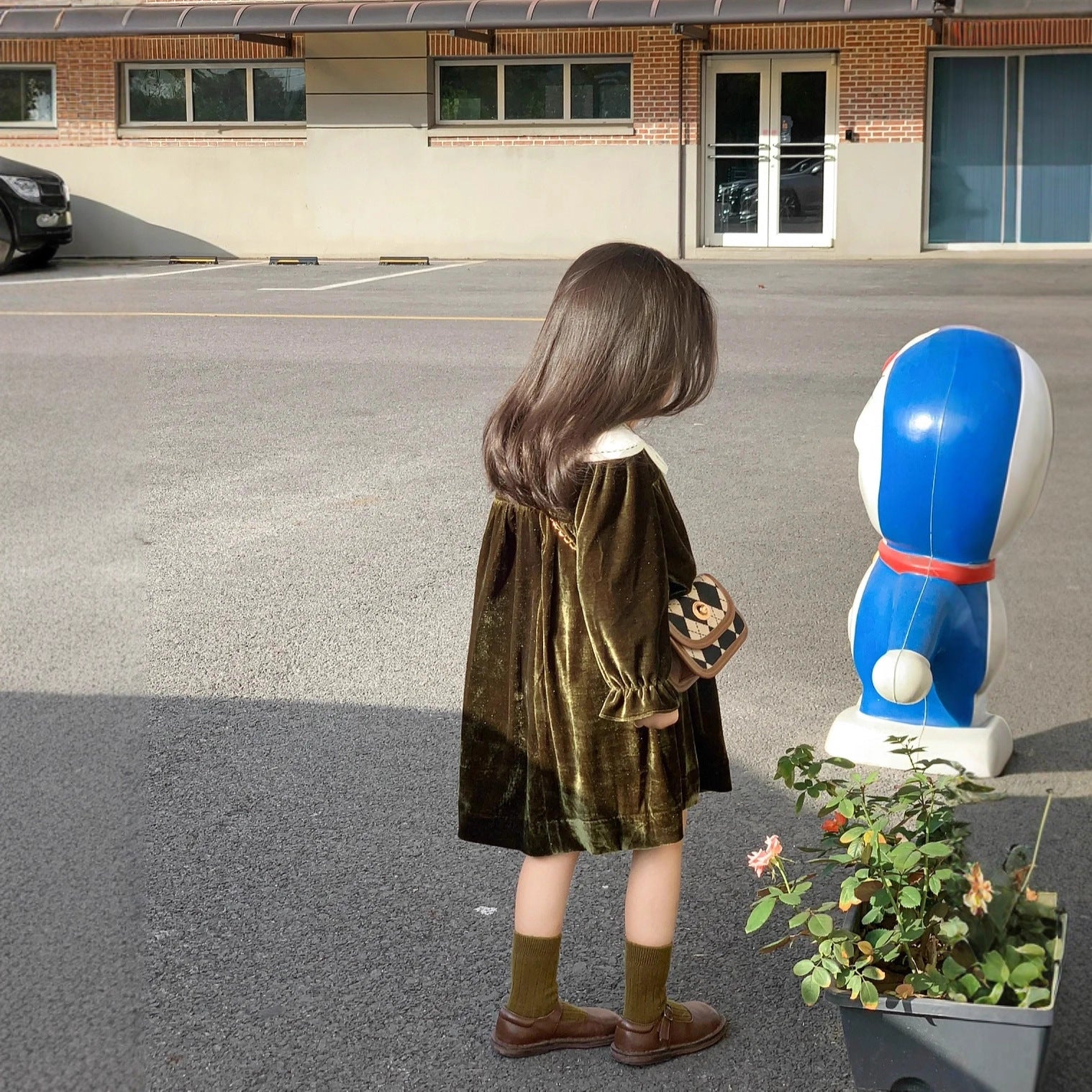 CG25103001韓國童裝女童秋款復古公主領墨綠金絲絨公主裙