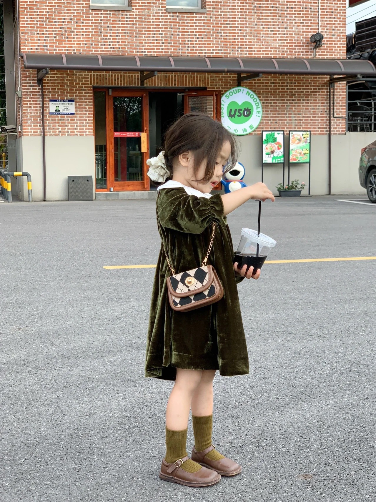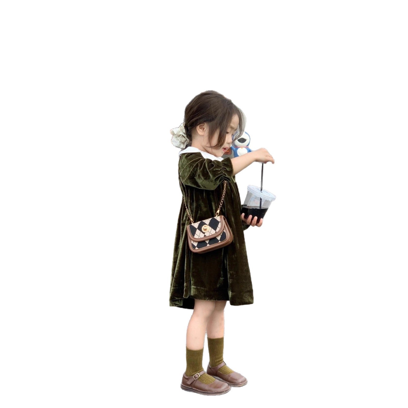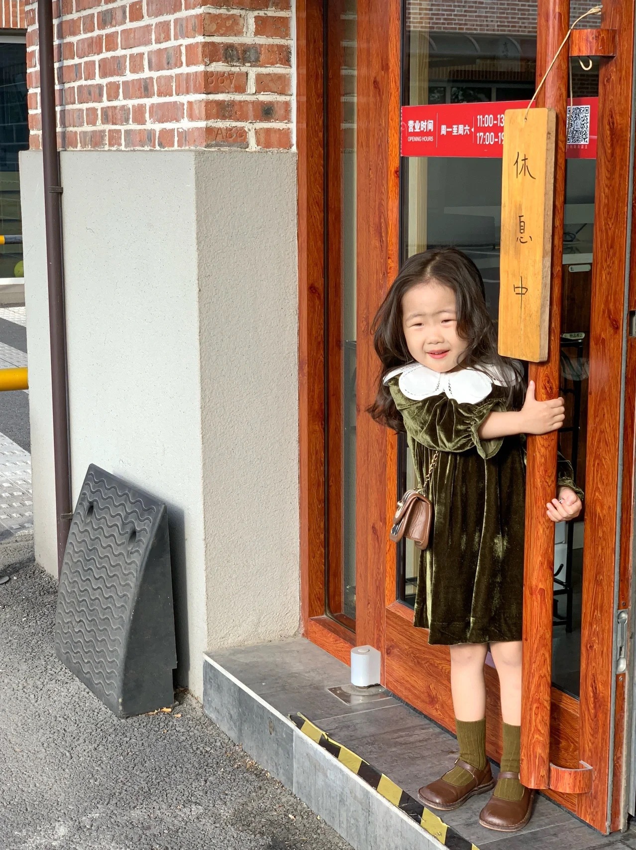 CG25103001韓國童裝女童秋款復古公主領墨綠金絲絨公主裙