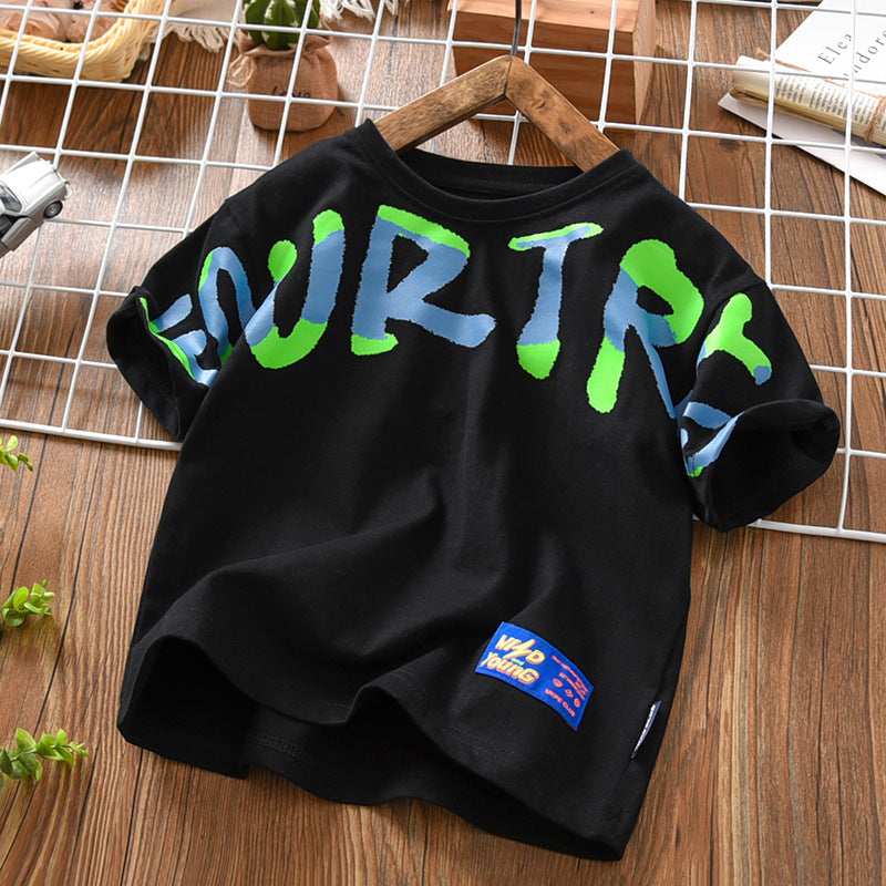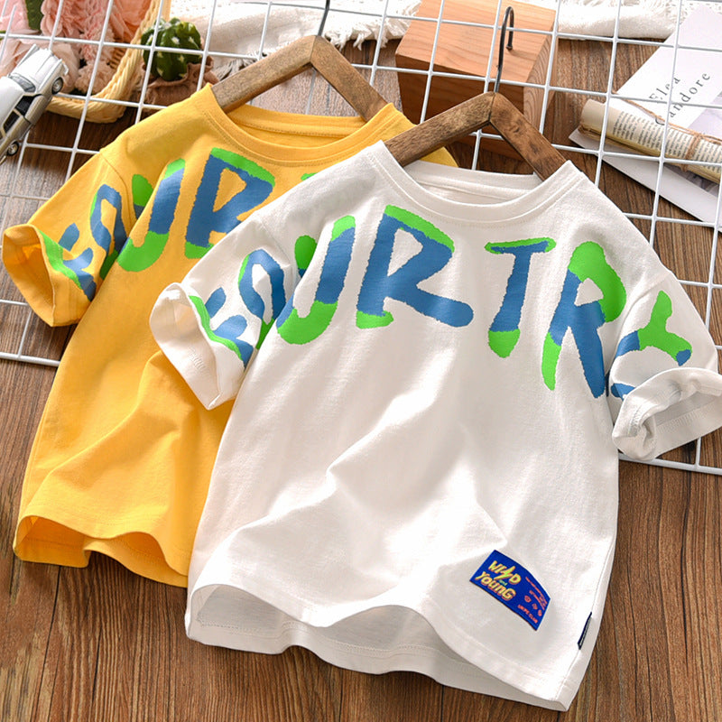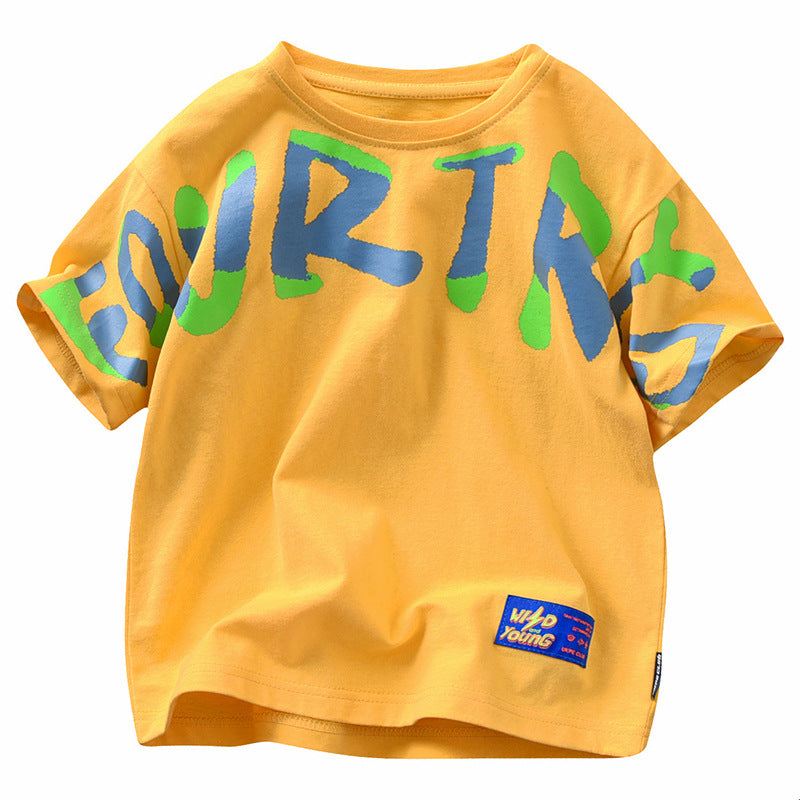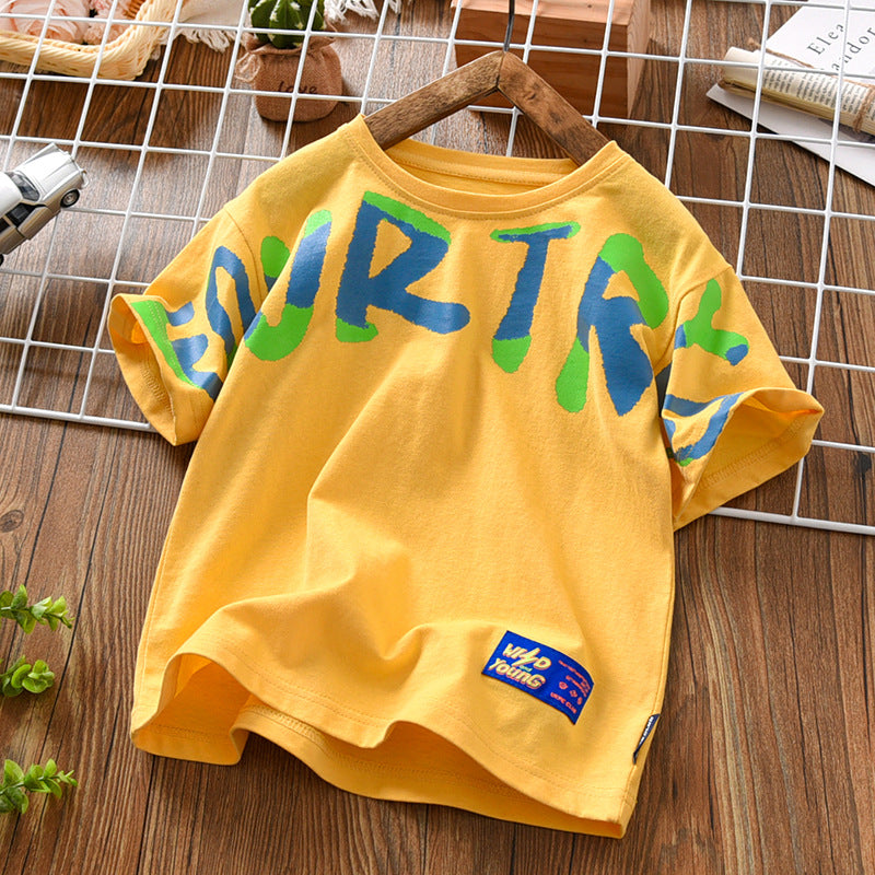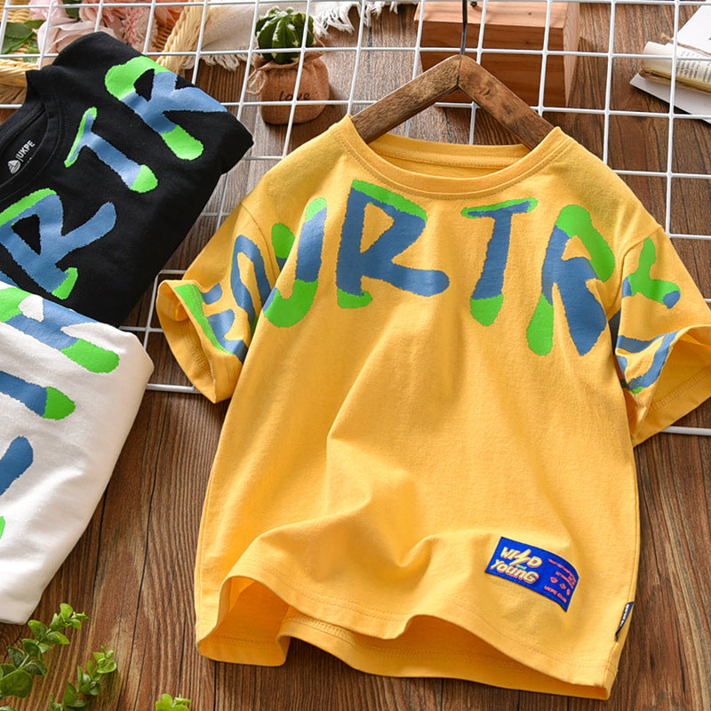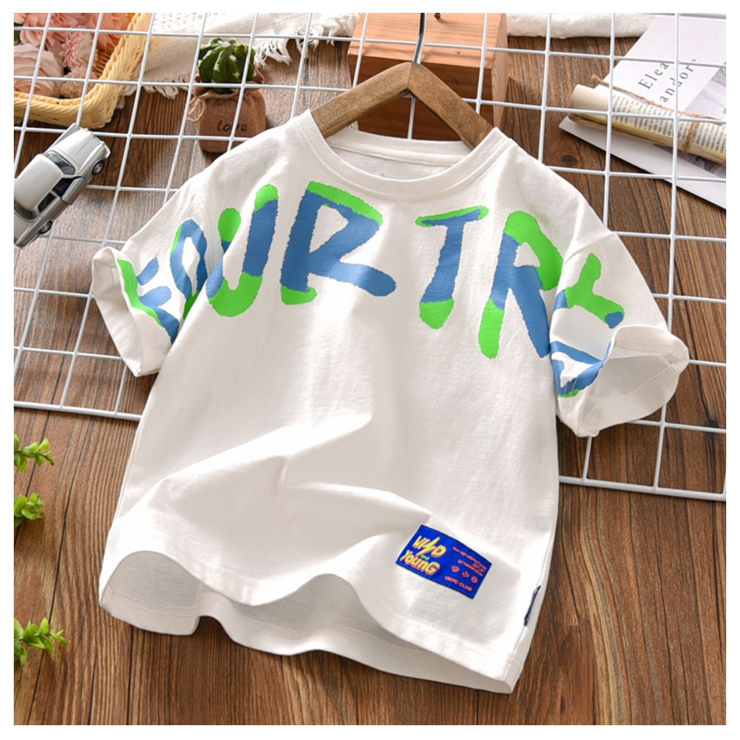 FB24070107男童印花短袖T卹2024夏季新款韓版兒童條紋半袖體恤中大童上衣潮