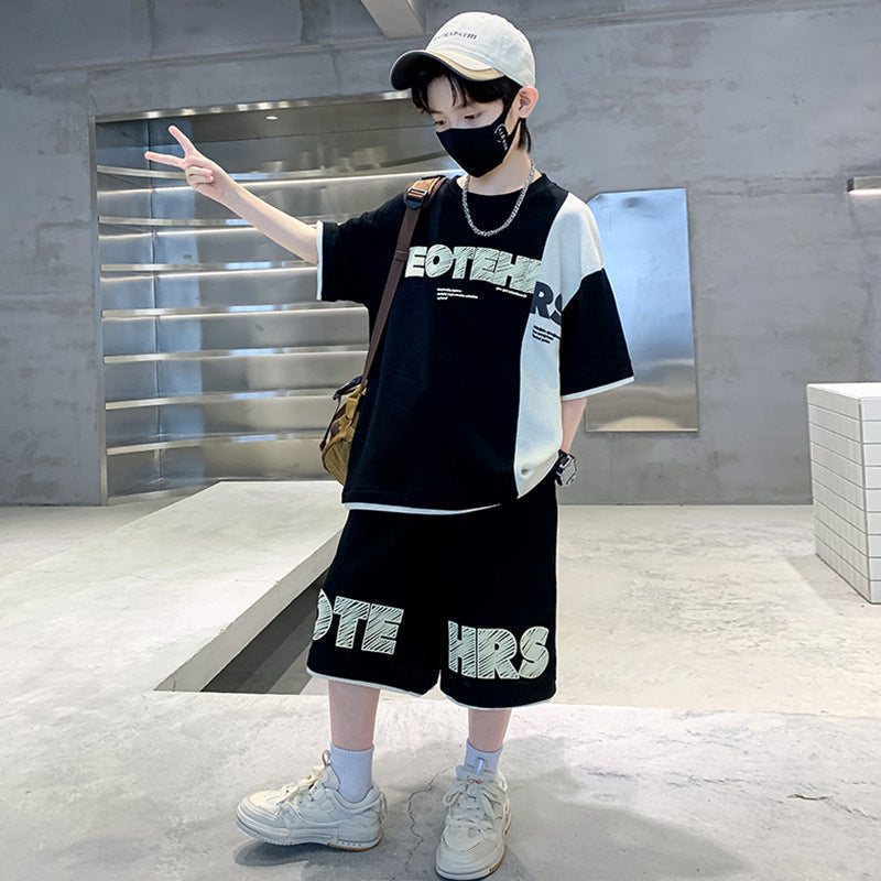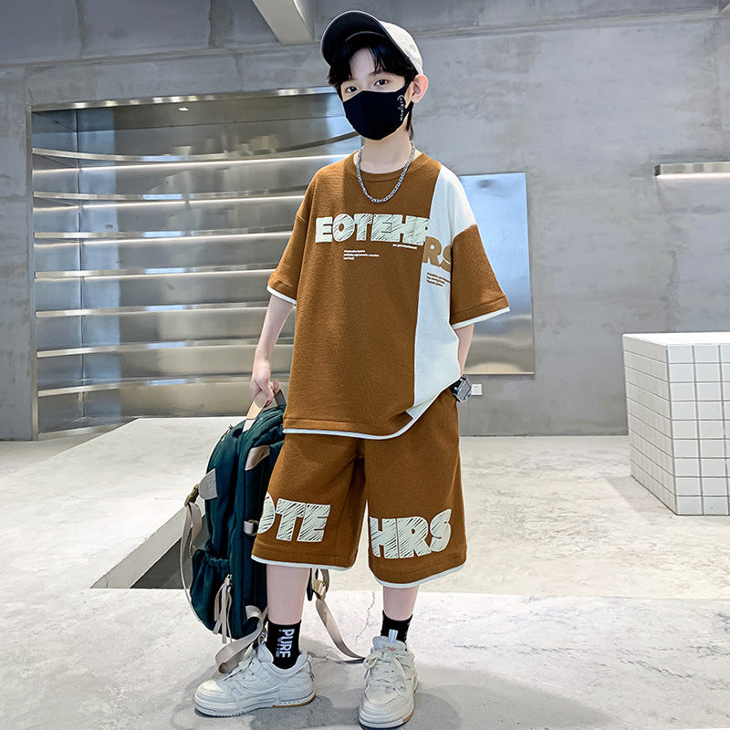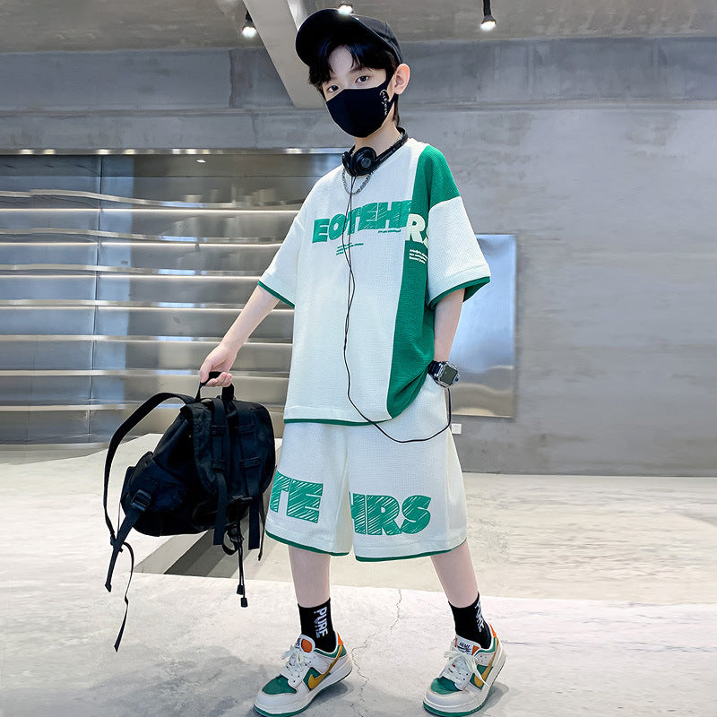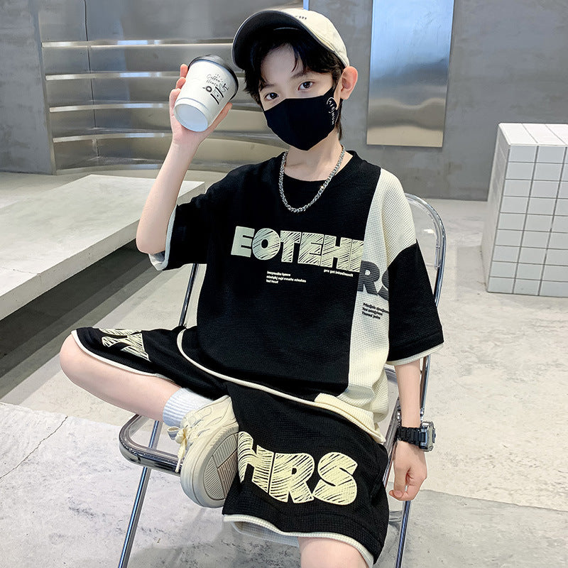 FC24040716男童夏裝短袖套裝2024新款洋氣中大童男孩夏季洋氣華夫格裁剪童裝(9-12天到貨)
