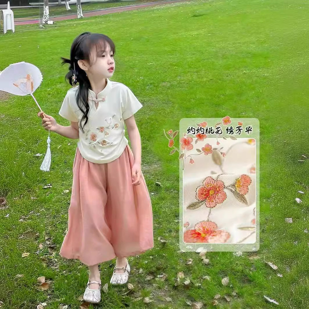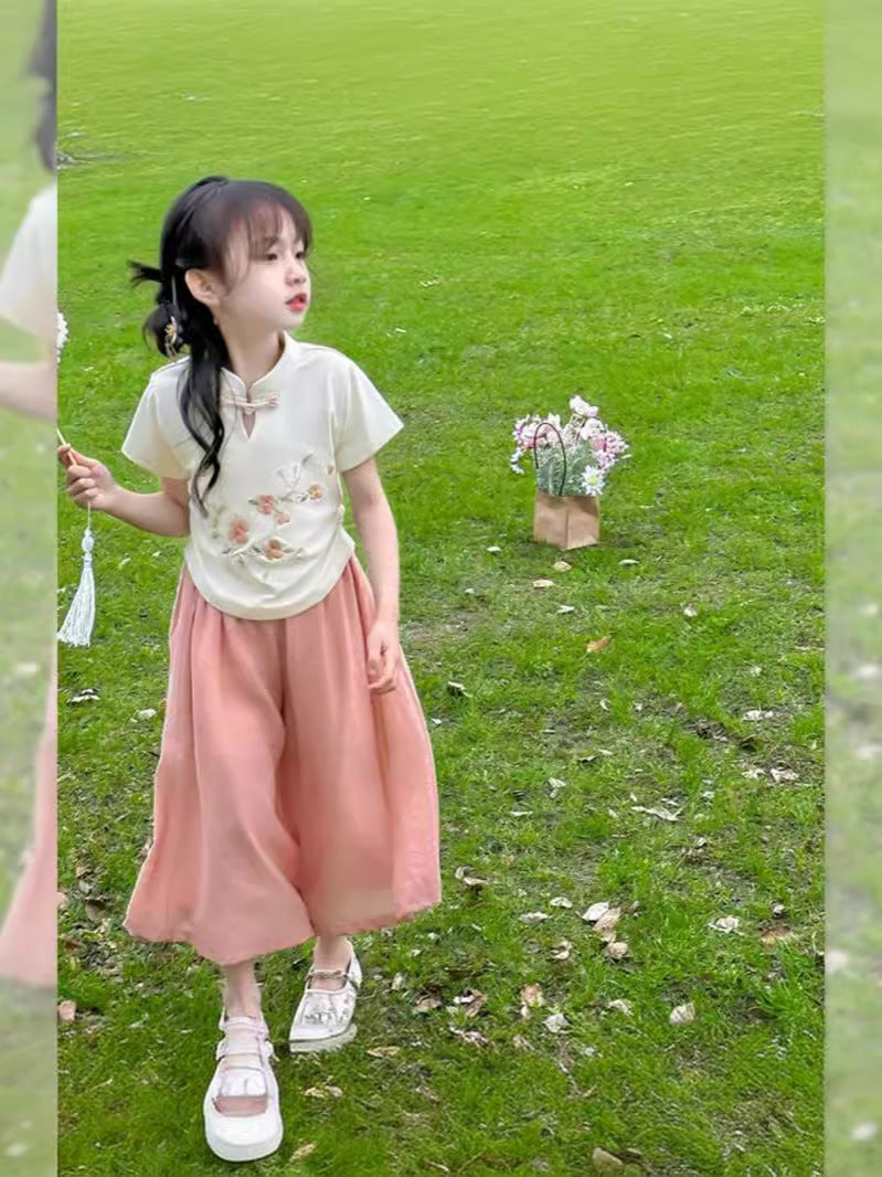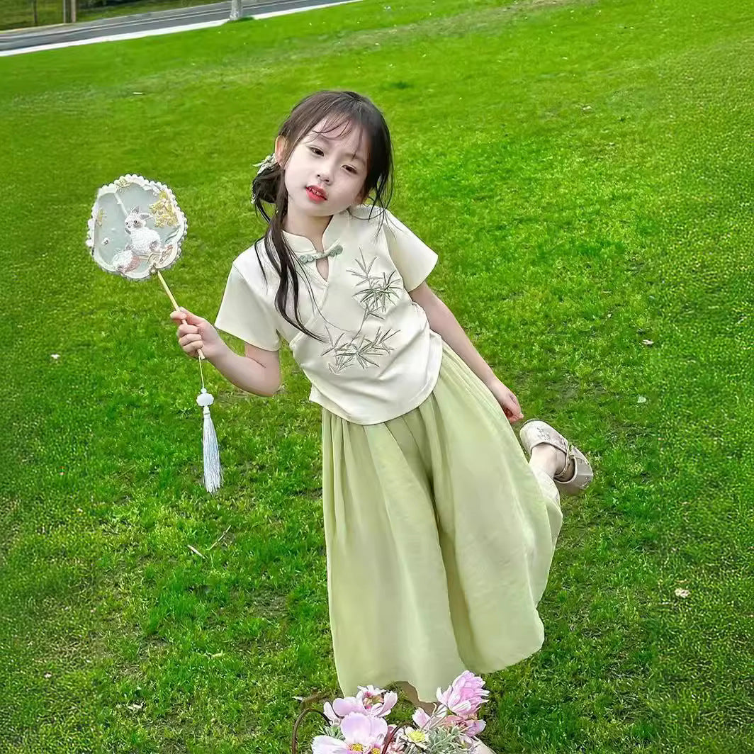 FD24081104女童新款中式闊腿褲短袖套裝兒童盤扣夏裝2024新款國風女孩衣服夏季