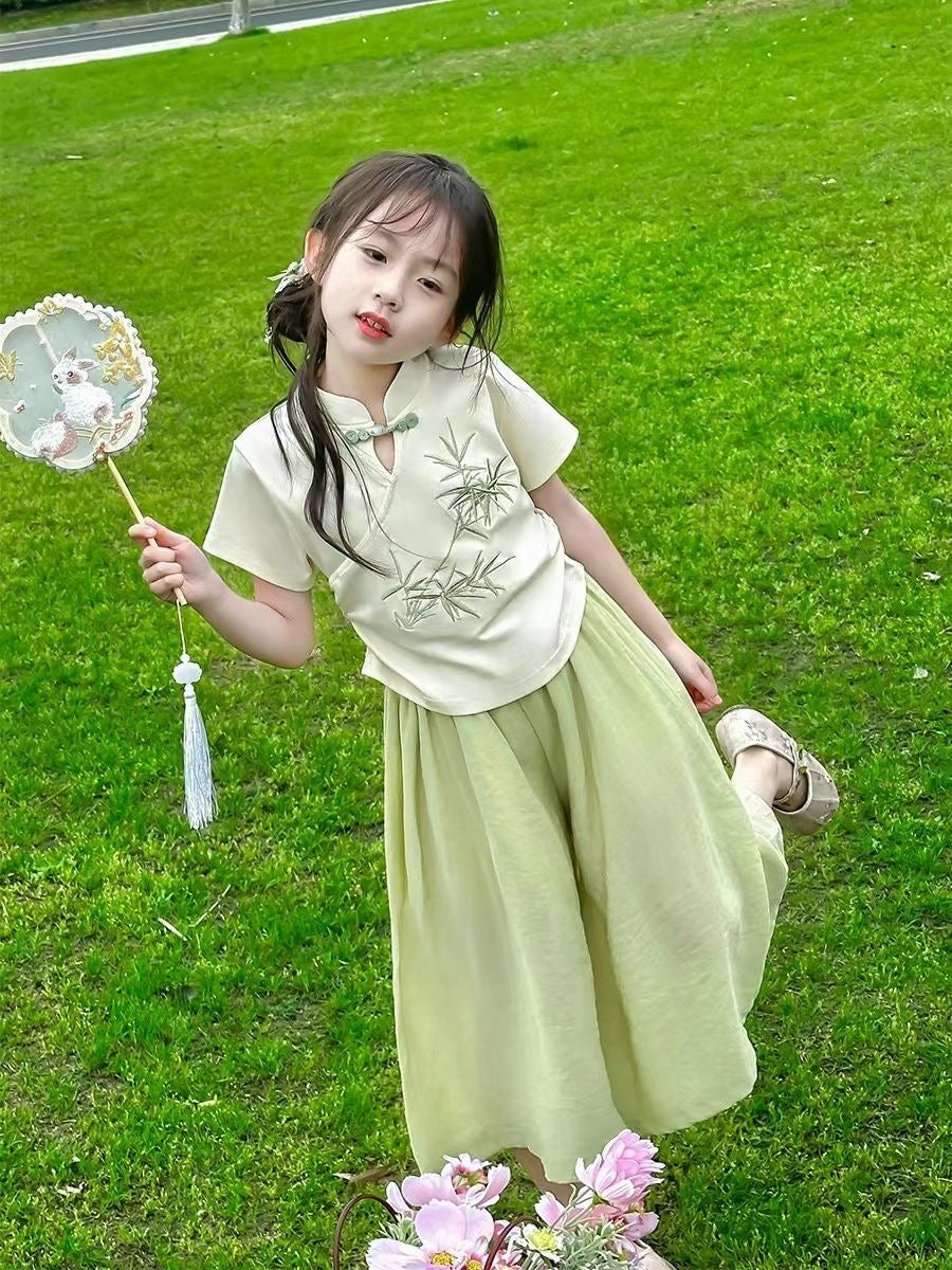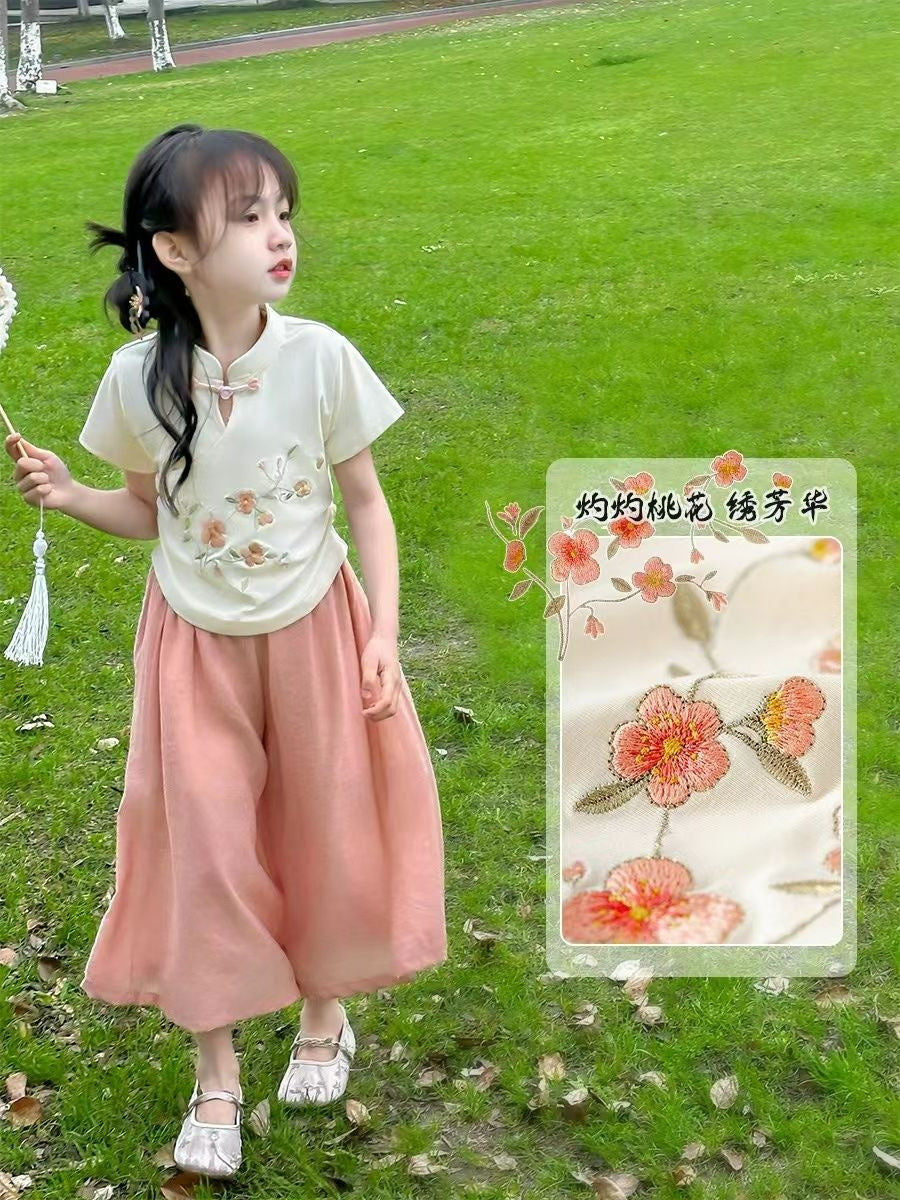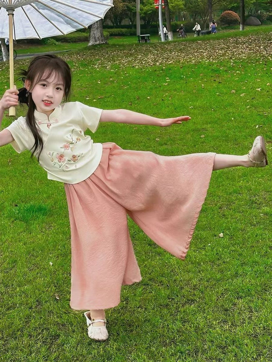FD24081104女童新款中式闊腿褲短袖套裝兒童盤扣夏裝2024新款國風女孩衣服夏季