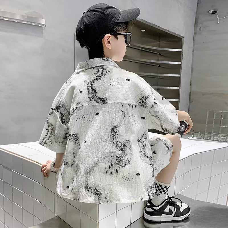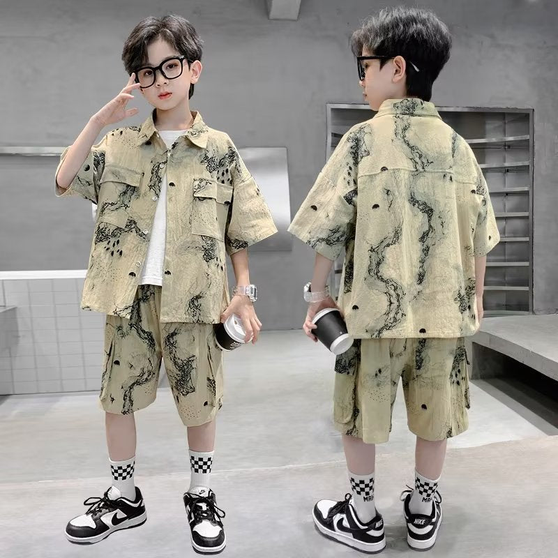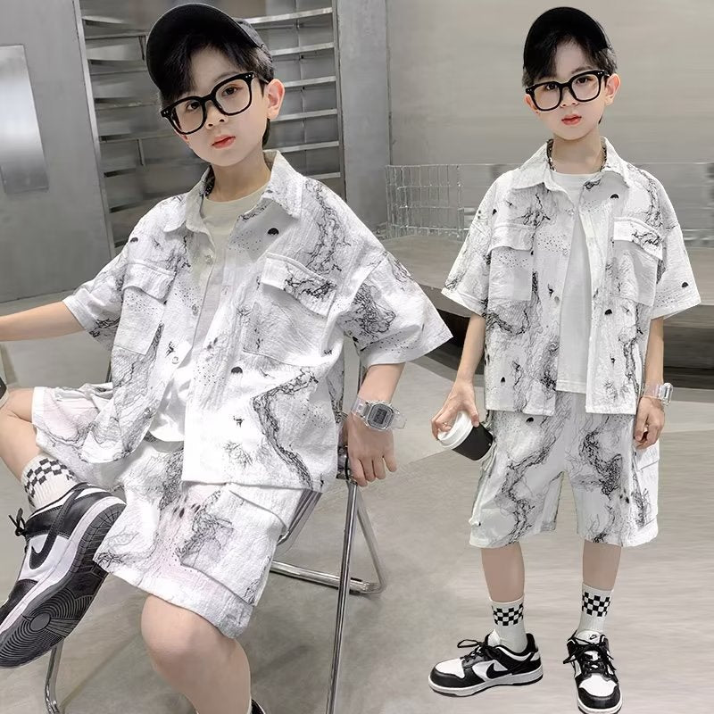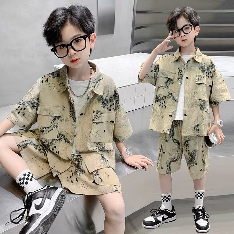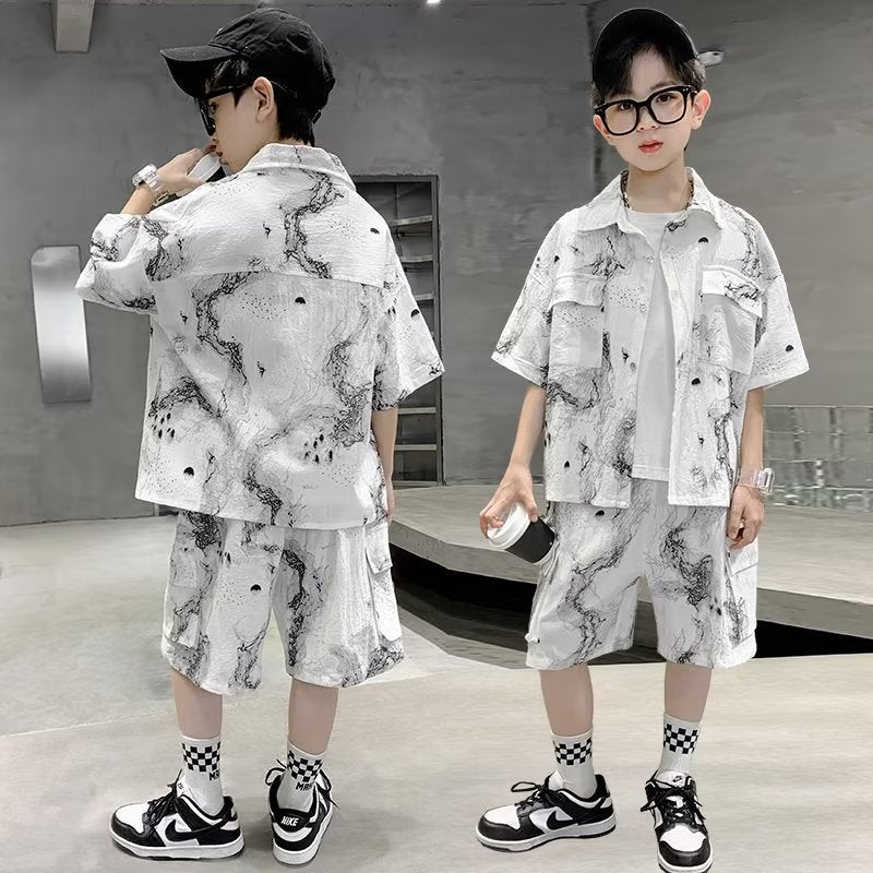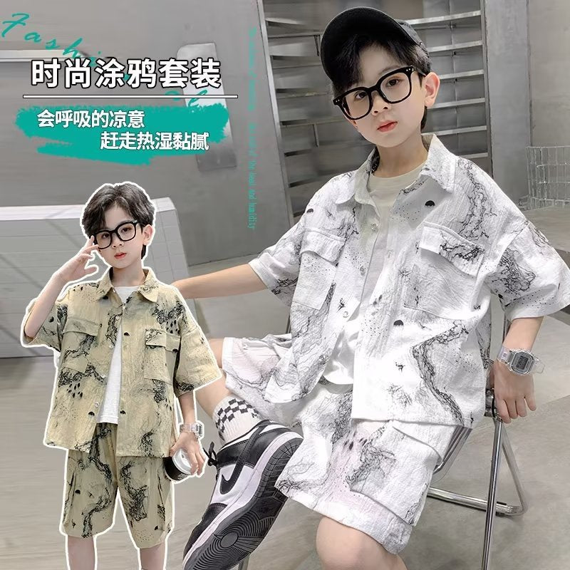 FD24081107男童夏季套裝2023新款網紅洋氣短袖襯衫短褲兩件式中大童度假套裝