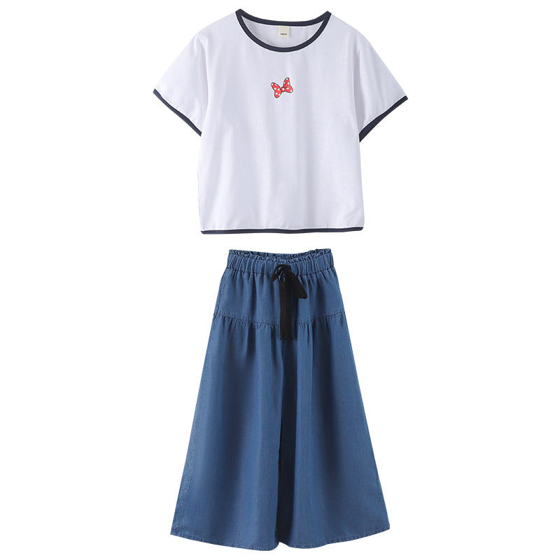 FE24070103女童夏裝套裝2024新款韓版兒童裝洋氣中大童短袖牛仔闊腿褲兩件套(9-12天到貨)
