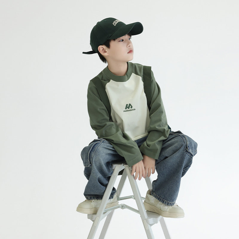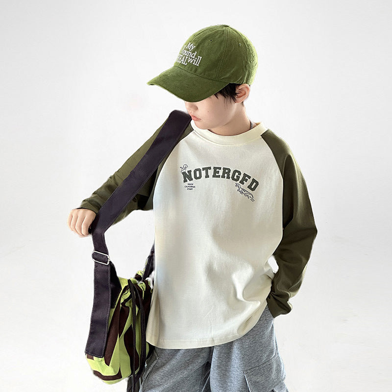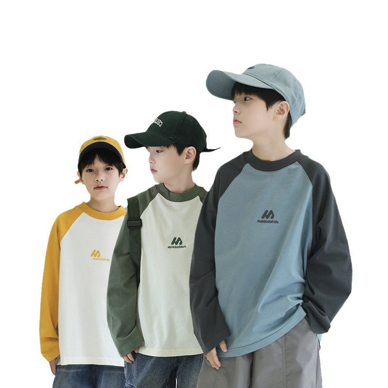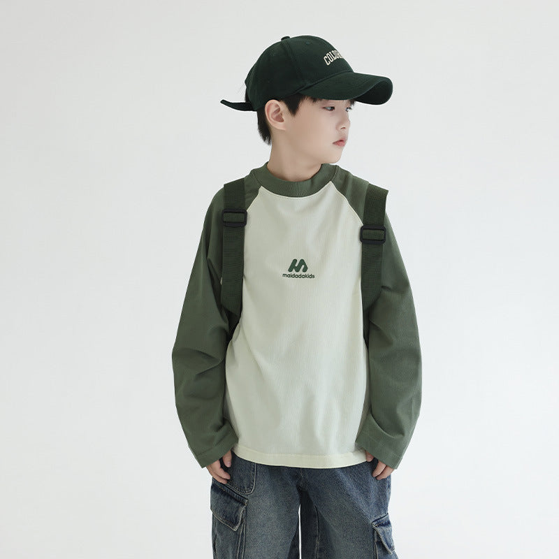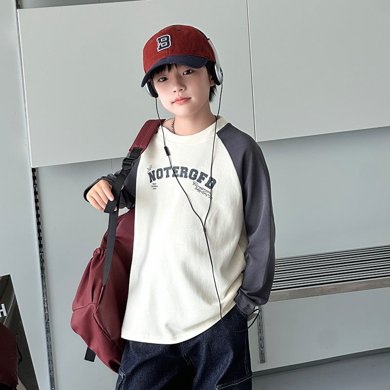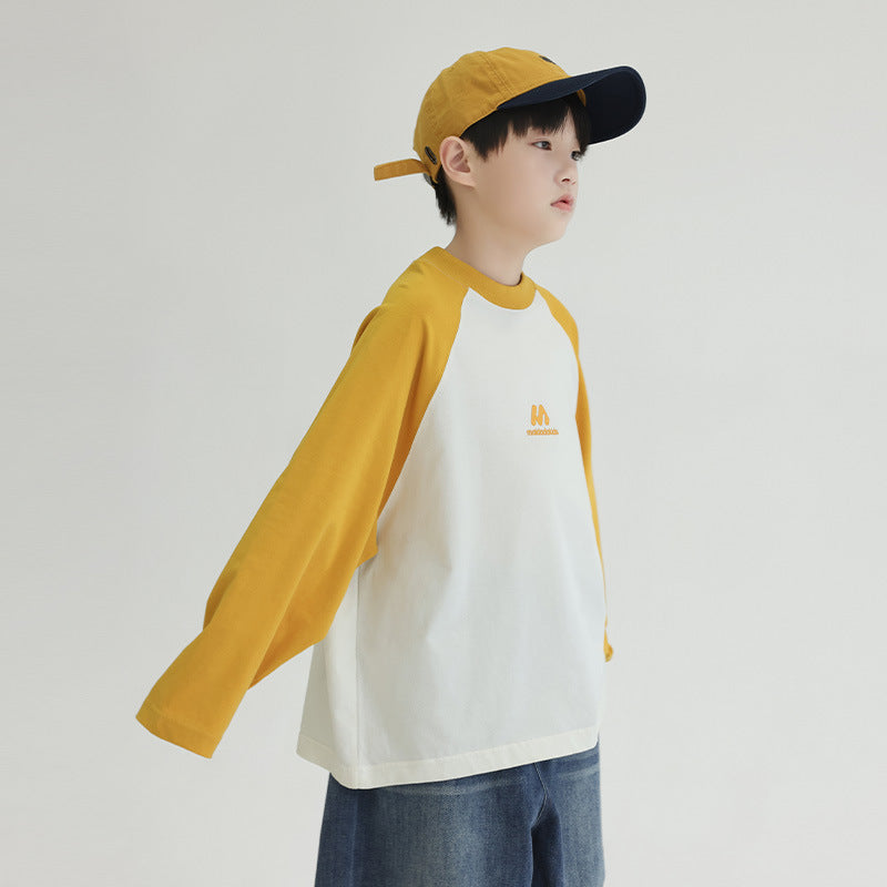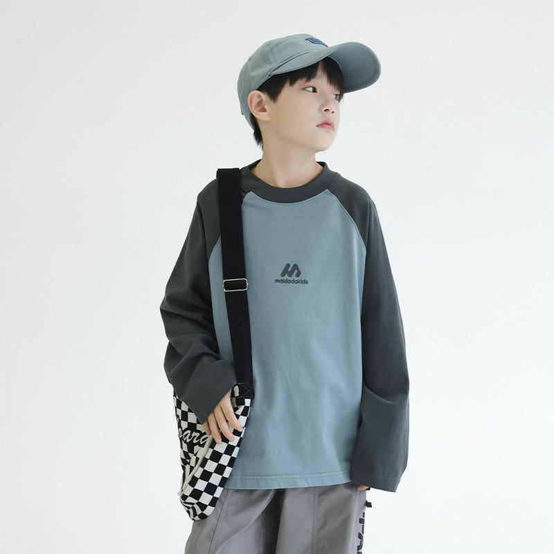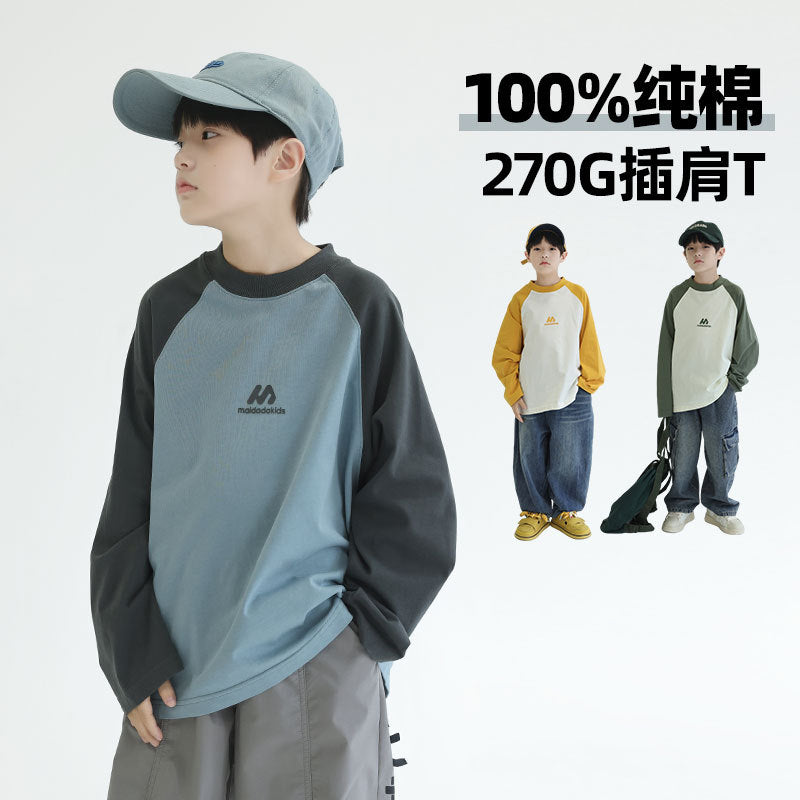 FF24102504新款秋裝男童上衣重磅打底衫拼色插肩袖兒童長袖t恤全棉(9-12天到貨)