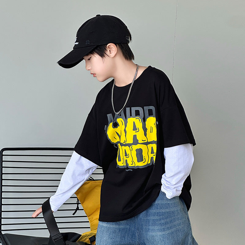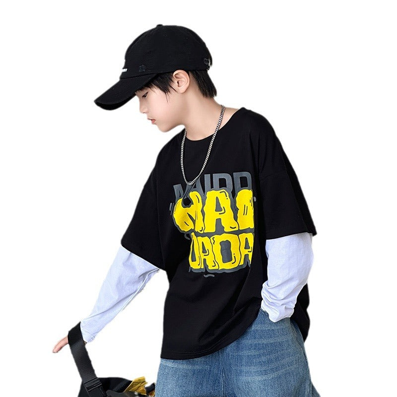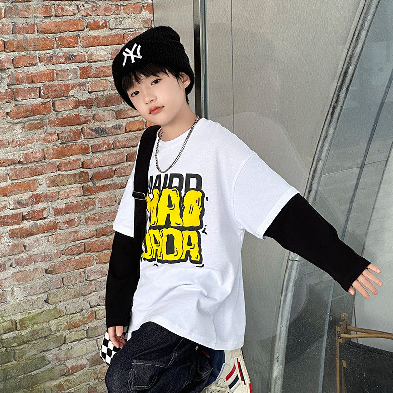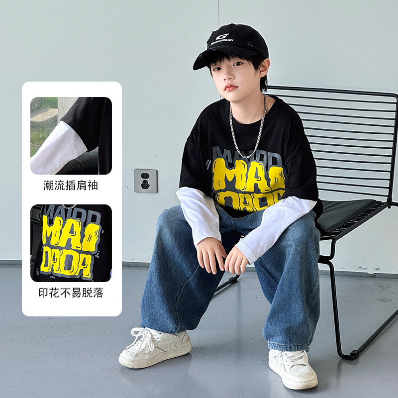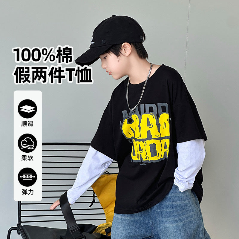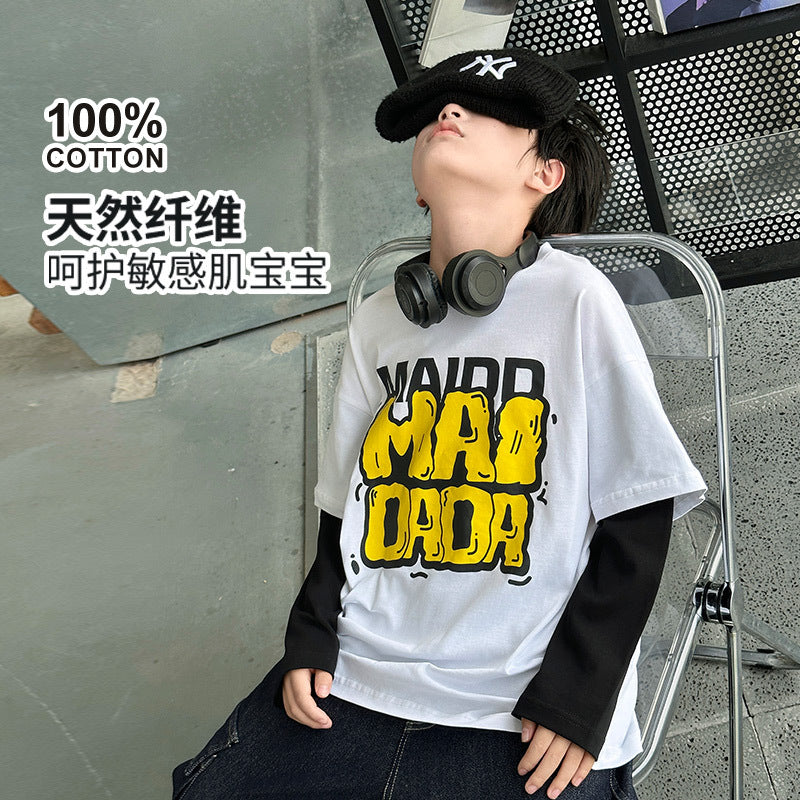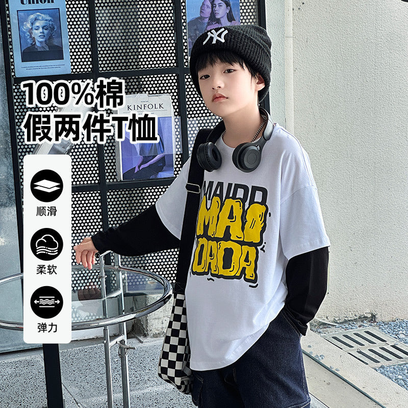 FF24102510新品創意袖假兩件兒童秋裝純棉上衣童裝男童長袖t恤(9-12天到貨)