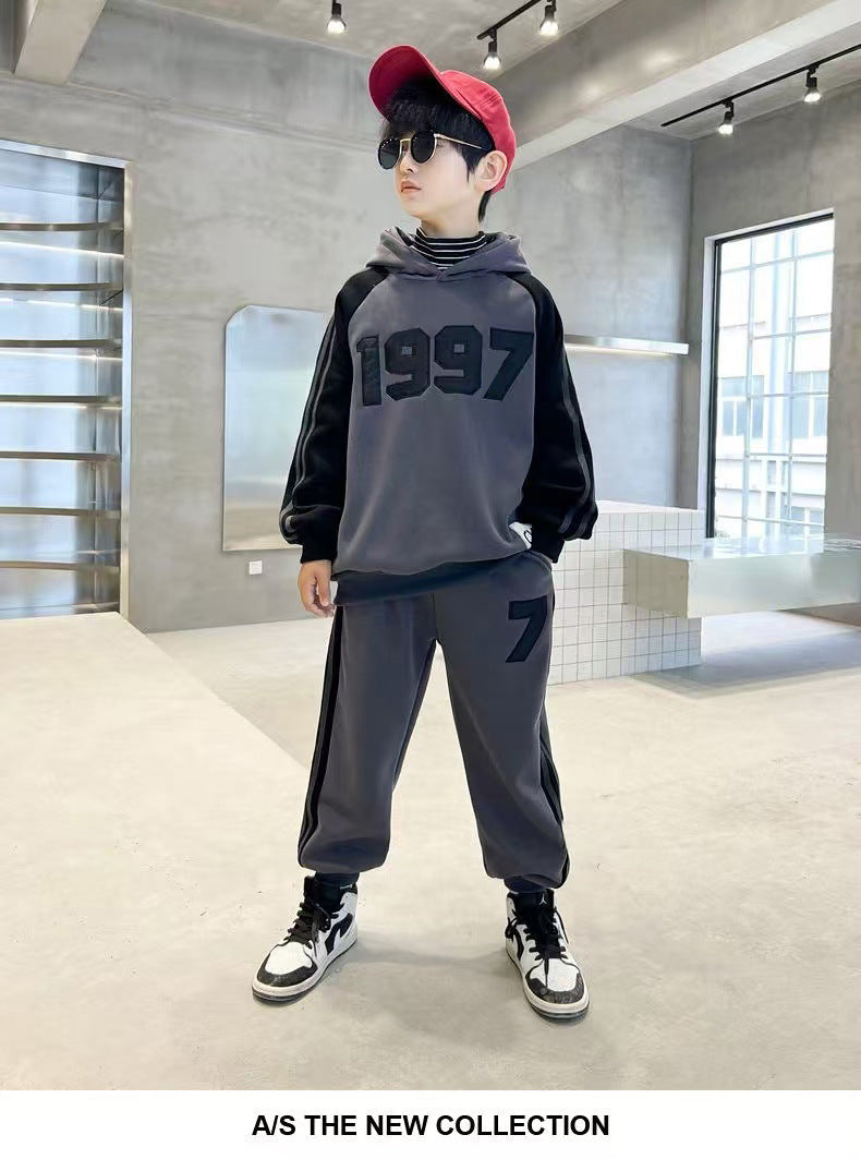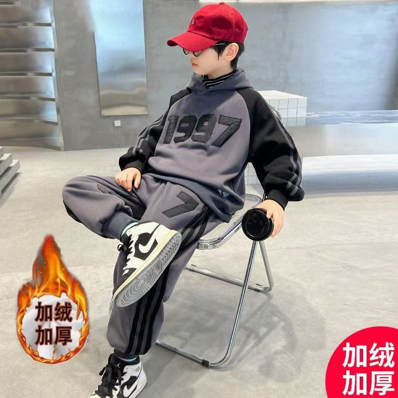 FG25112018秋冬兒童加絨加厚運動套裝中大童時尚潮範連帽衛衣衛褲休閒兩件套
