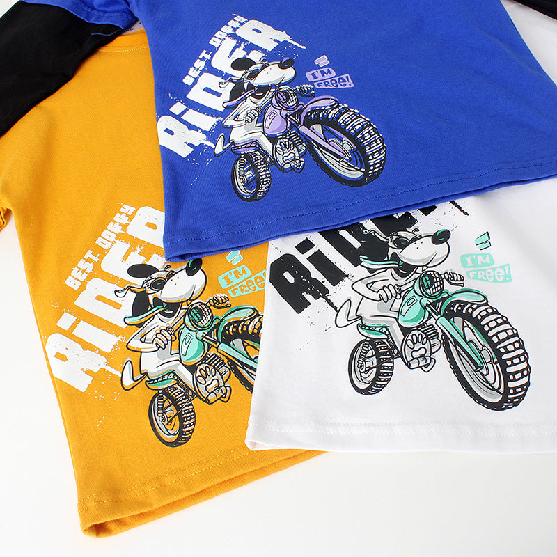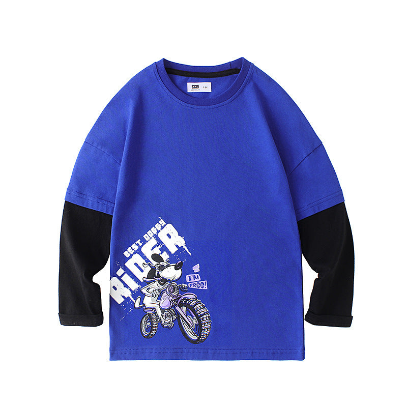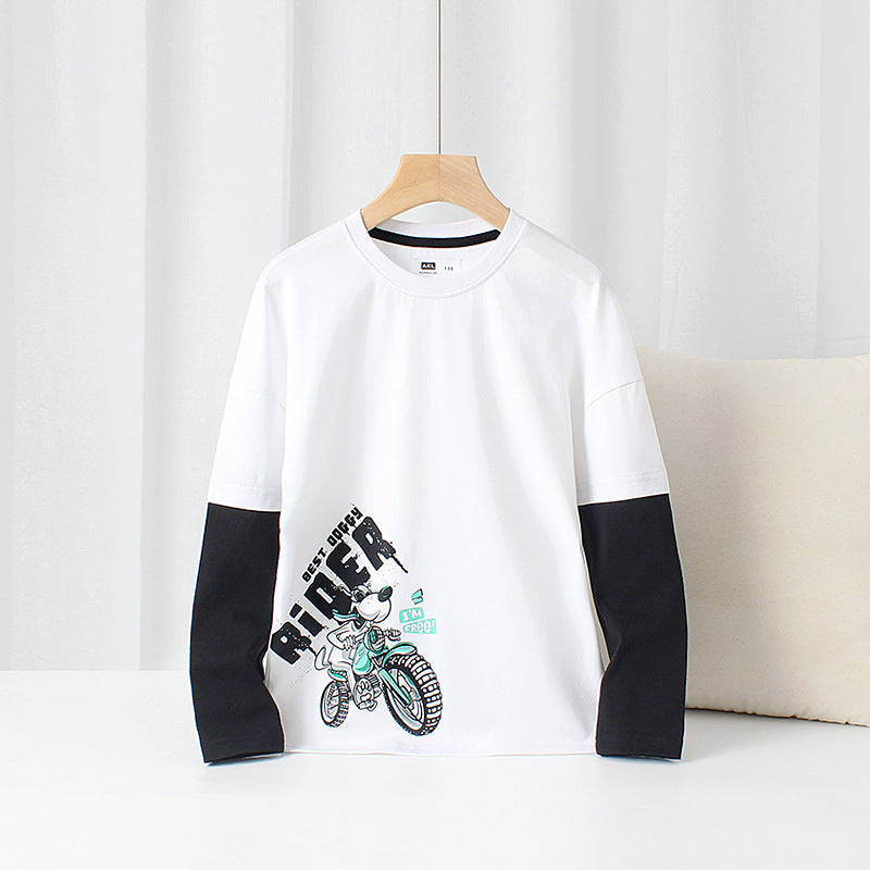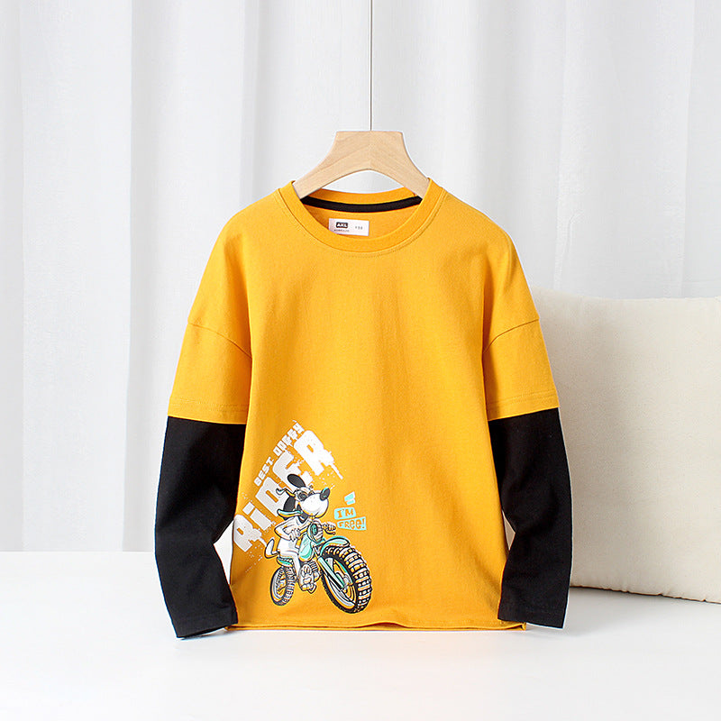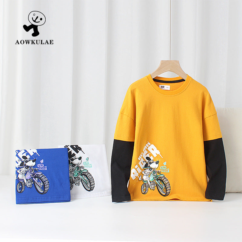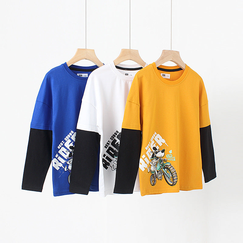 FI25101402春季童裝韓版新款兒童長袖T恤大童卡通假兩件撞色上衣男童打底衫