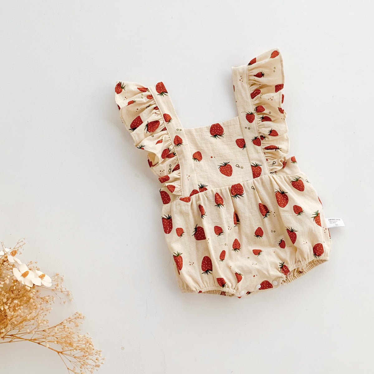 G23061502夏季新款無袖背心款女寶寶百日周歲草莓連體三角爬服