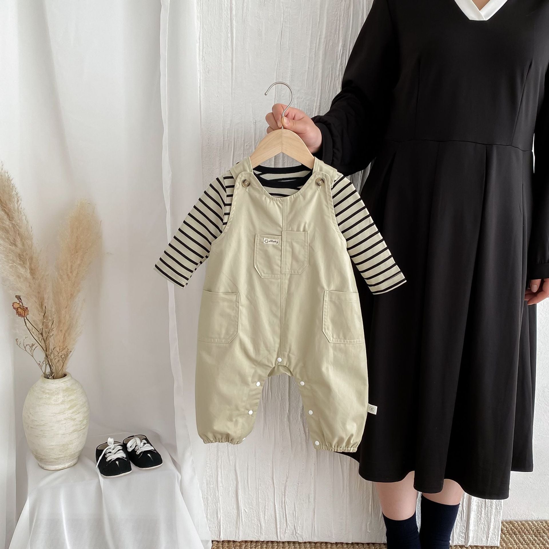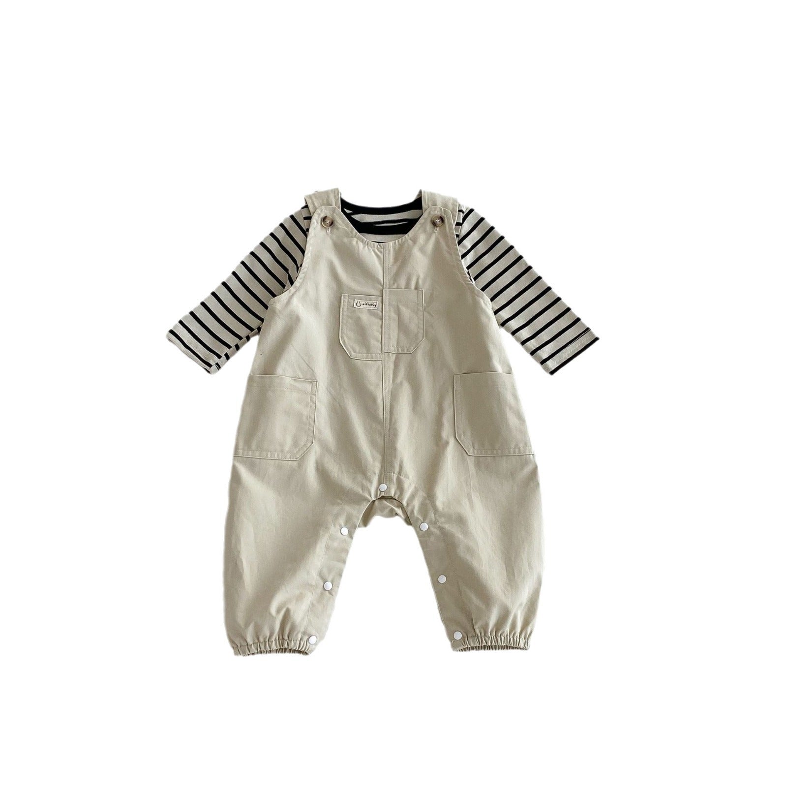 G24110604韓版2024秋季新款嬰兒衣男寶寶工人背帶褲套裝連身衣兩件套裝