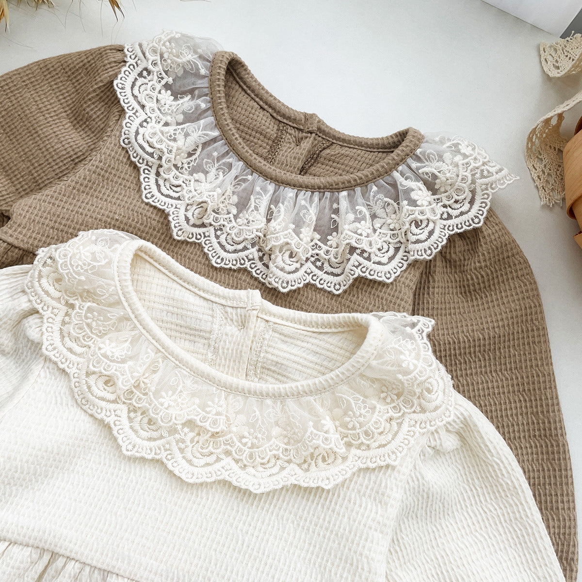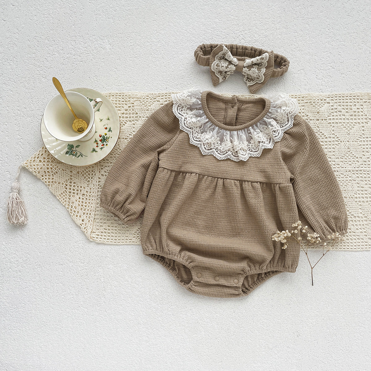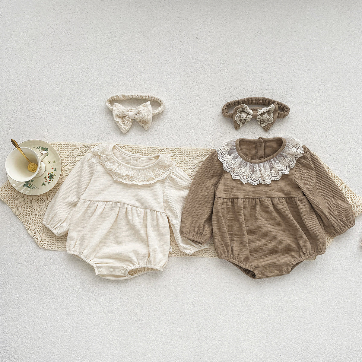 G24110615韓版嬰兒服裝女寶寶春秋款長袖華夫格蕾絲花邊連身衣兒童童裝