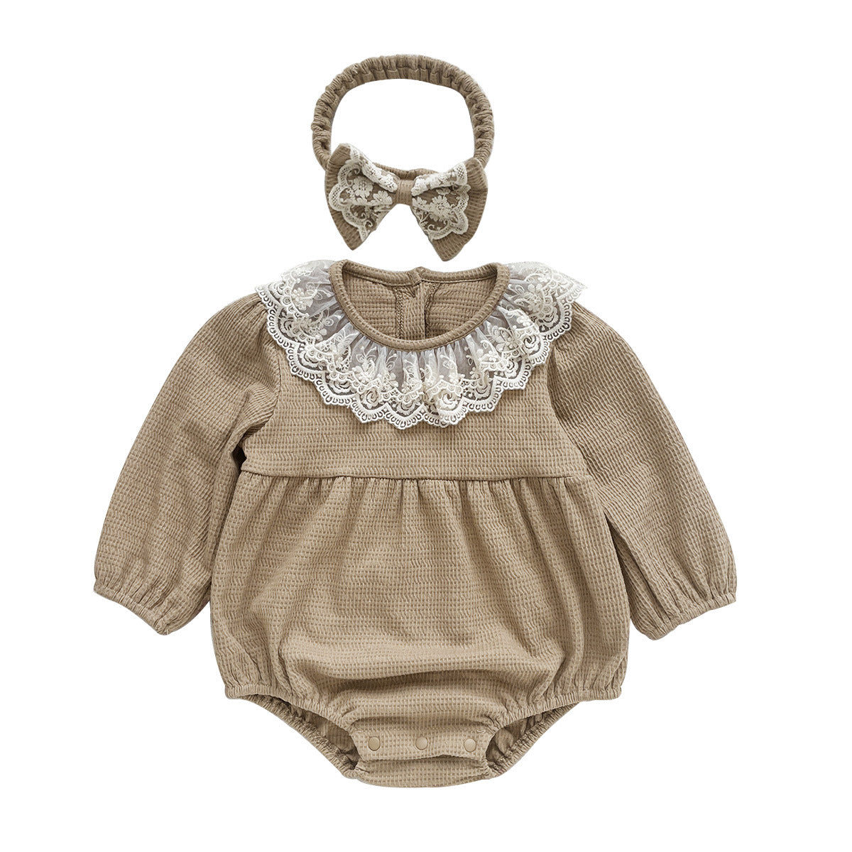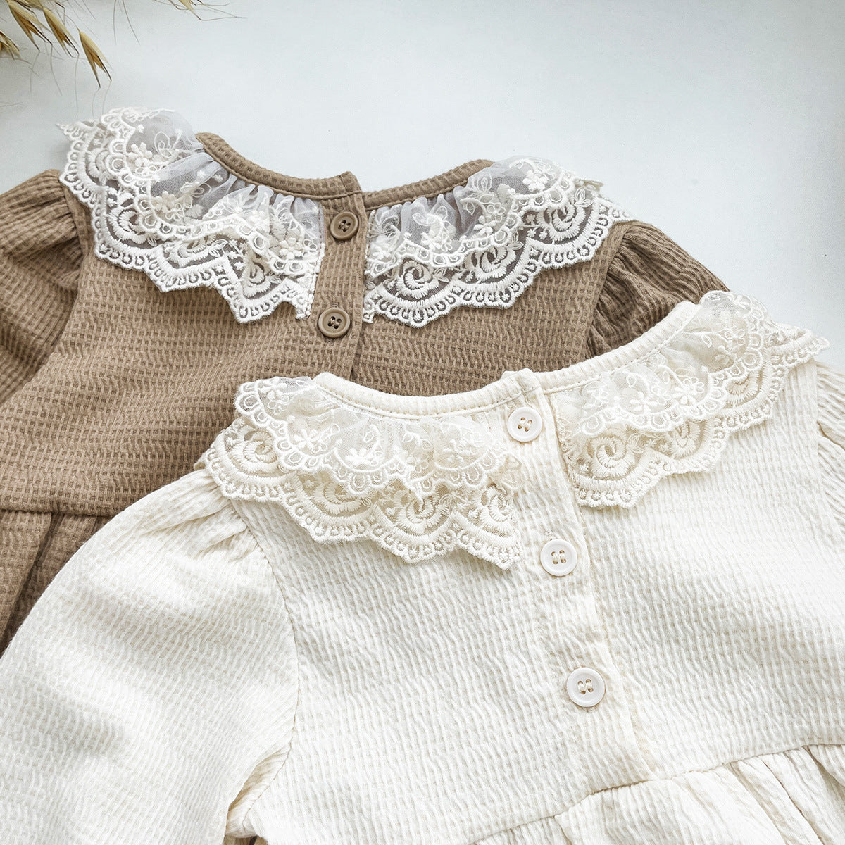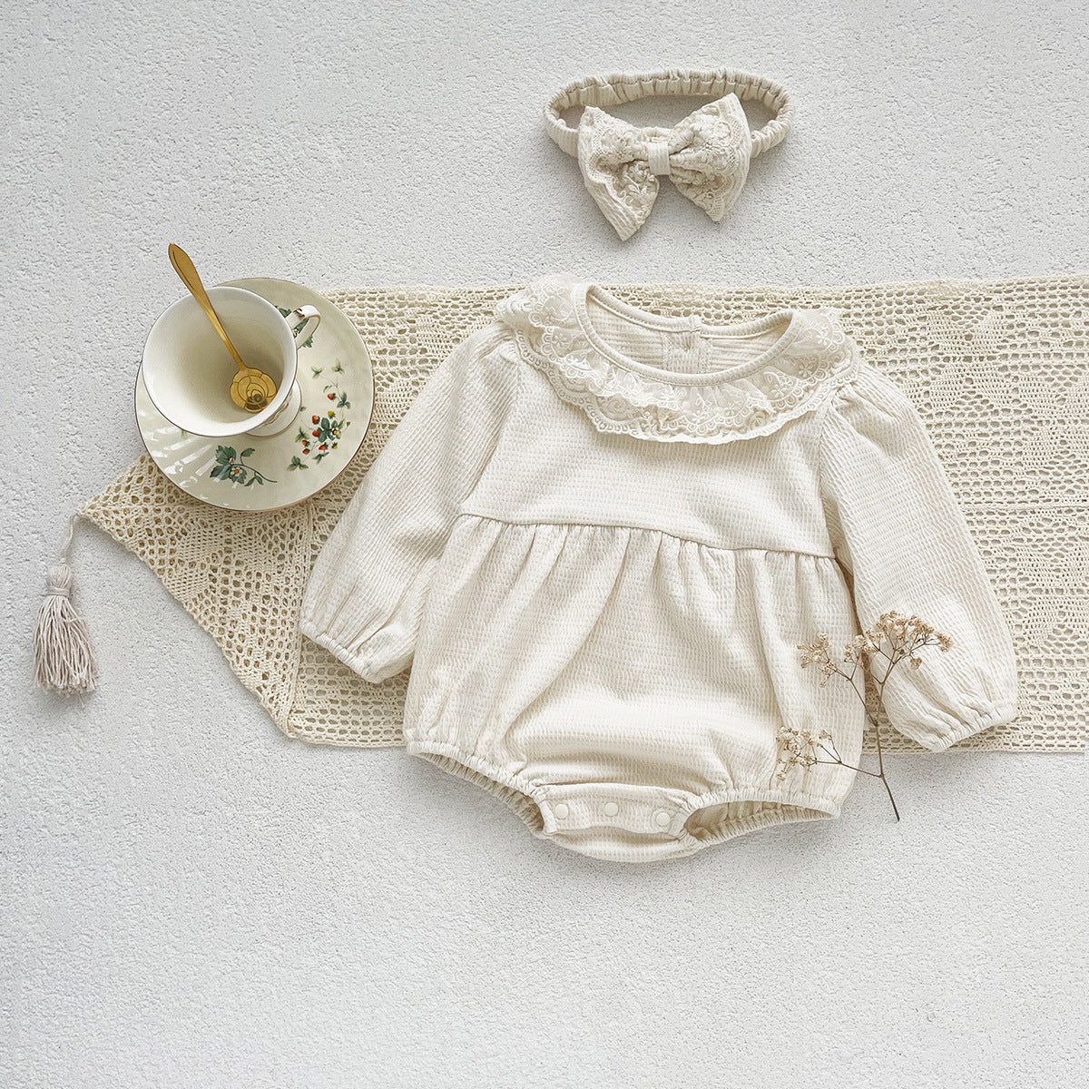G24110615韓版嬰兒服裝女寶寶春秋款長袖華夫格蕾絲花邊連身衣兒童童裝