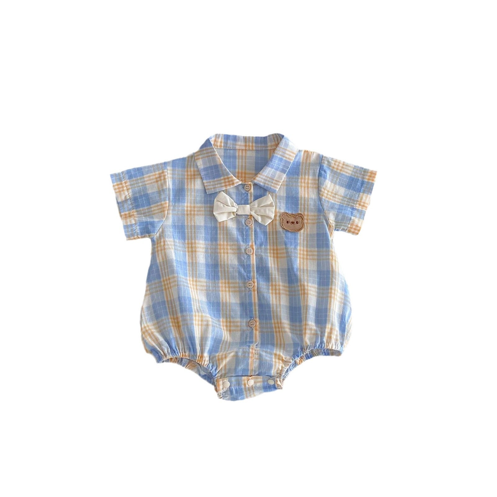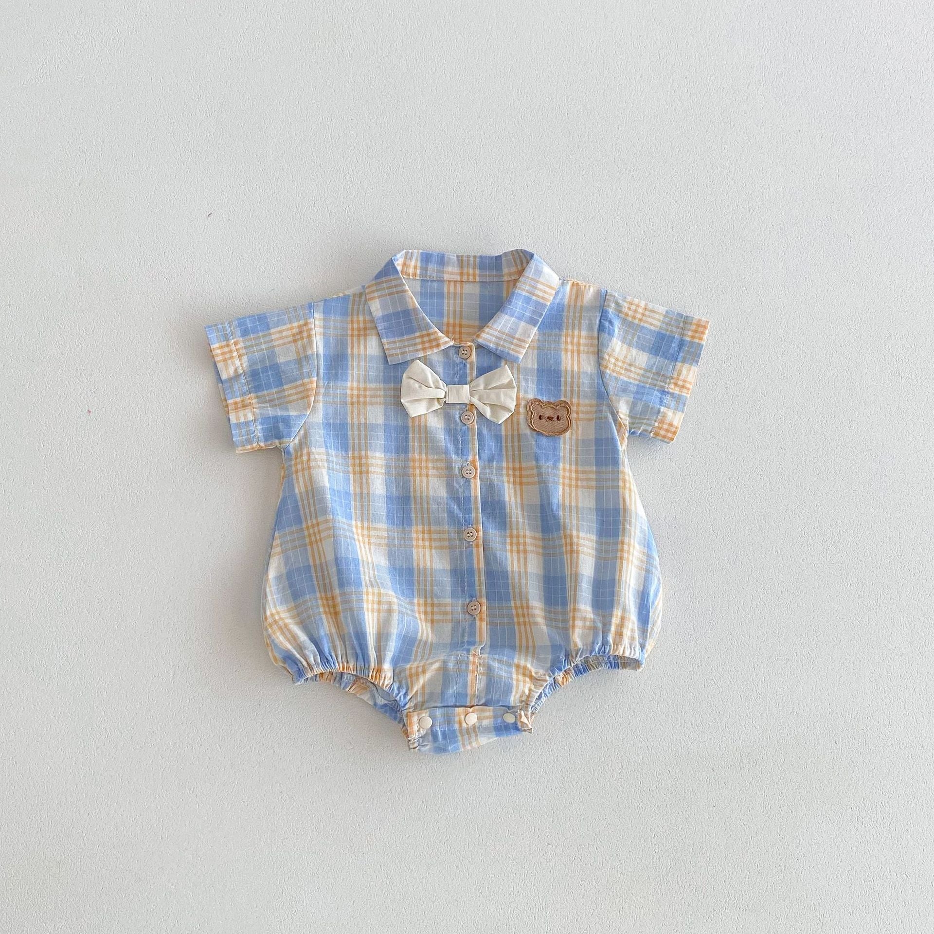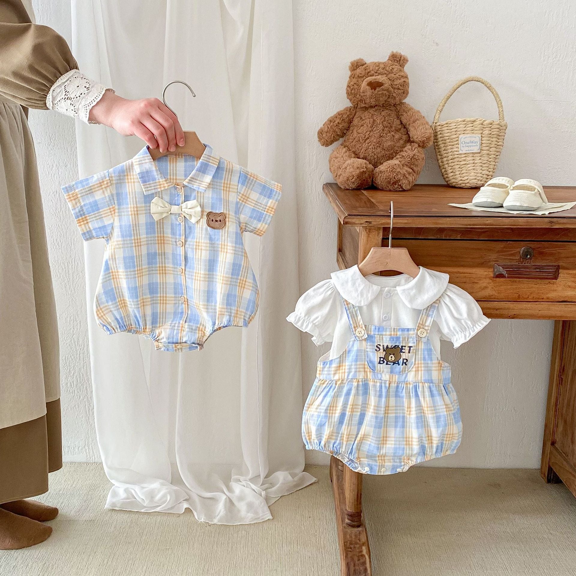 G25051406 ins夏季男女寶寶新款嬰兒連身衣寶寶短袖姐弟款小熊格子哈衣爬服