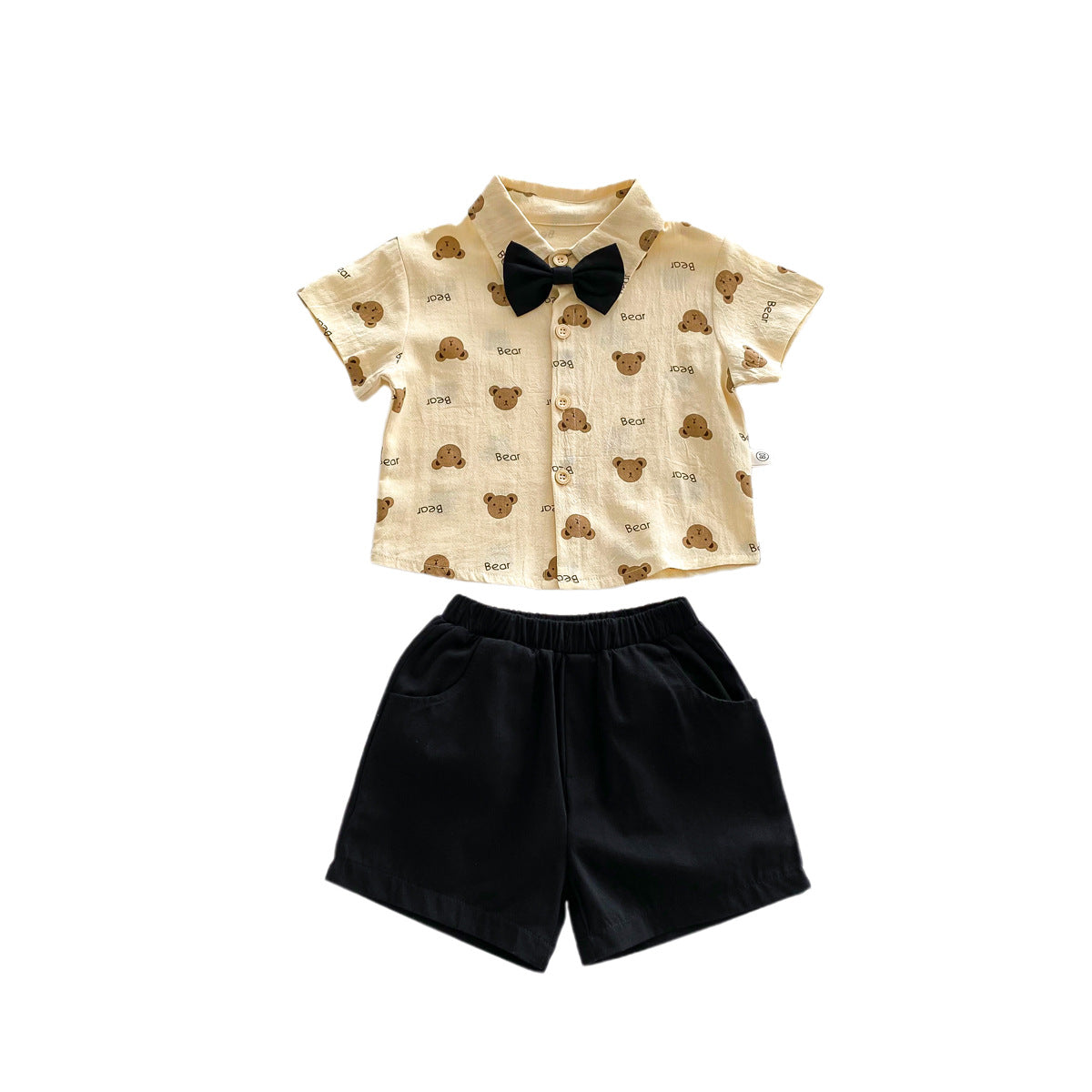 G25051421 男童夏季帥氣紳士領結短袖印花小熊襯衫短褲兩件套裝