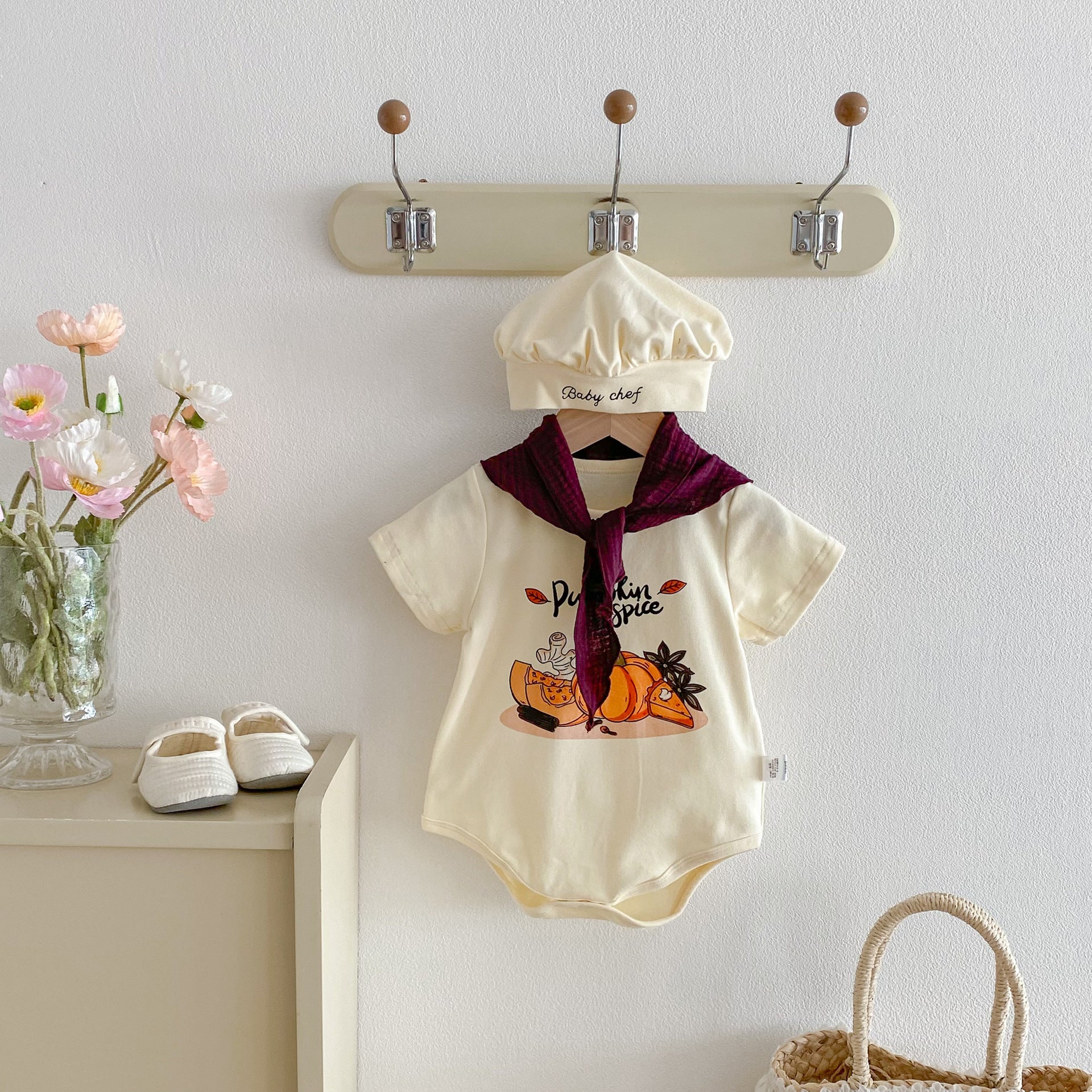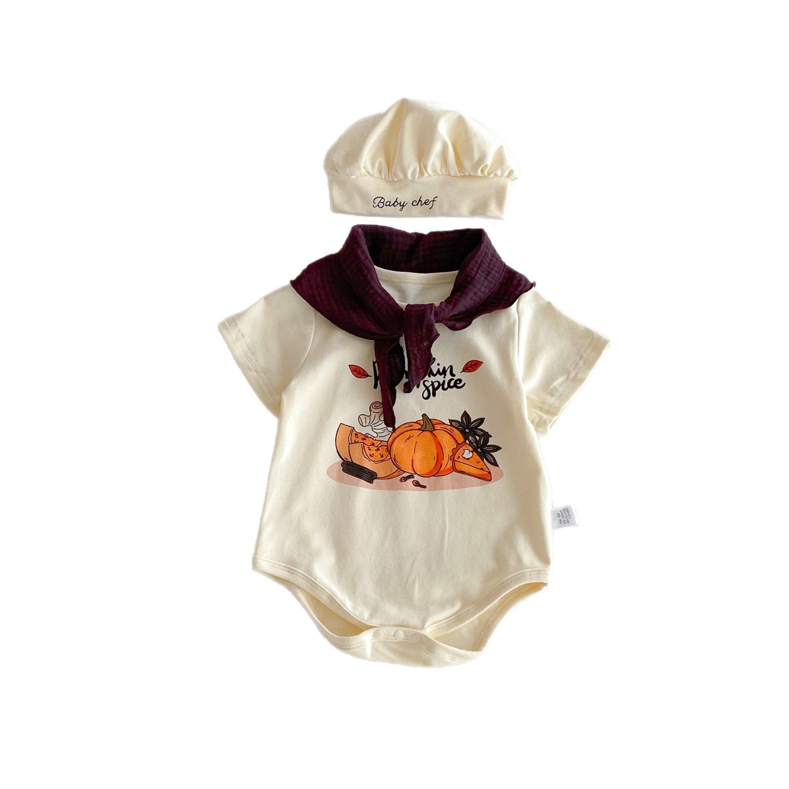 G25091110夏季童裝新款兒童萬聖節童裝歐美可愛短袖南瓜圓領哈衣爬服三件套