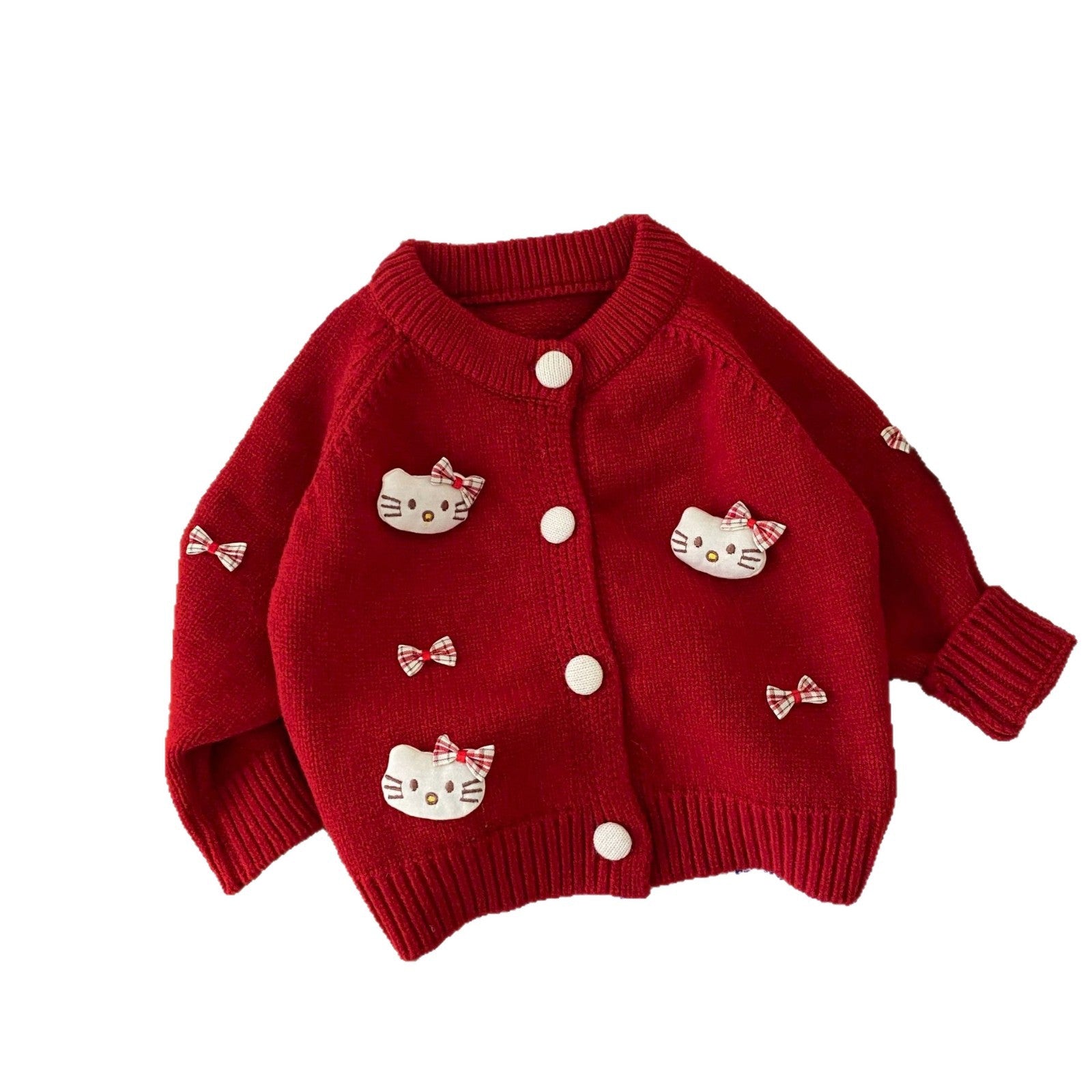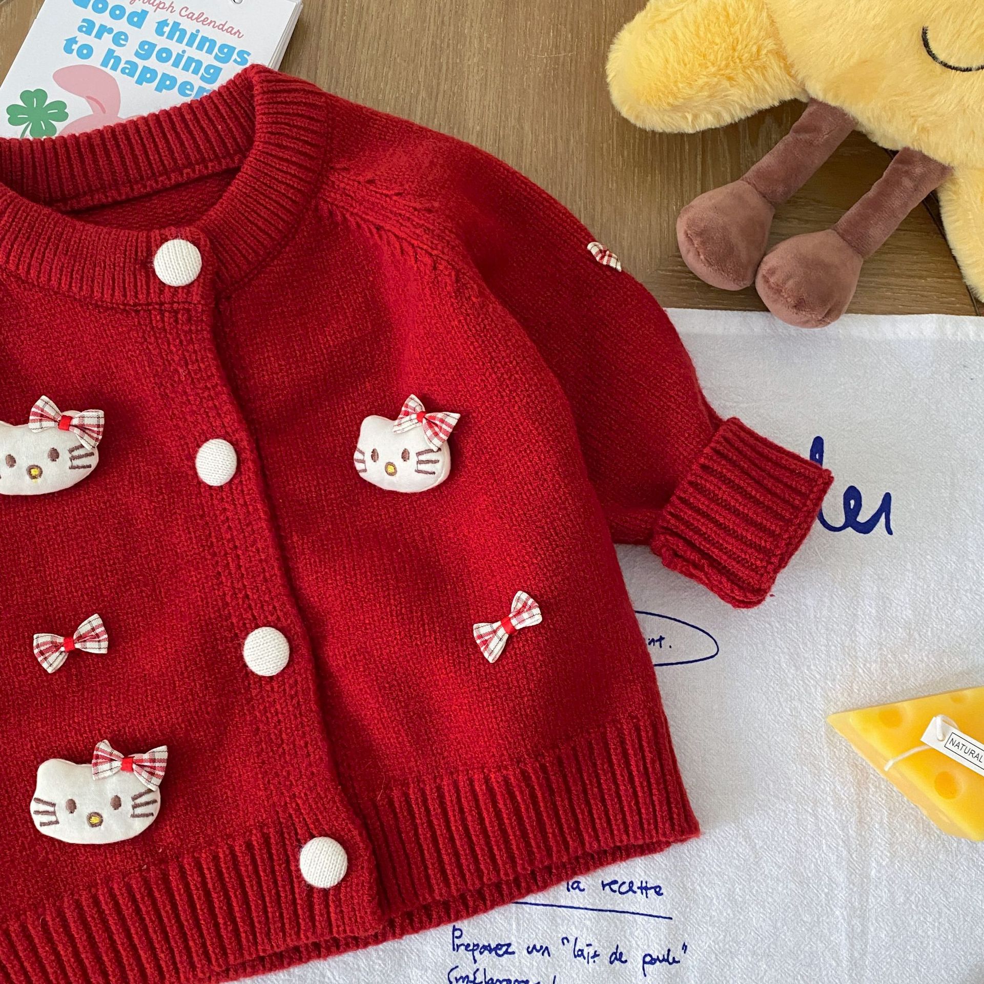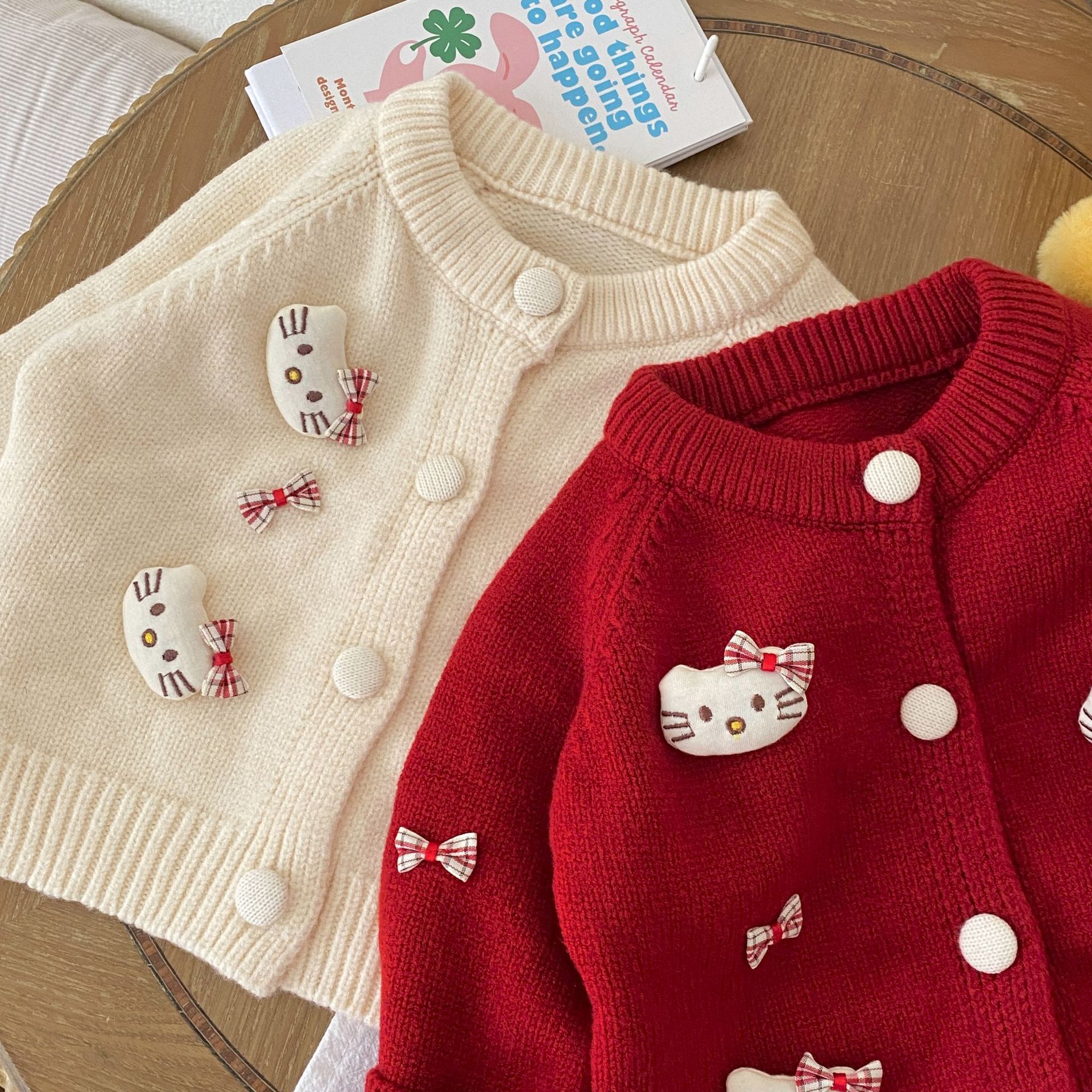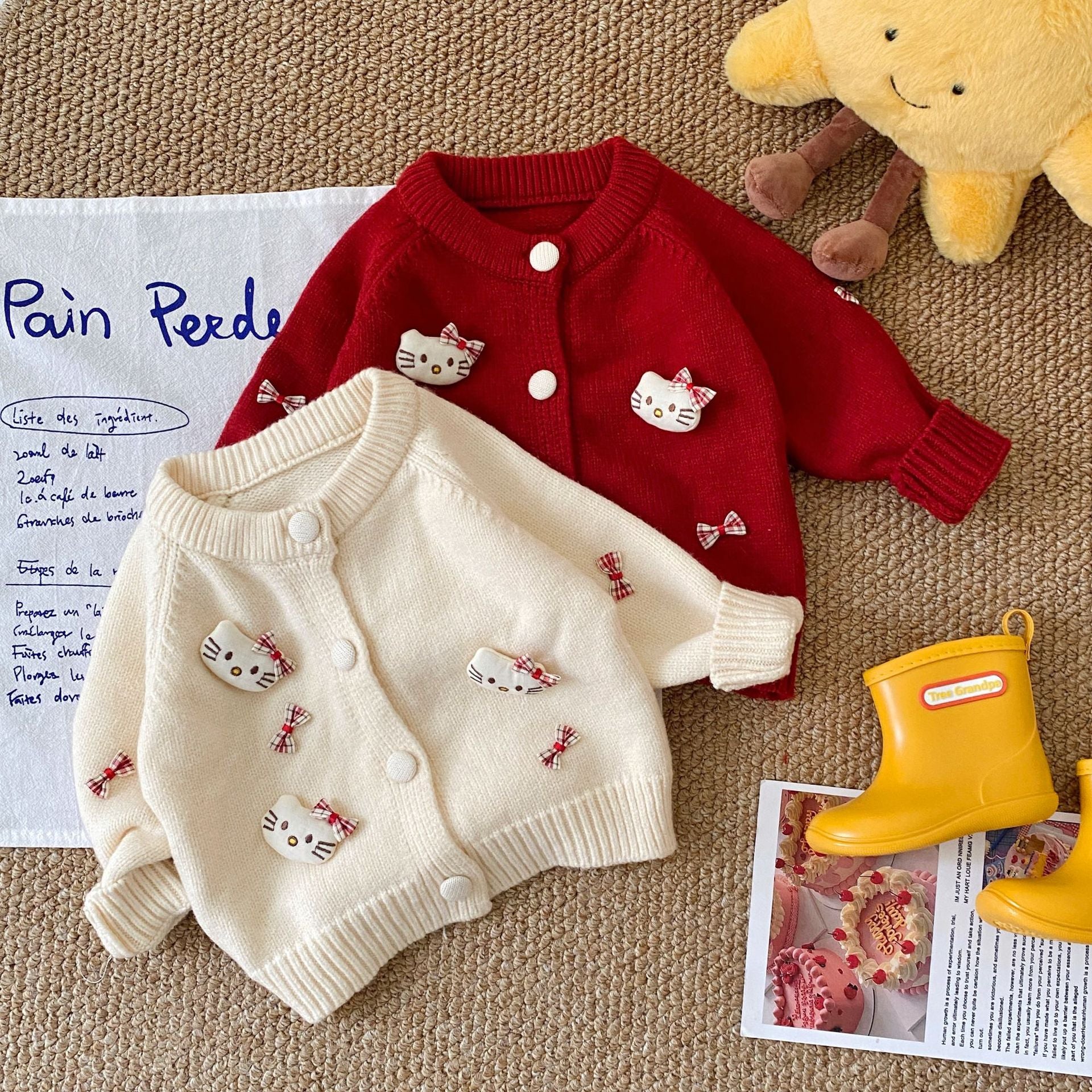 G25092512嬰兒女孩童裝可愛針織毛衣卡通貓咪洋氣單排扣秋冬季開襟外套