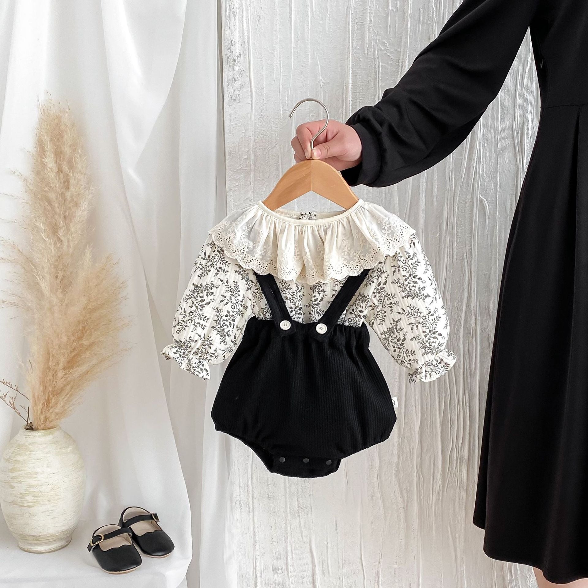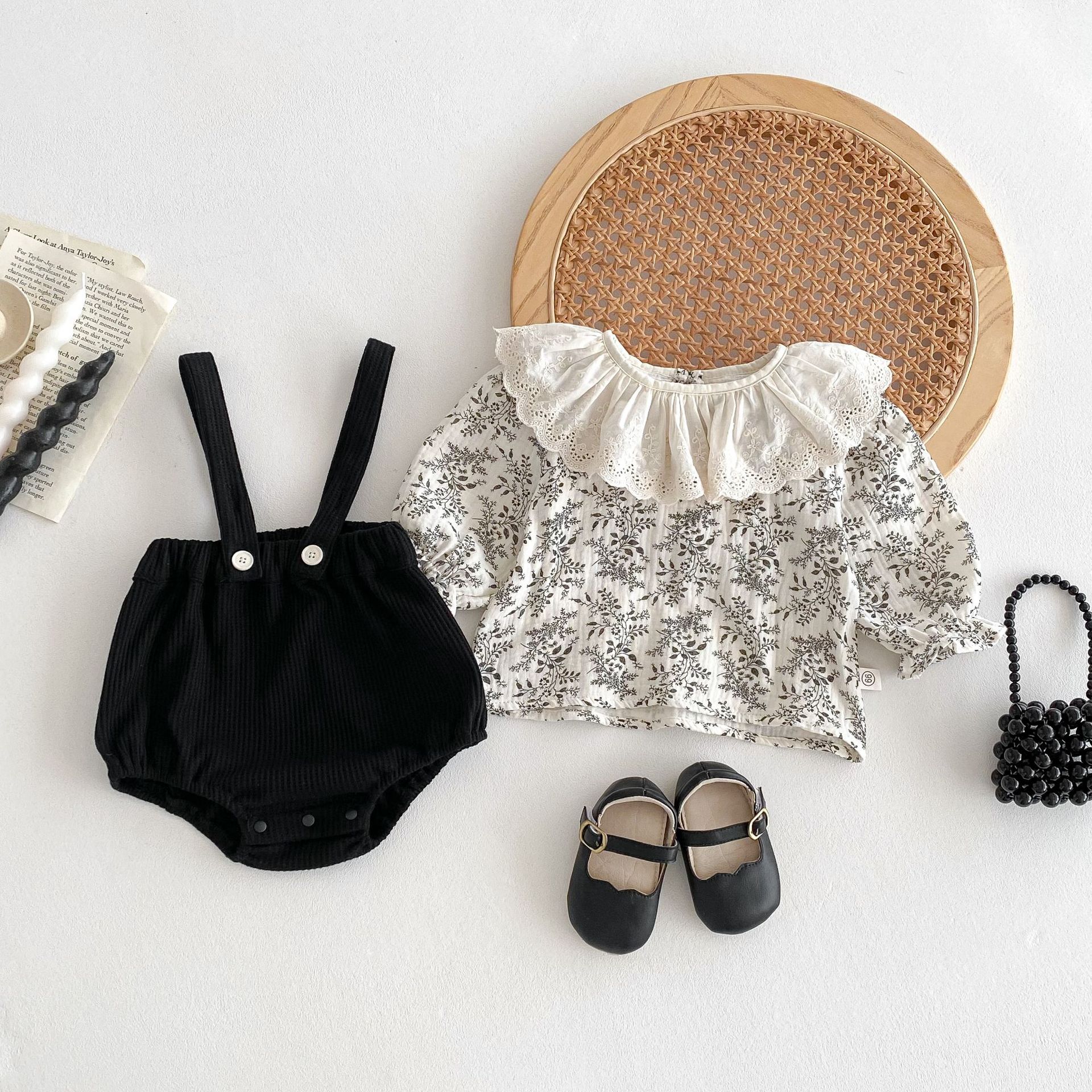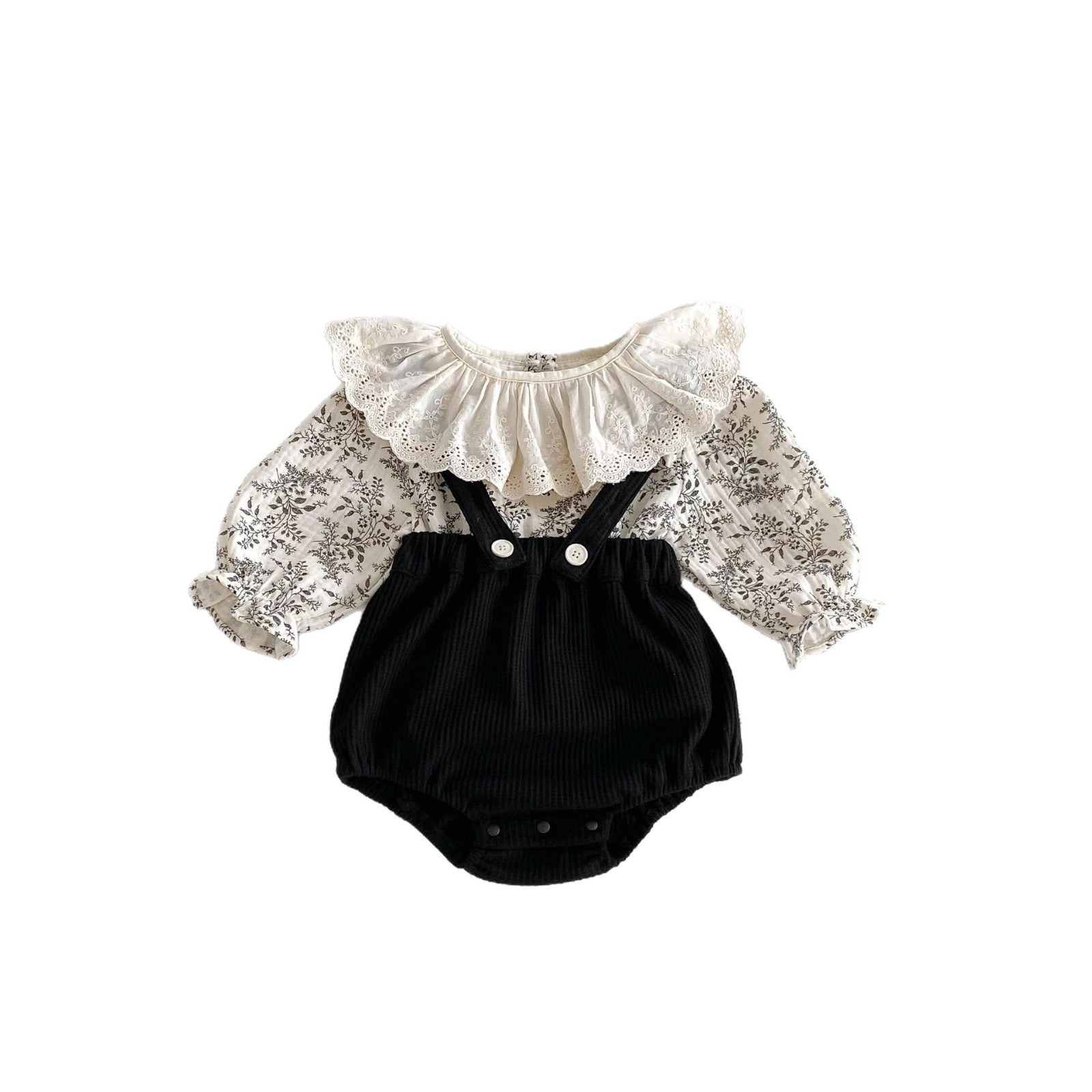 G25092513嬰兒衣服秋裝背帶褲套裝韓版女花邊洋氣碎花上衣女童包屁褲兩件套