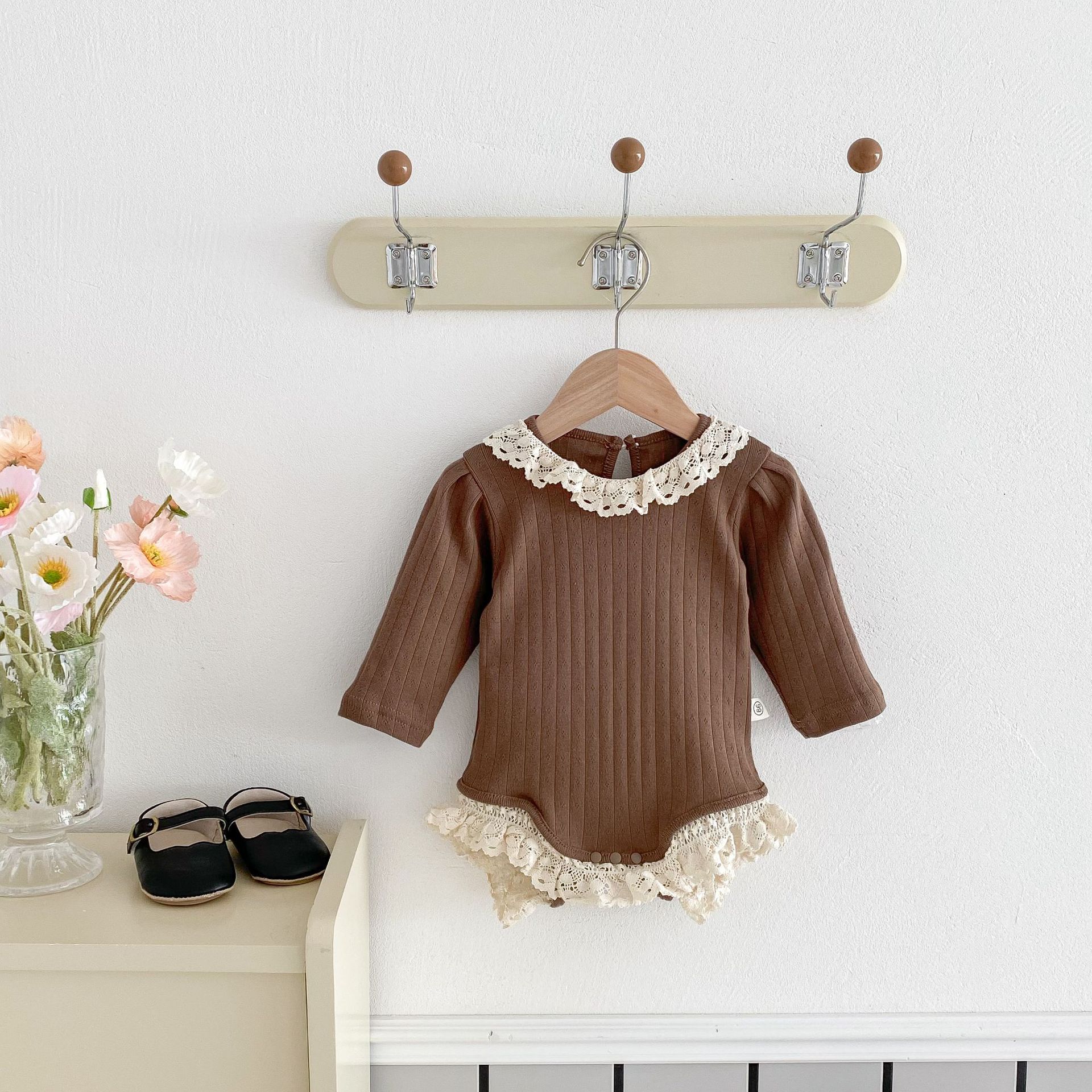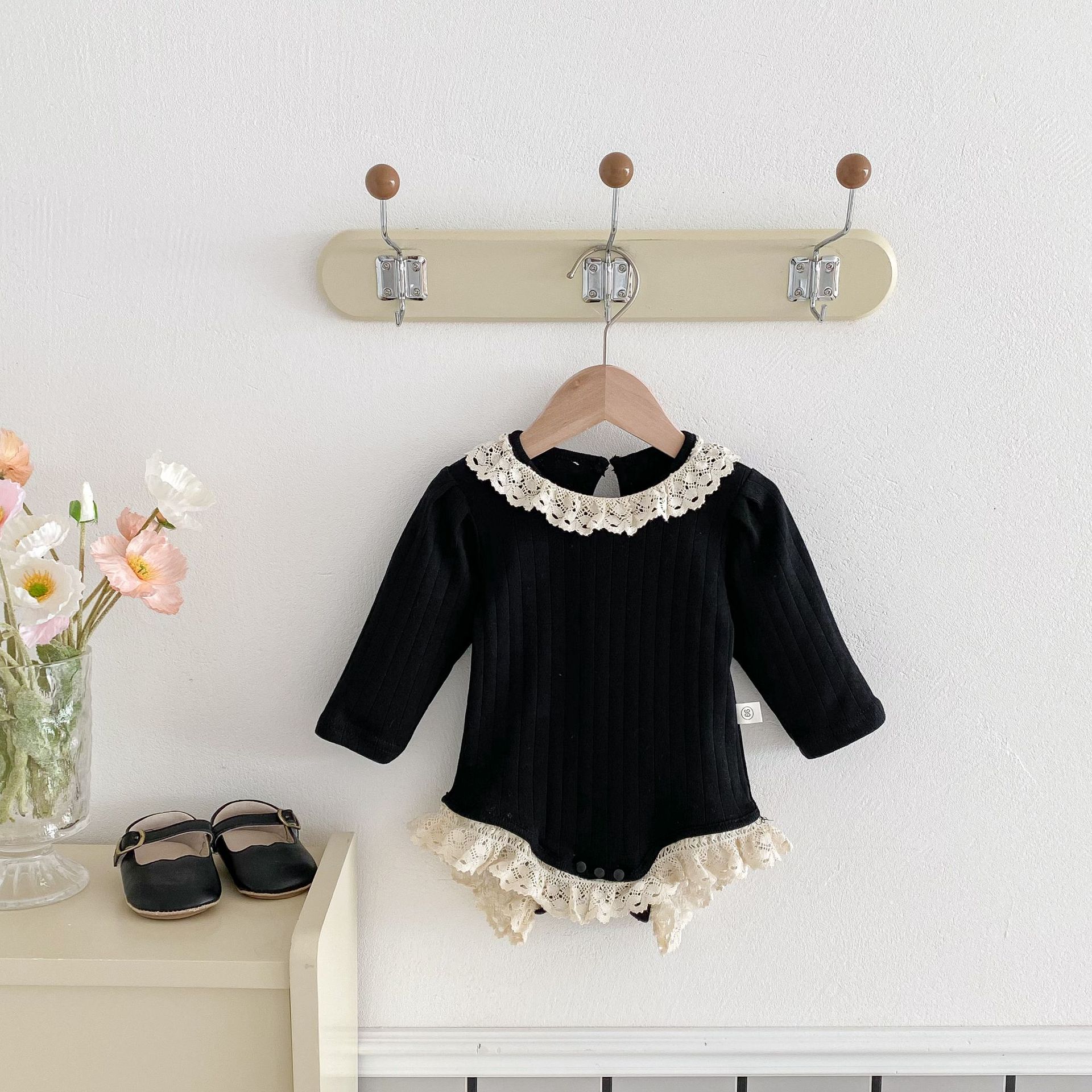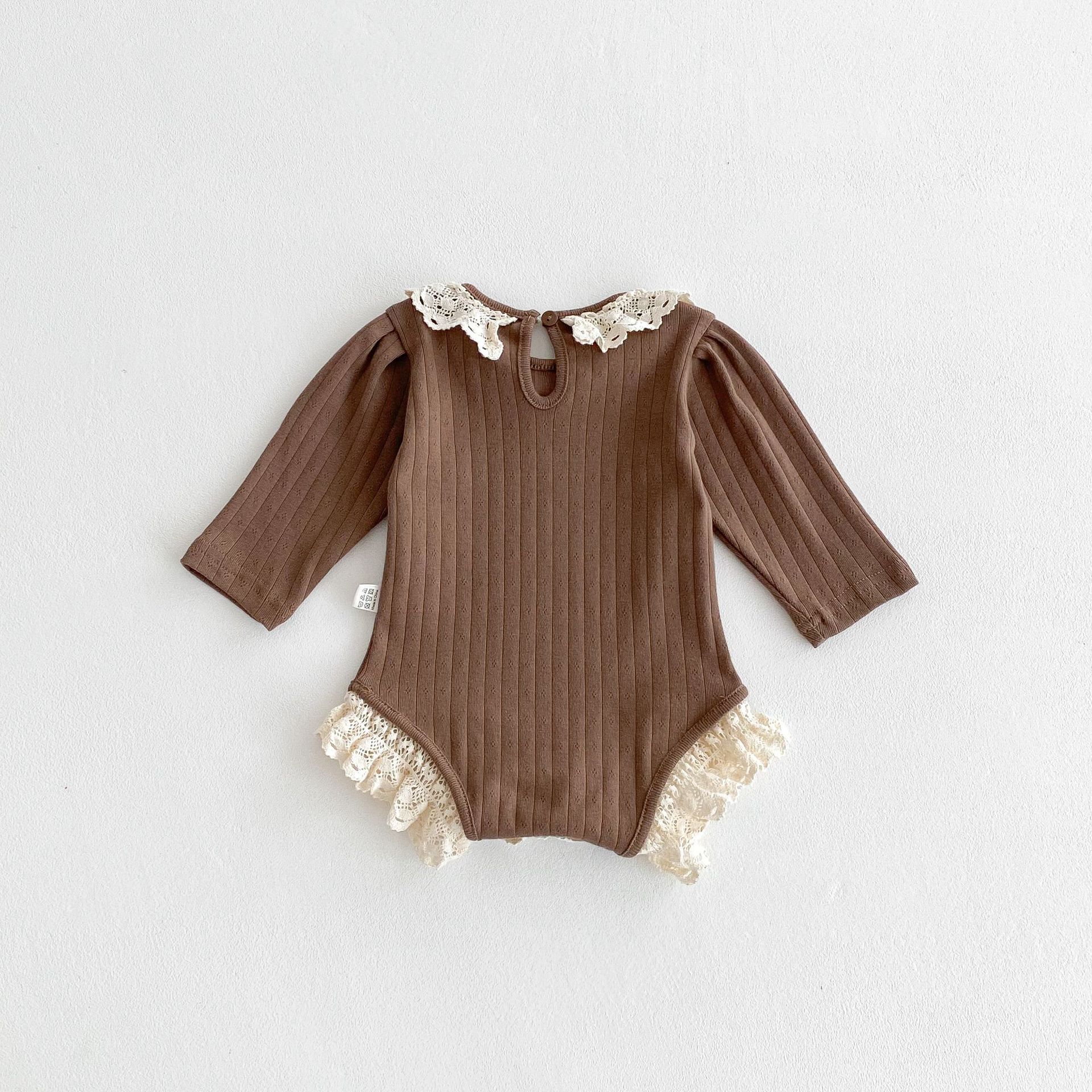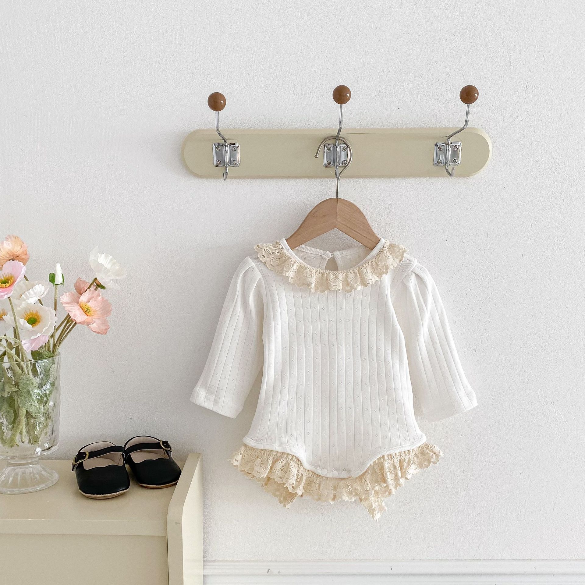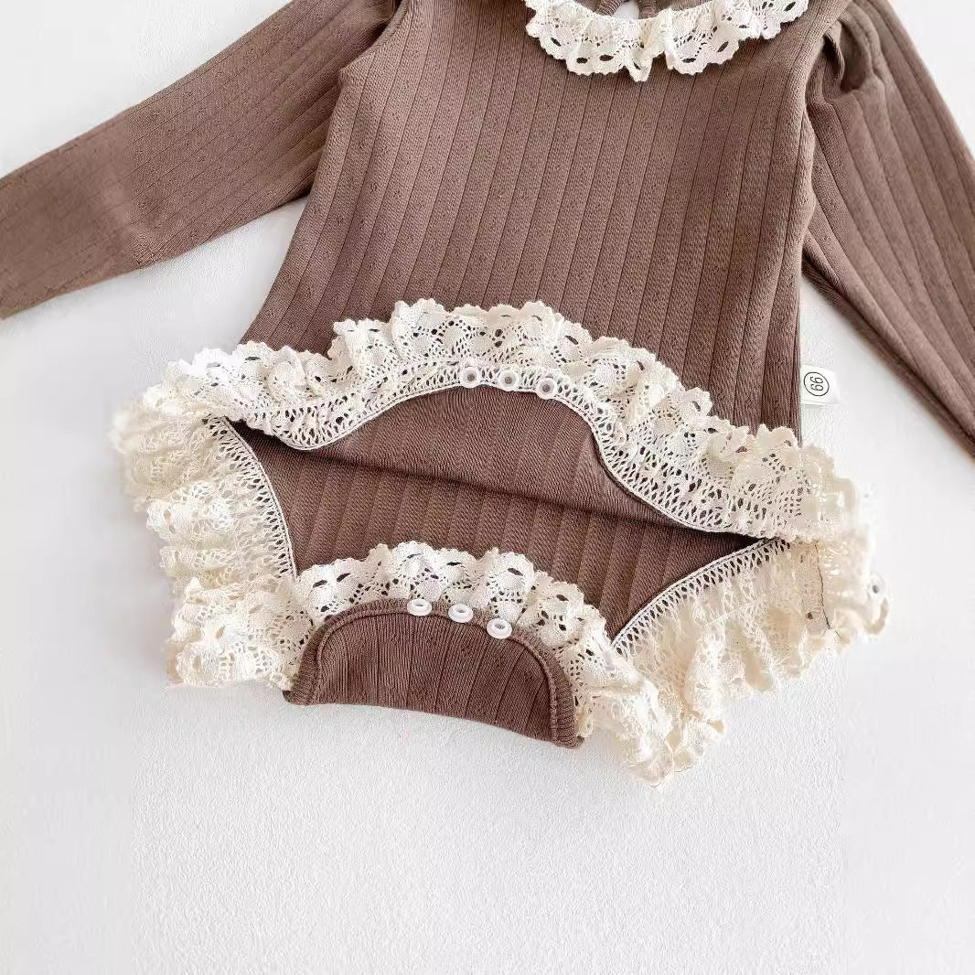G25092517秋冬嬰幼兒花邊圓領鏤空坑條長袖哈衣女寶寶下擺蕾絲爬服