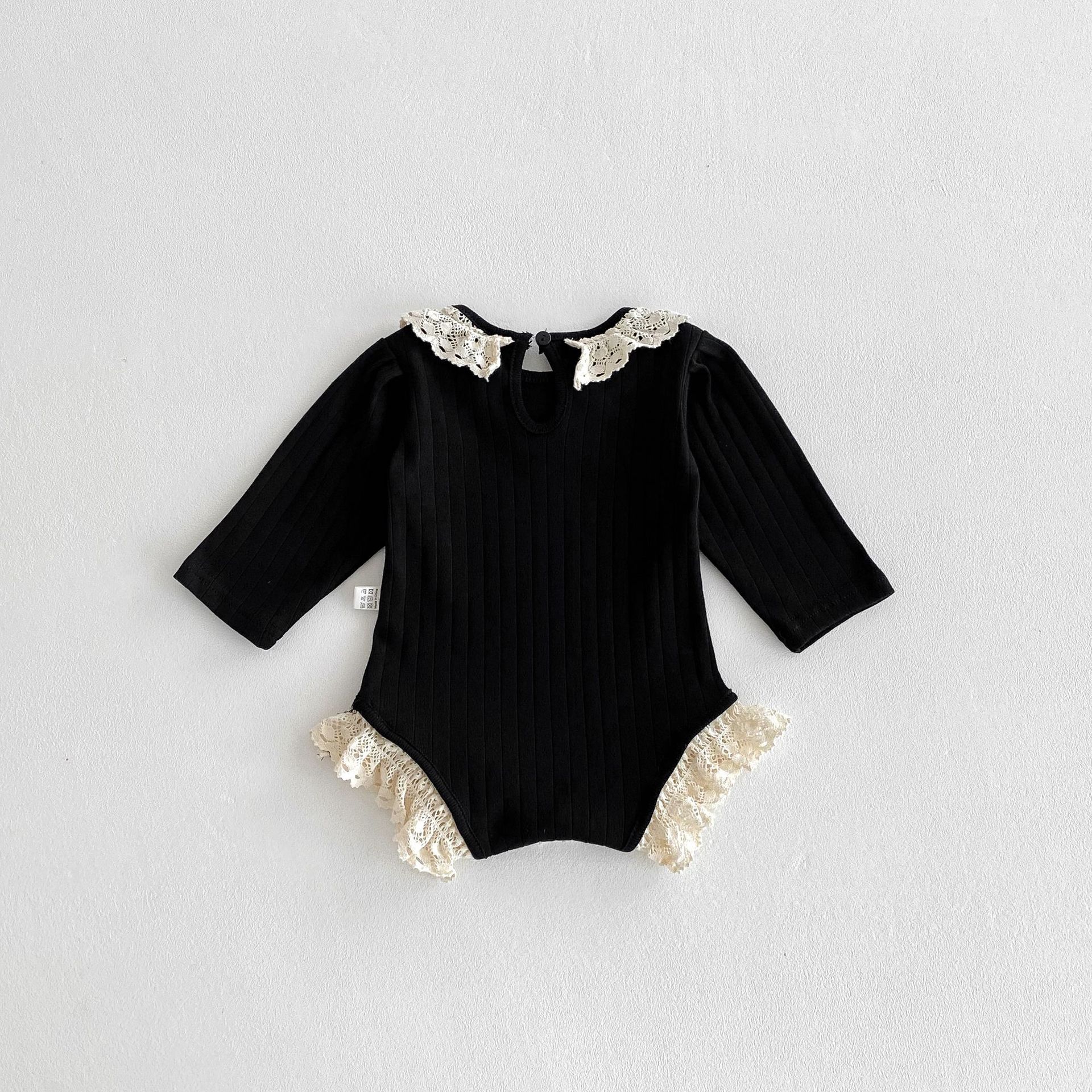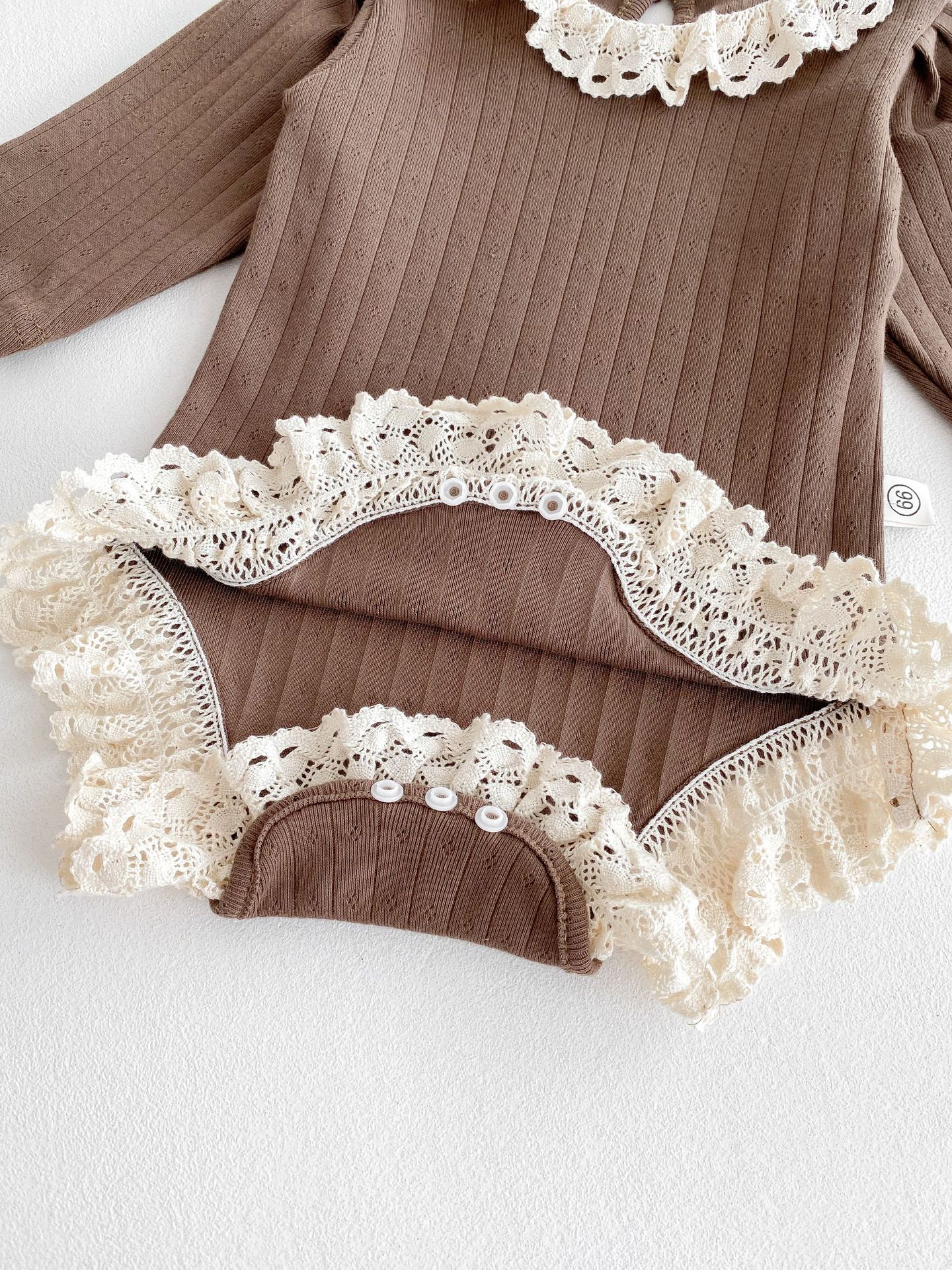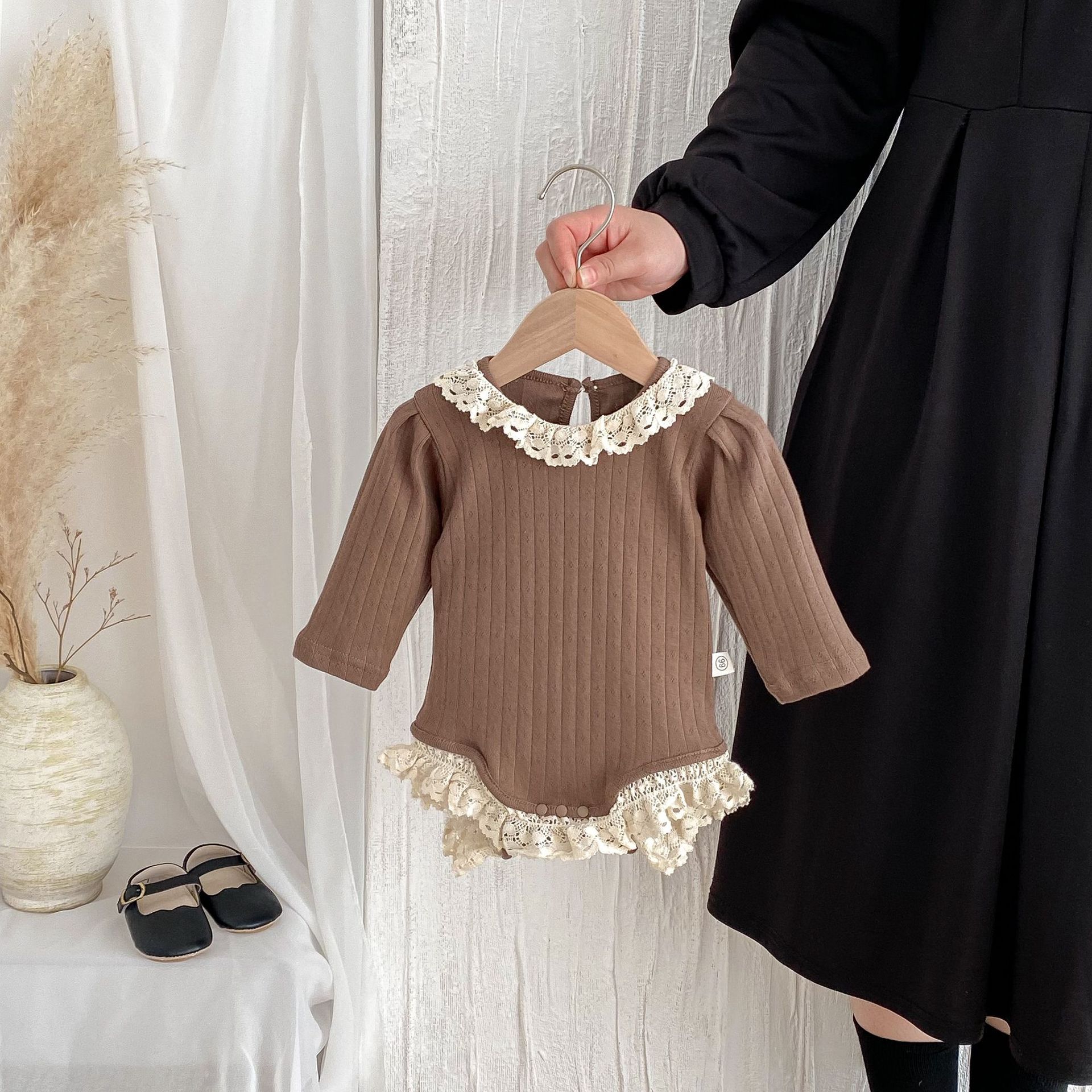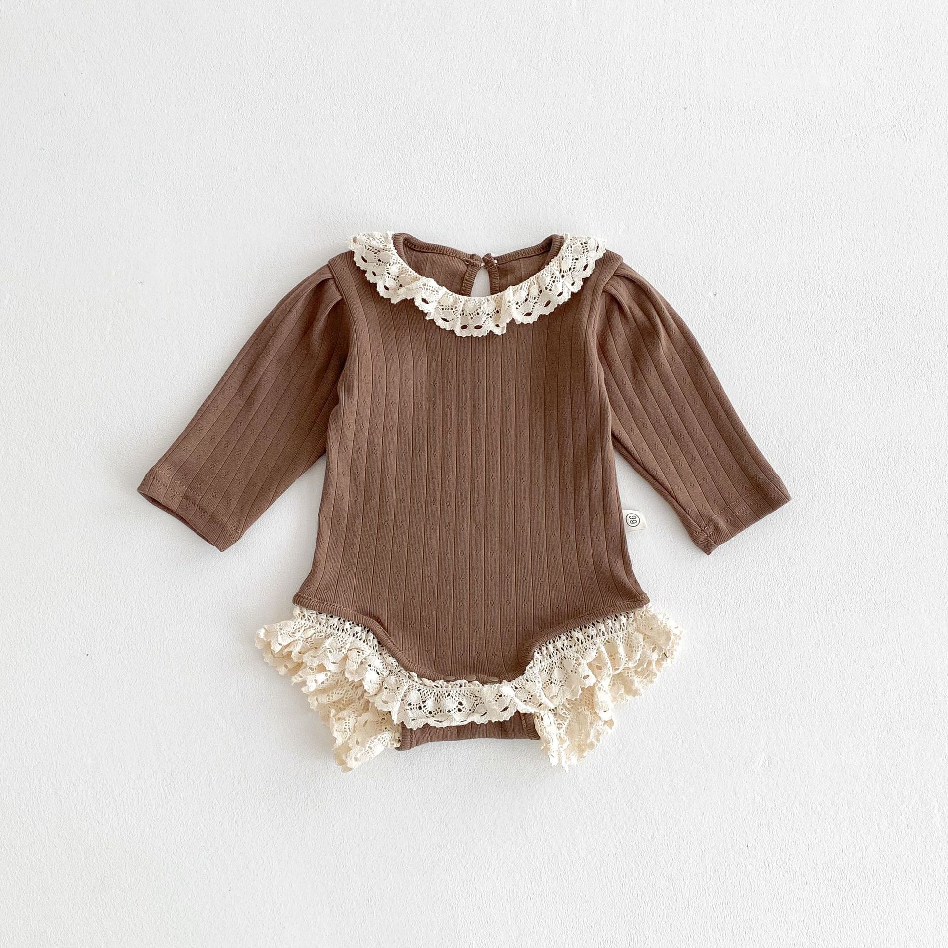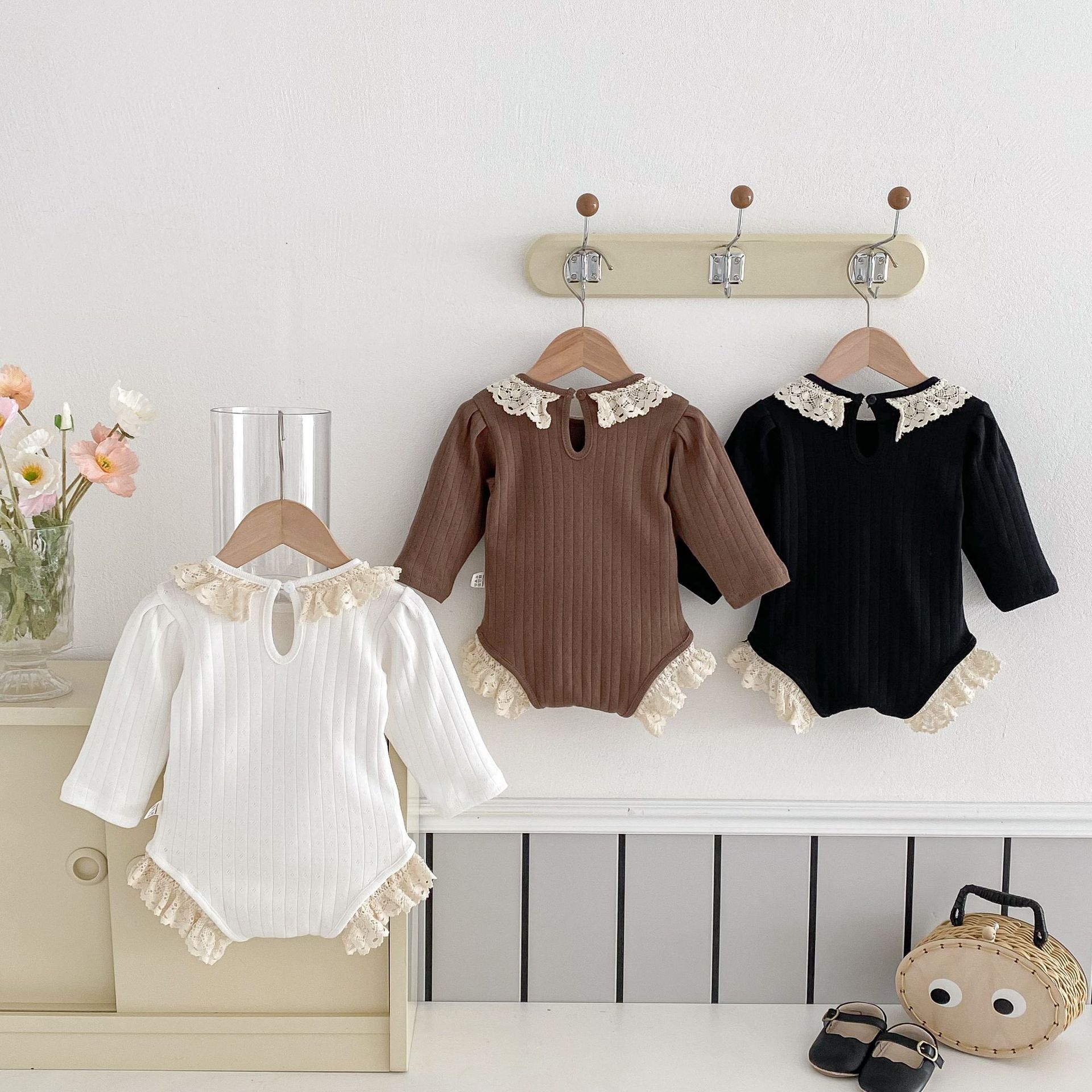 G25092517秋冬嬰幼兒花邊圓領鏤空坑條長袖哈衣女寶寶下擺蕾絲爬服