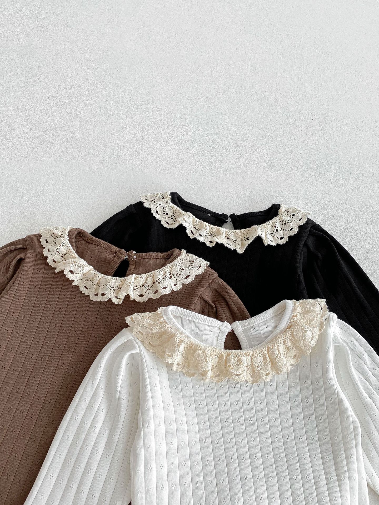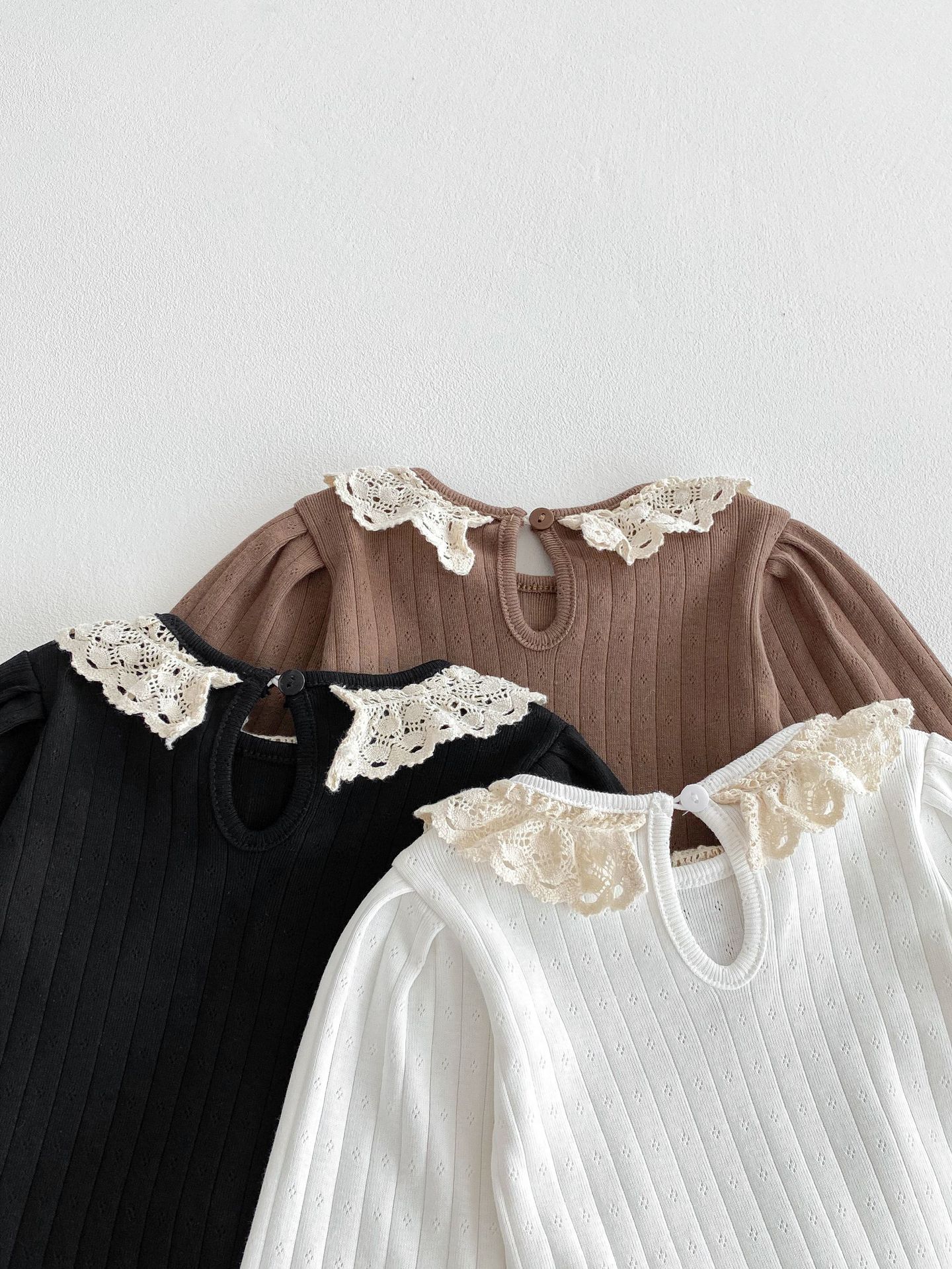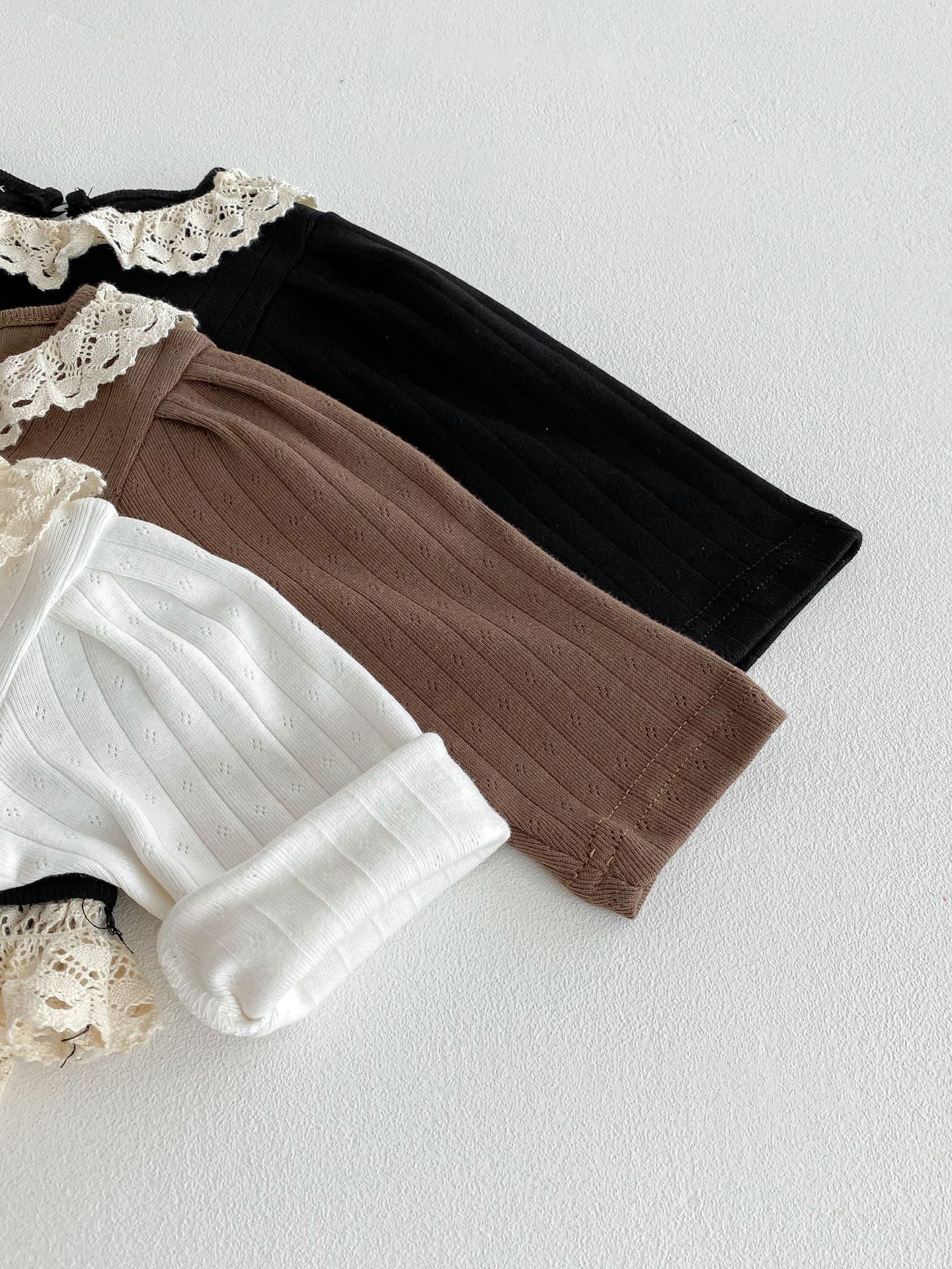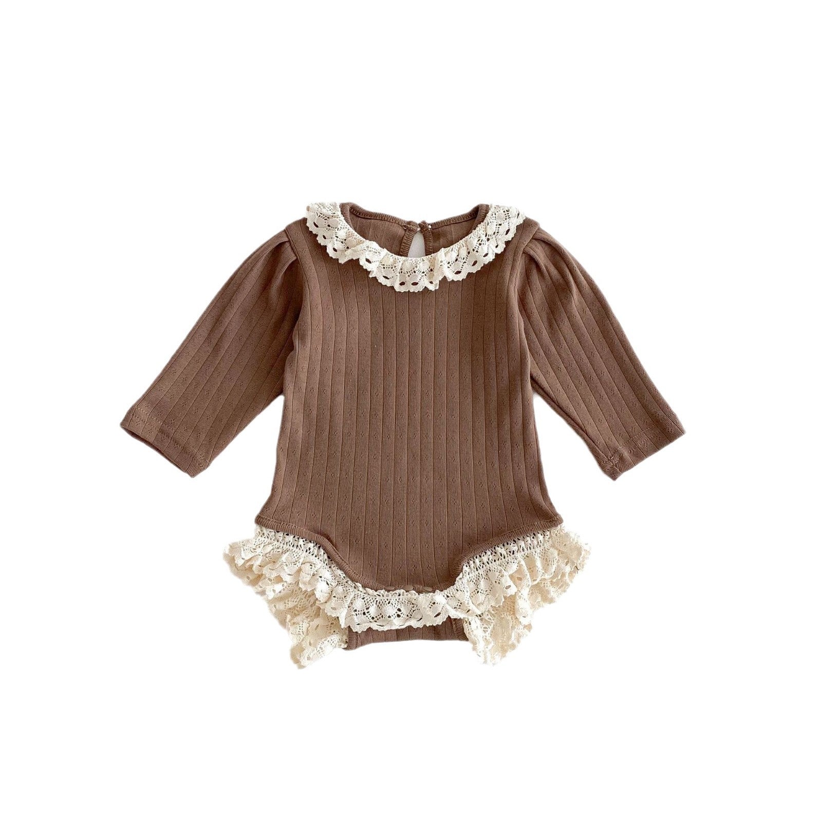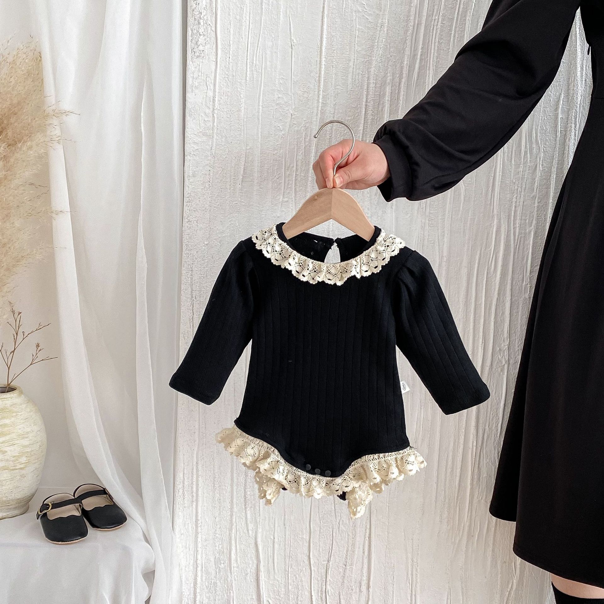 G25092517秋冬嬰幼兒花邊圓領鏤空坑條長袖哈衣女寶寶下擺蕾絲爬服