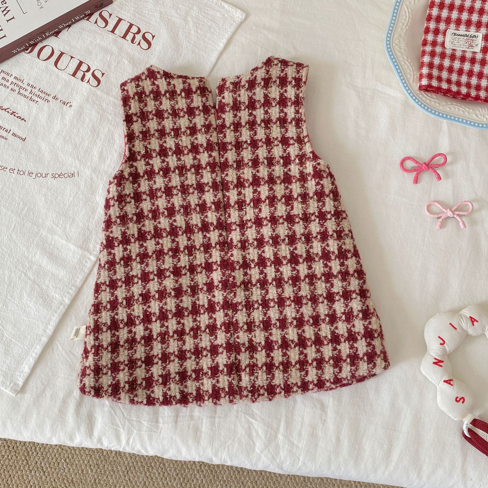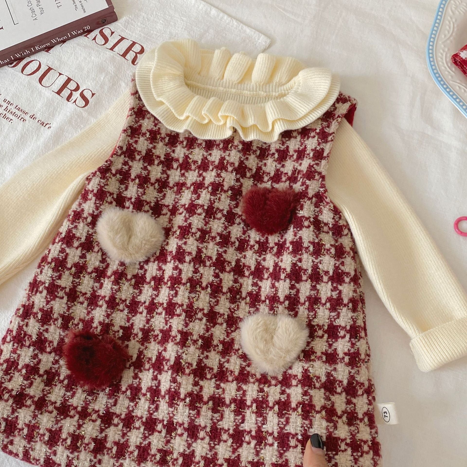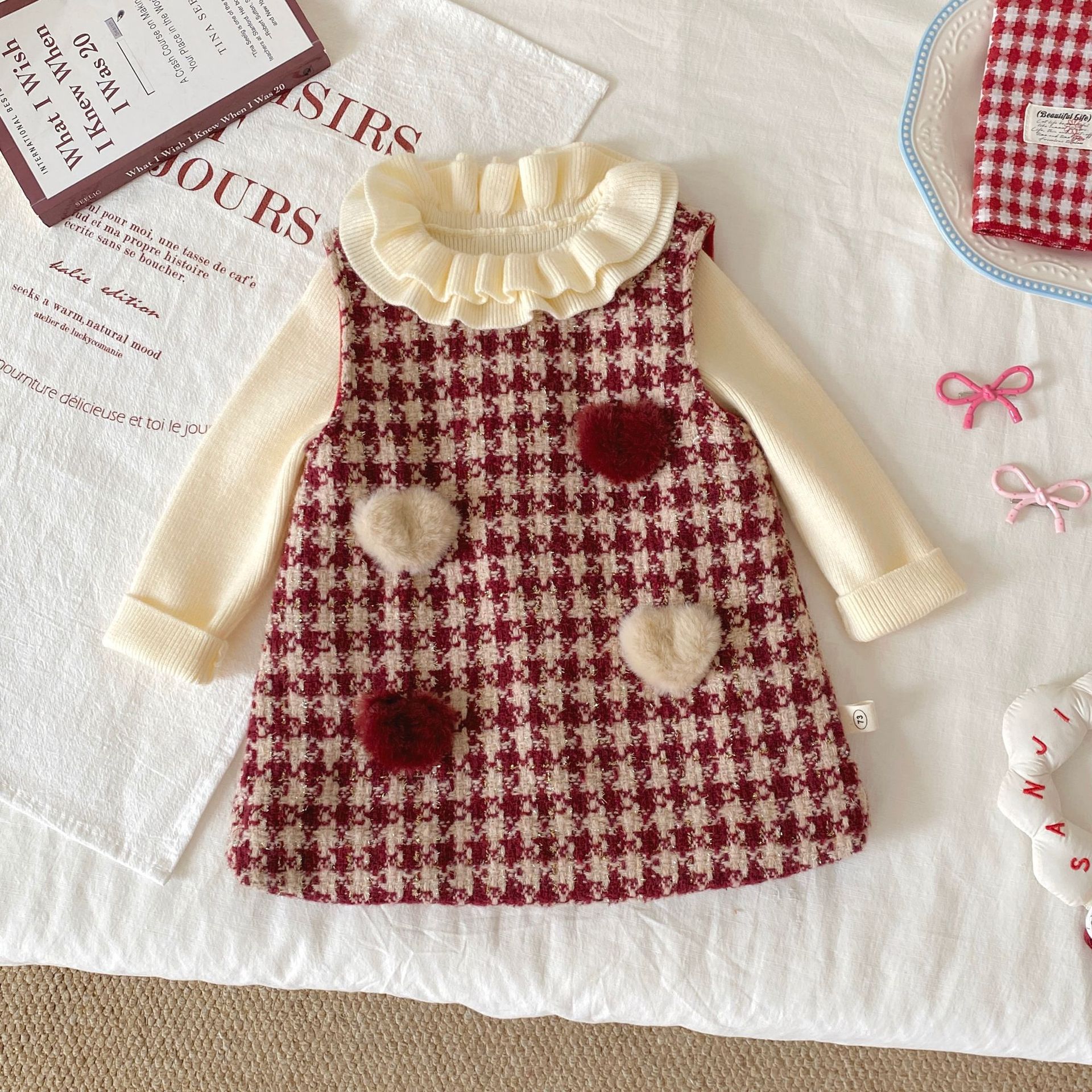 G26010110女童加絨背心裙冬季韓版寶寶加厚格紋愛心兒童裙