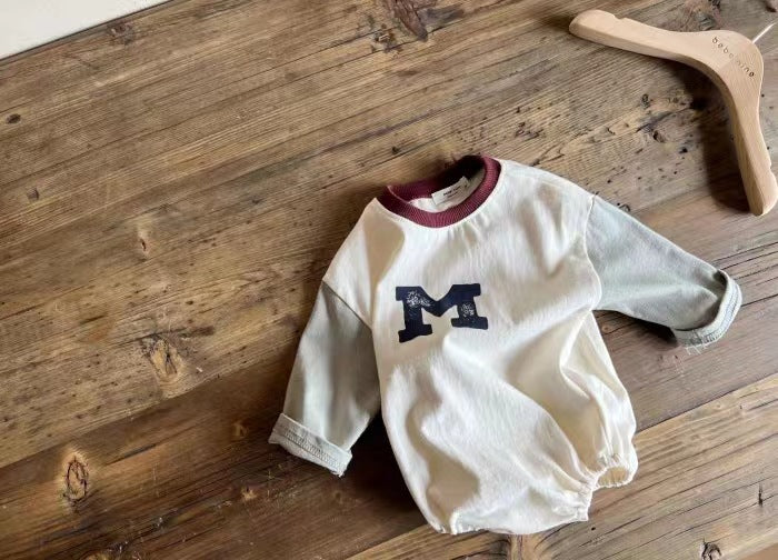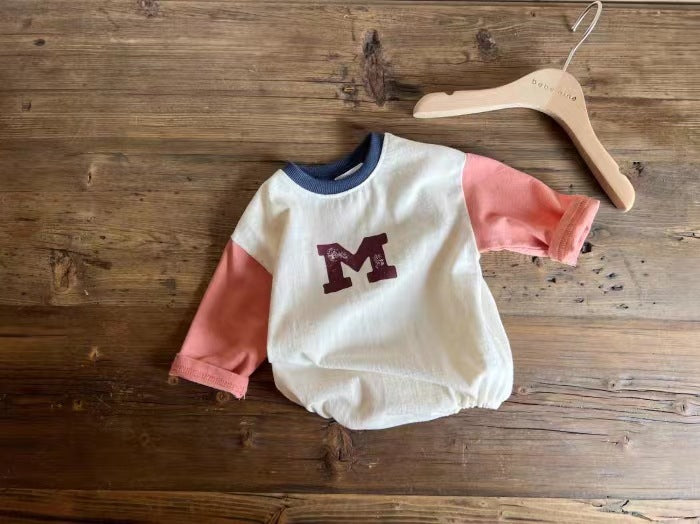 GB23091424韓版ins拼接袖圓領M字母包屁哈衣嬰幼兒洋氣潮流韓系童裝男女寶寶