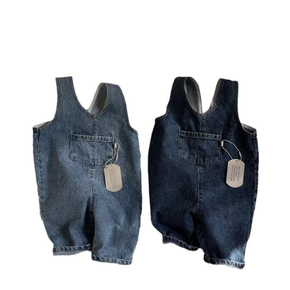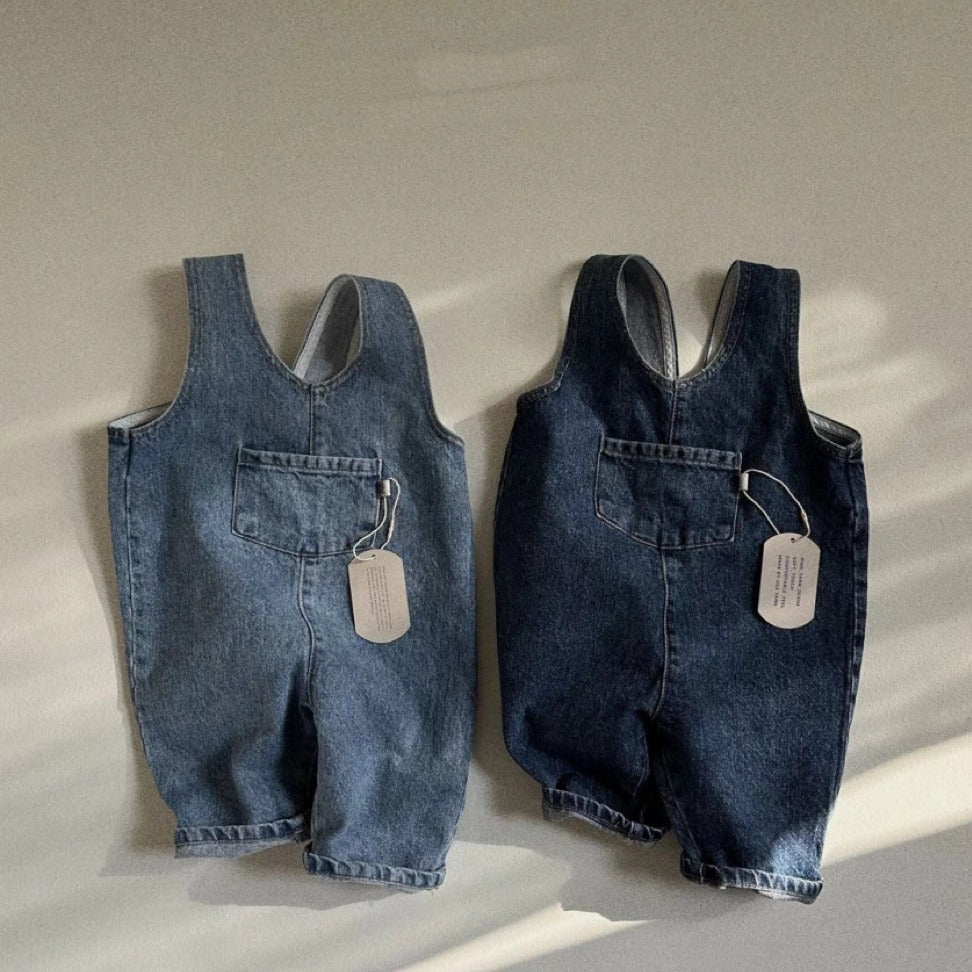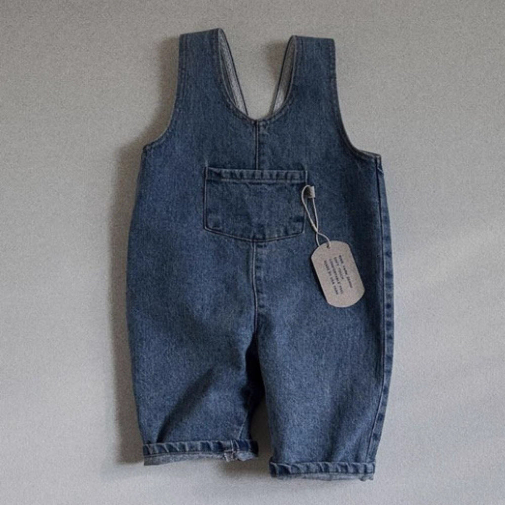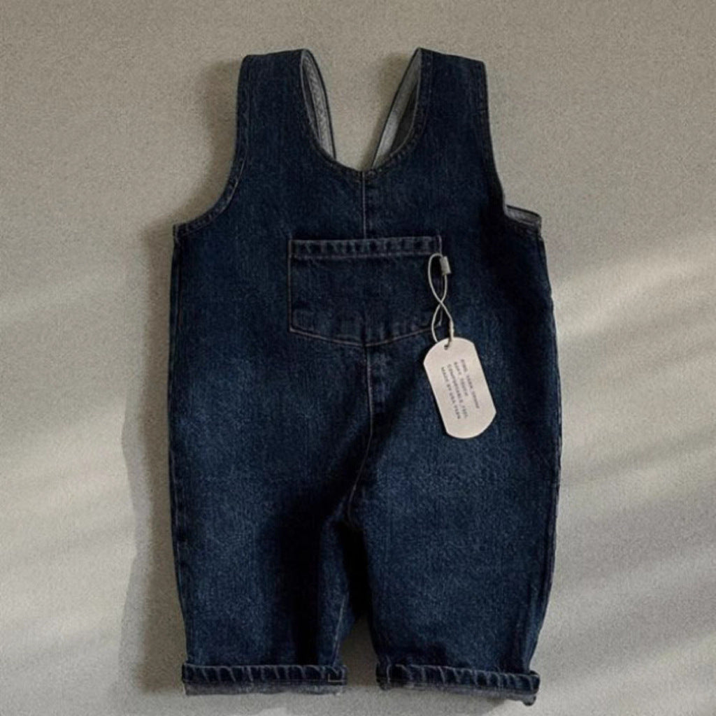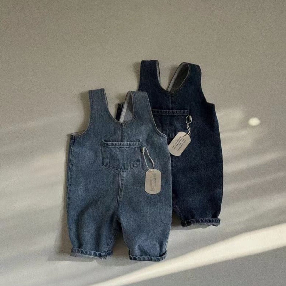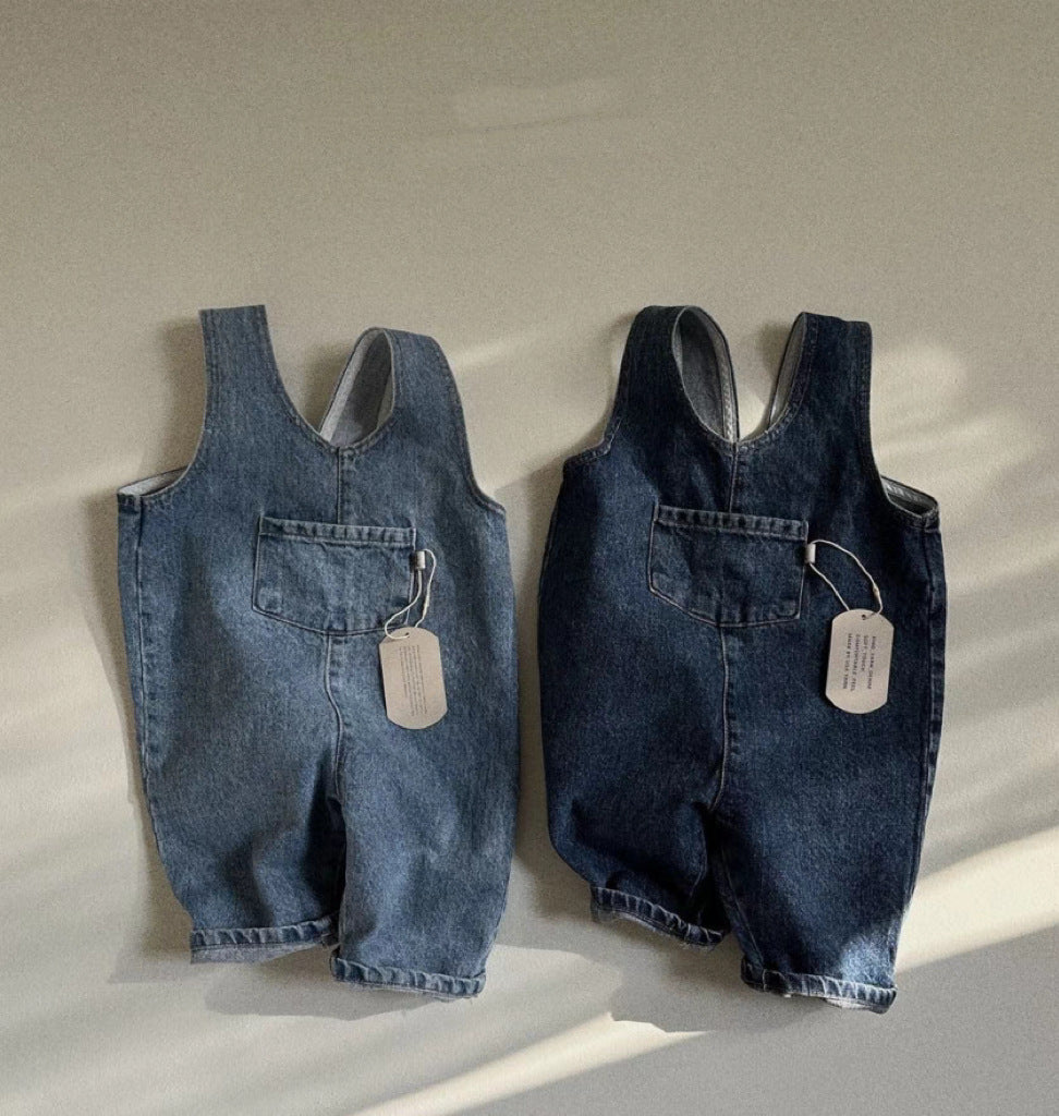 GB25032409ins韓版牛仔藍純色口袋連身背帶長褲男女寶寶春秋夏款休閒背帶褲
