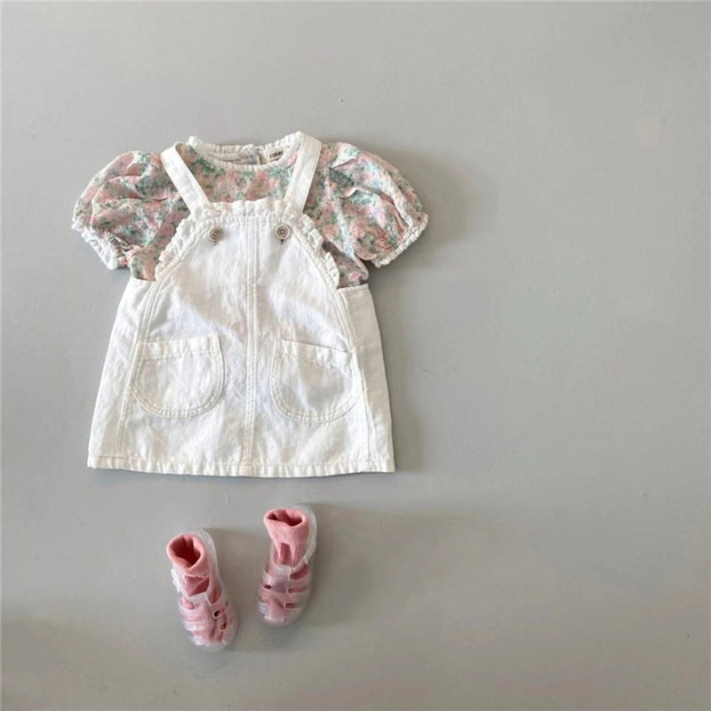 GB25032412韓版童裝2024夏季女童牛仔背帶裙+碎花短袖T寶寶可愛洋氣套裝潮