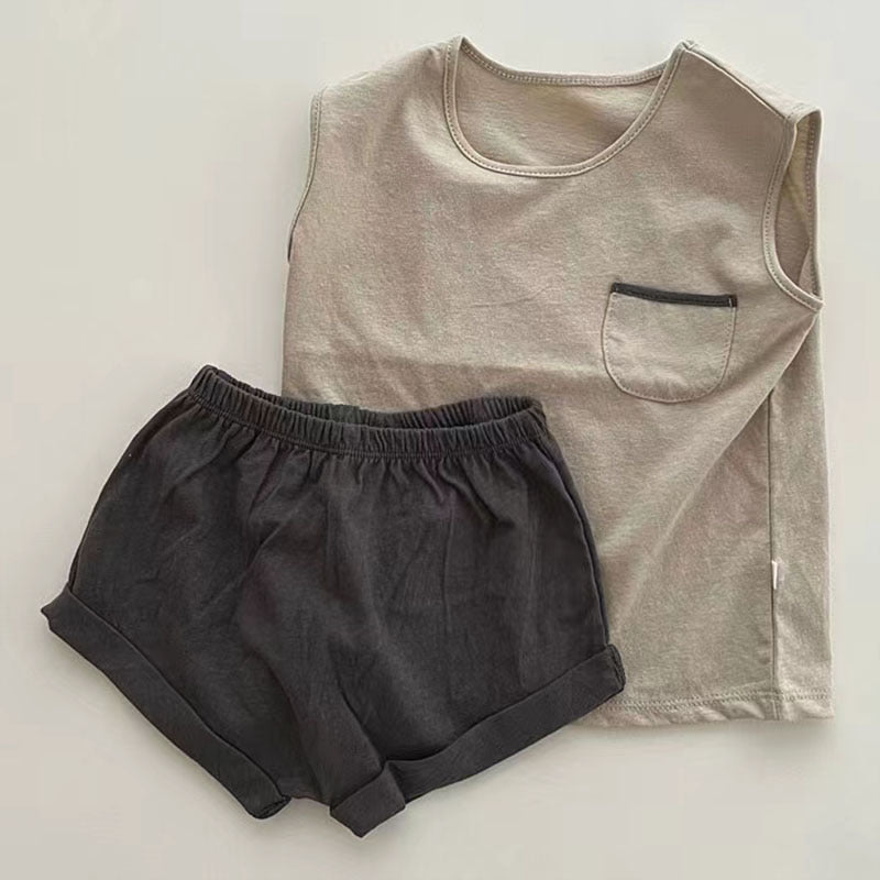 GB25032418韓版童裝ins夏款寶寶無袖簡約純色套裝嬰兒圓領休閒復古兩件套