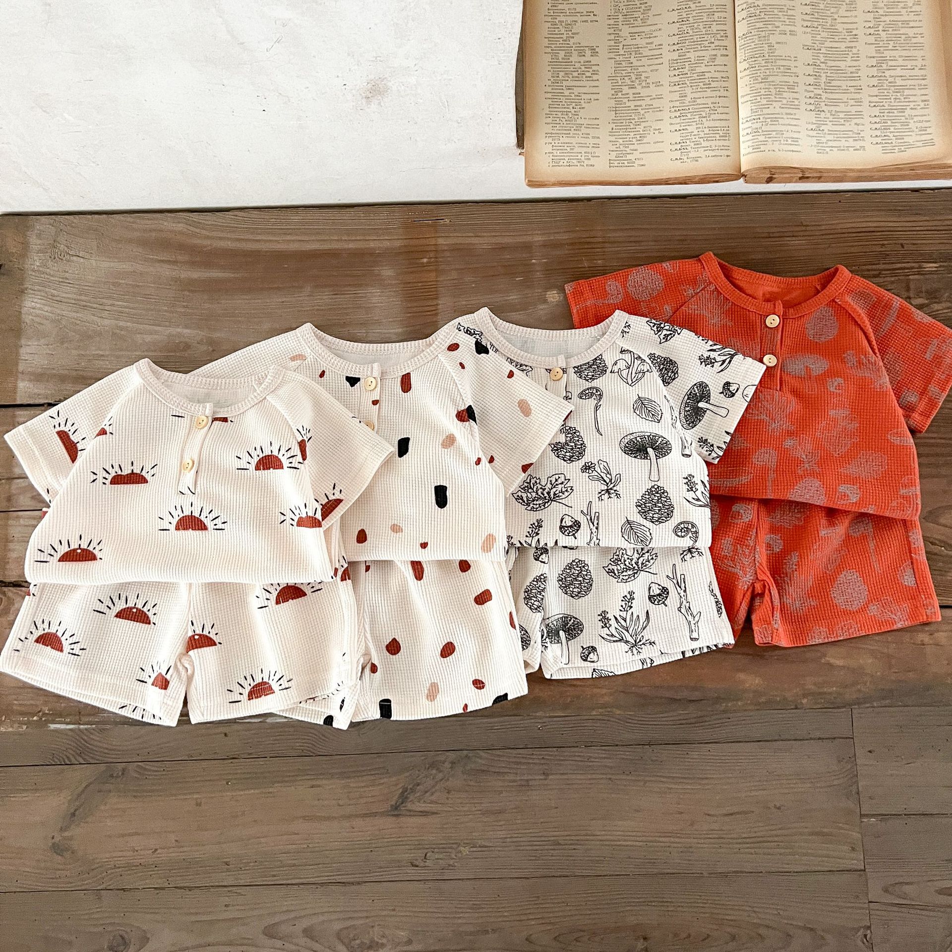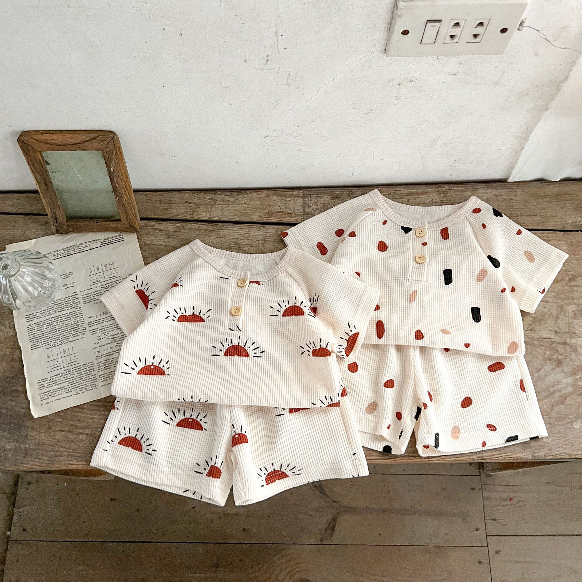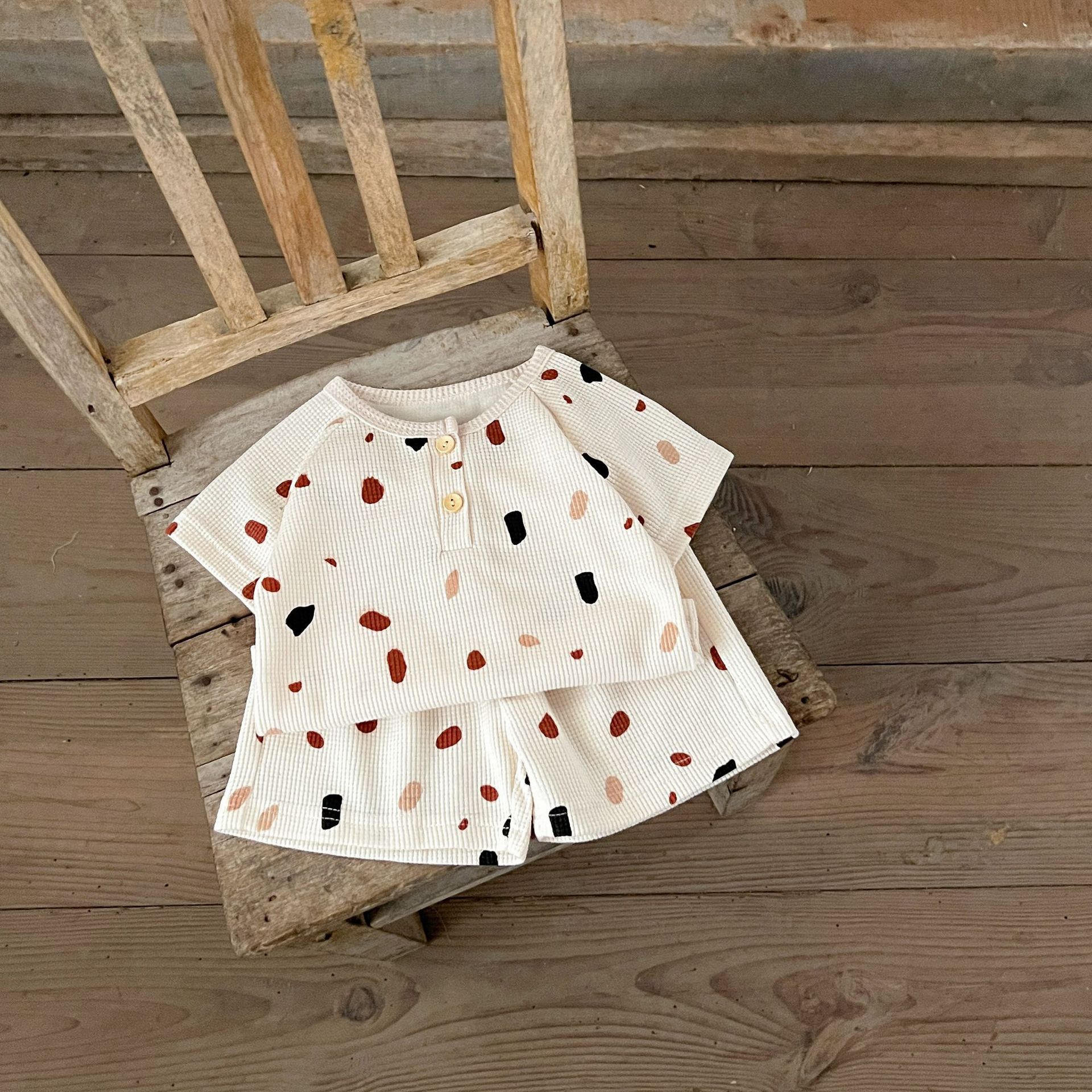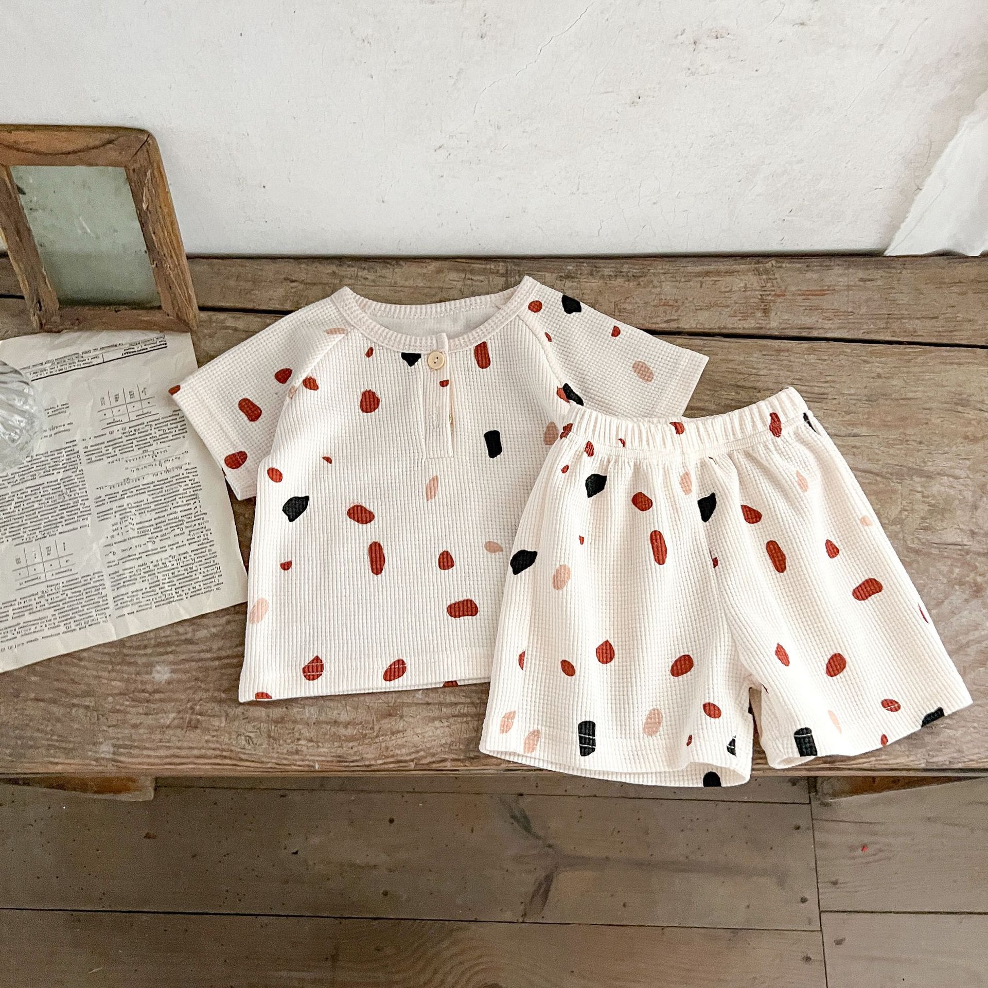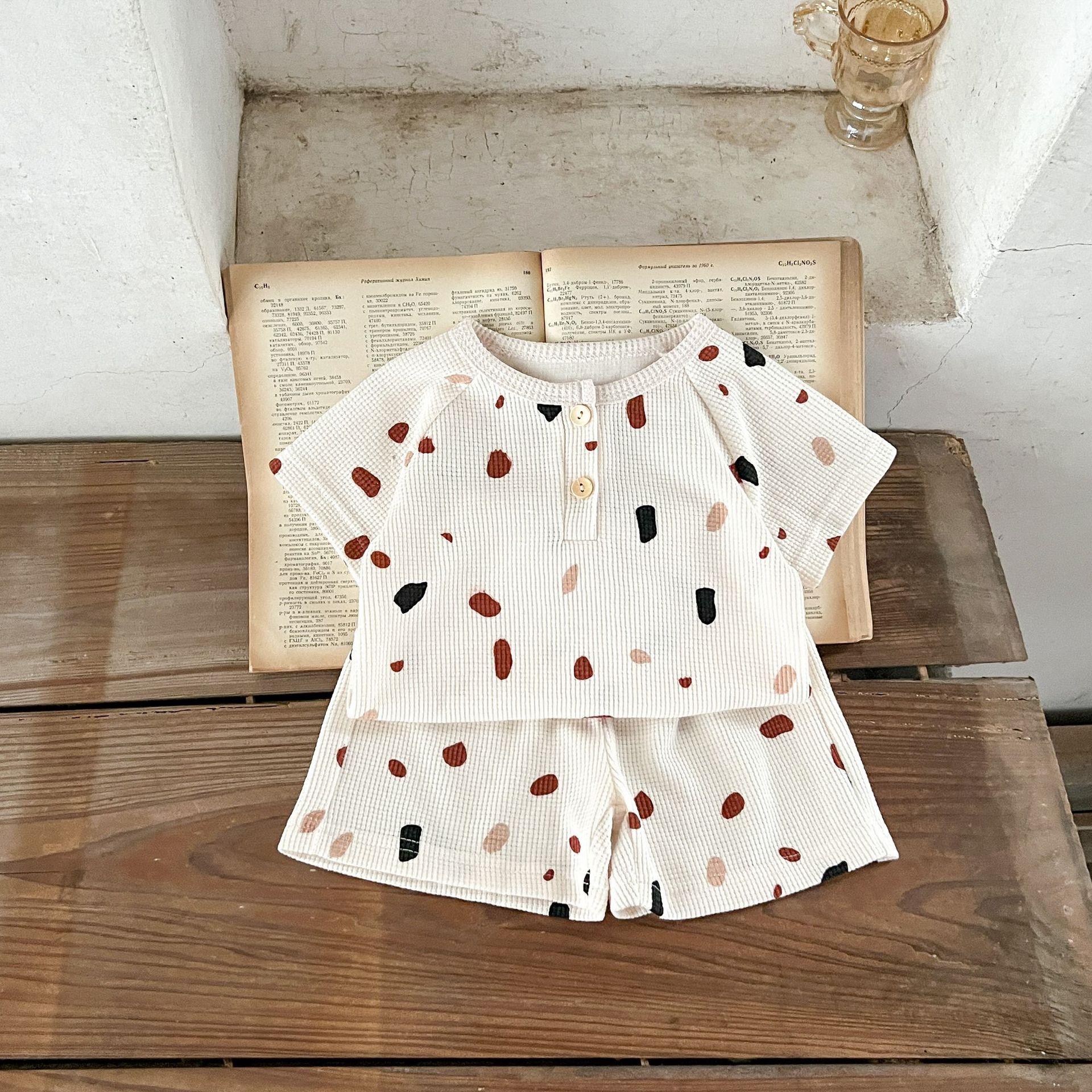 GF25061708丹麥風兒童純棉百搭套裝嬰兒幼童華夫格印花休閒短袖開襟褲兩件套