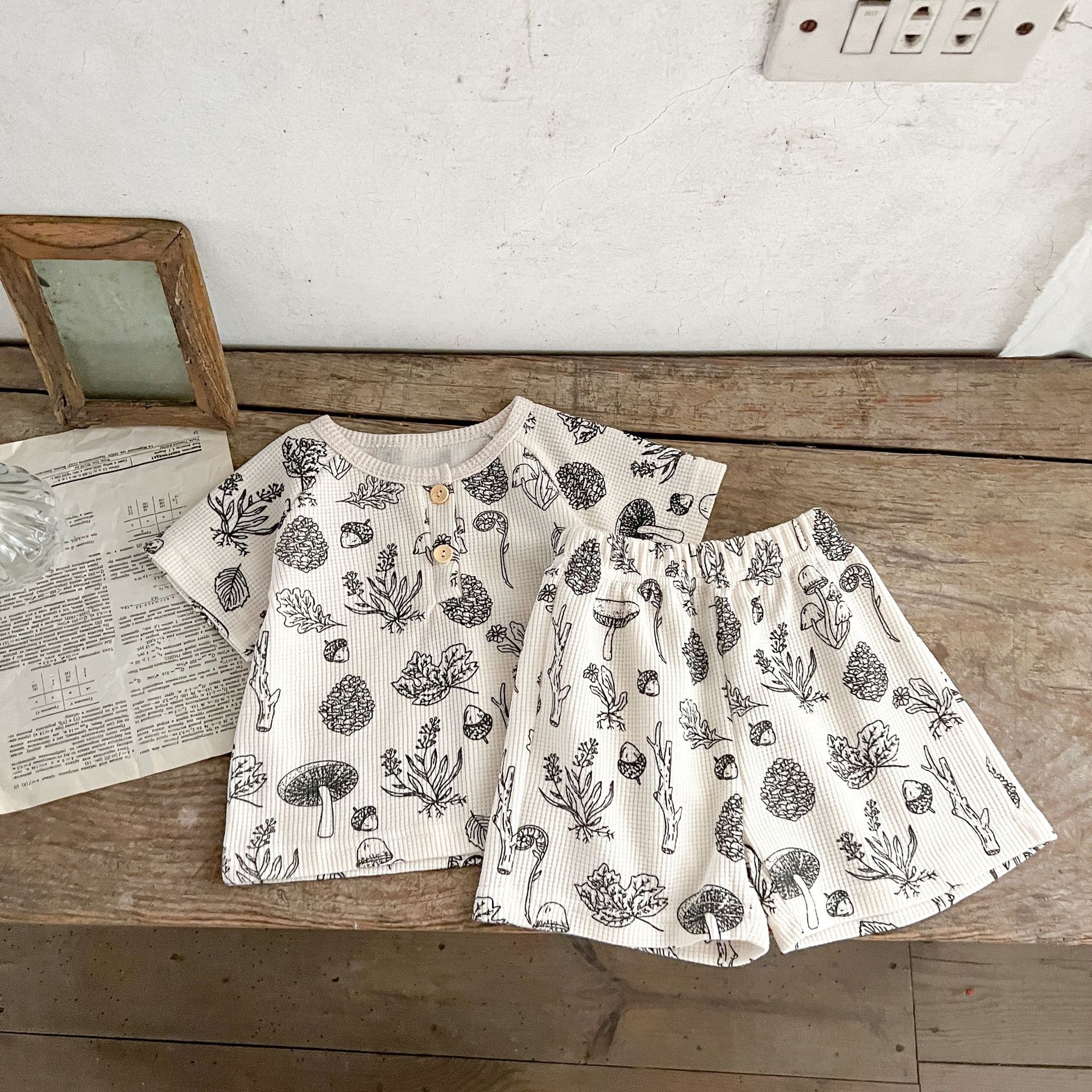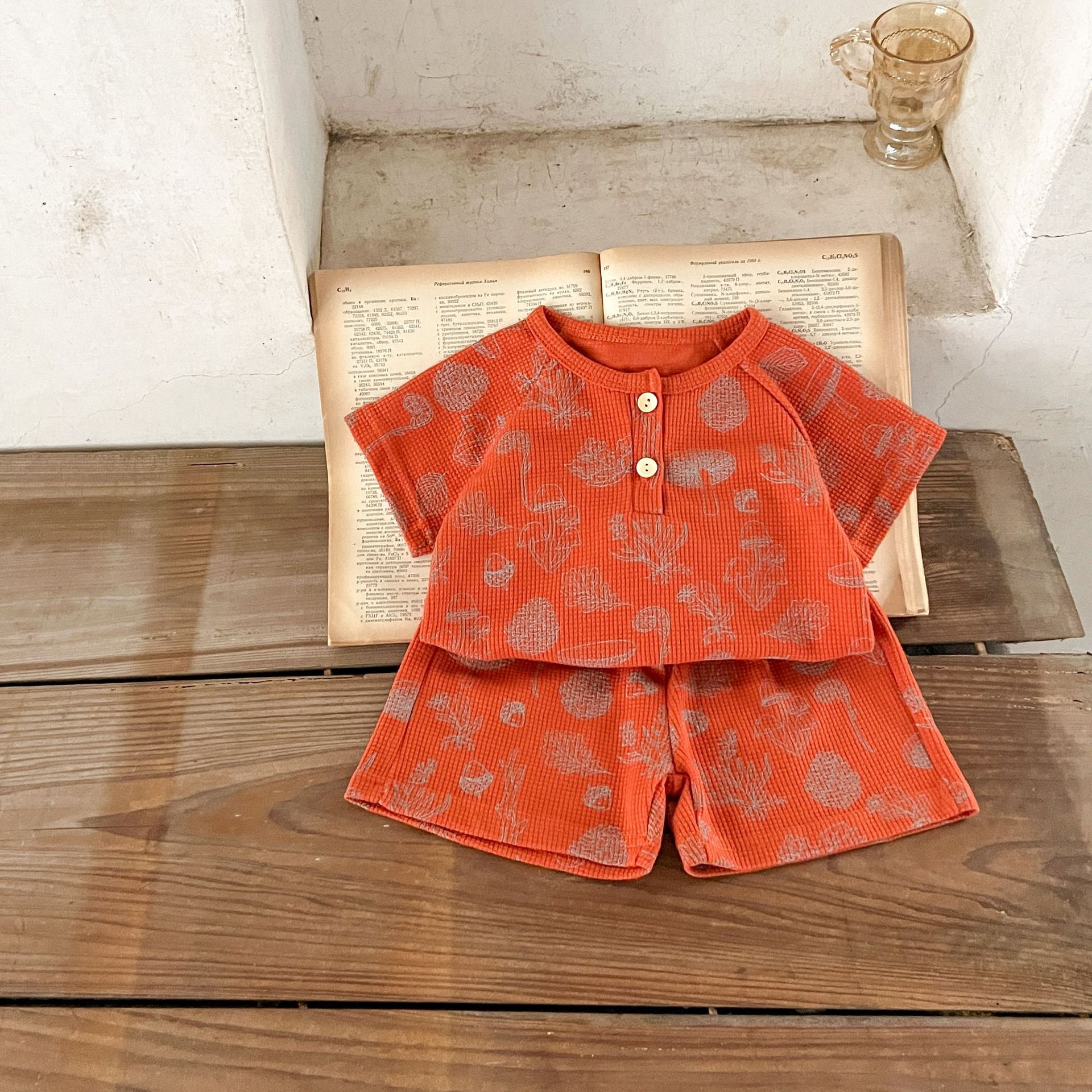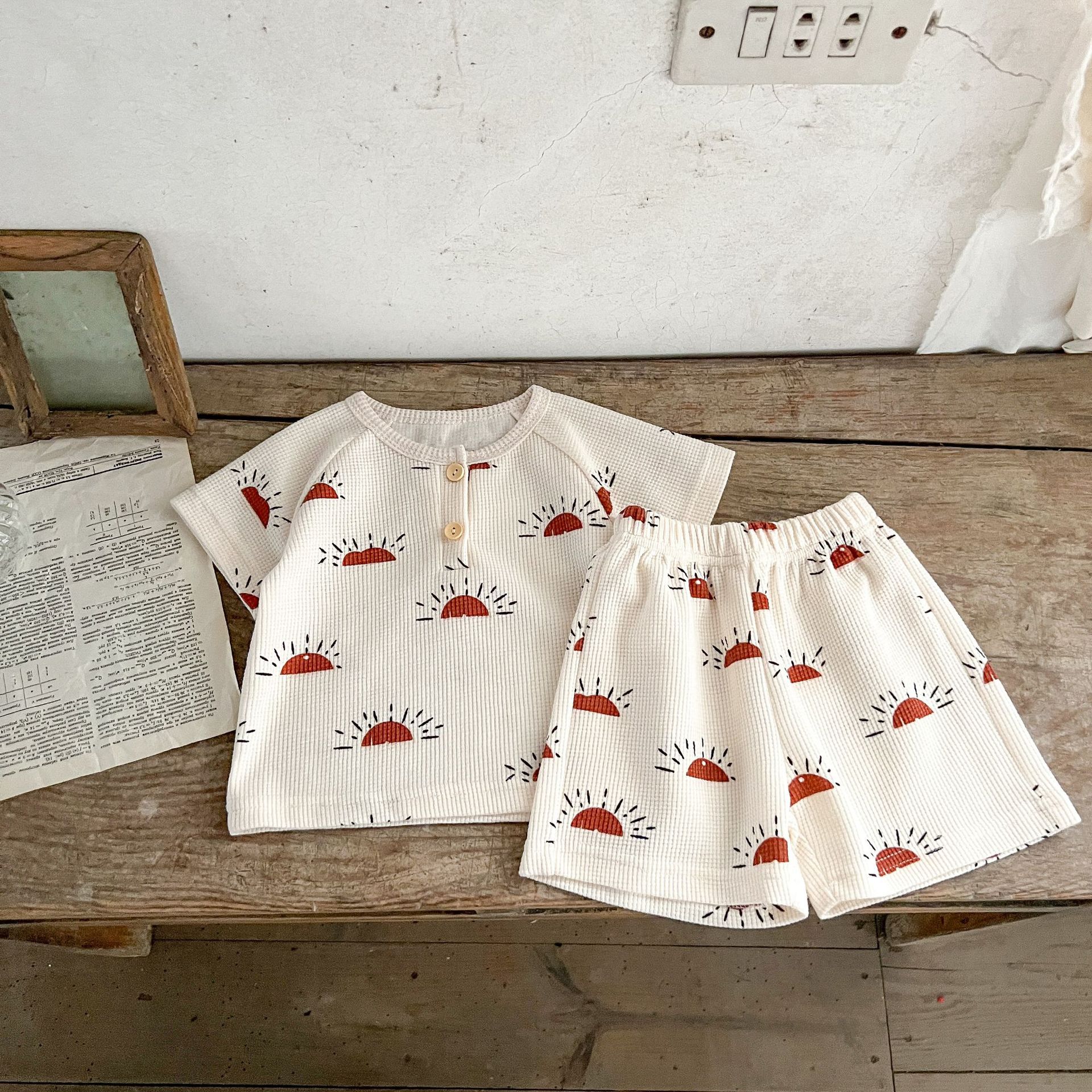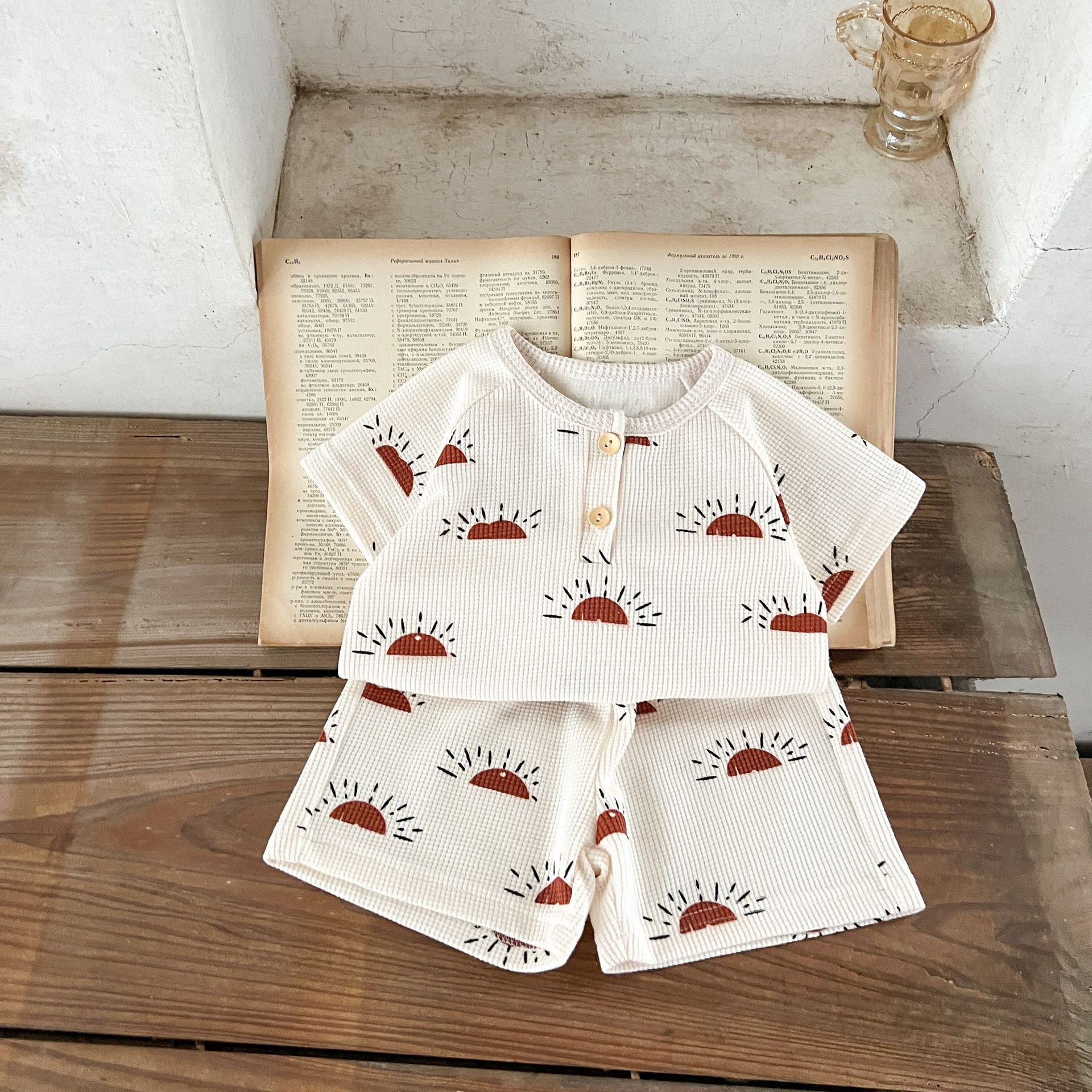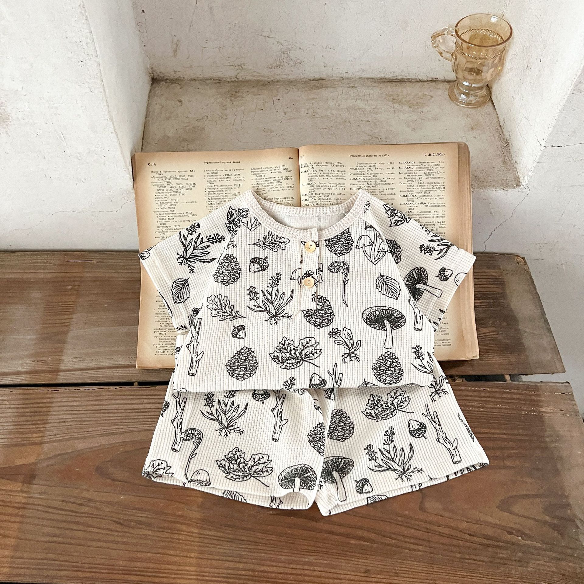 GF25061708丹麥風兒童純棉百搭套裝嬰兒幼童華夫格印花休閒短袖開襟褲兩件套