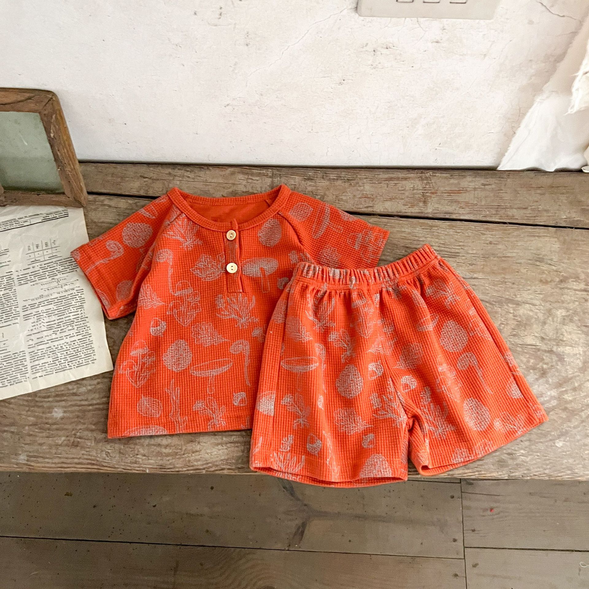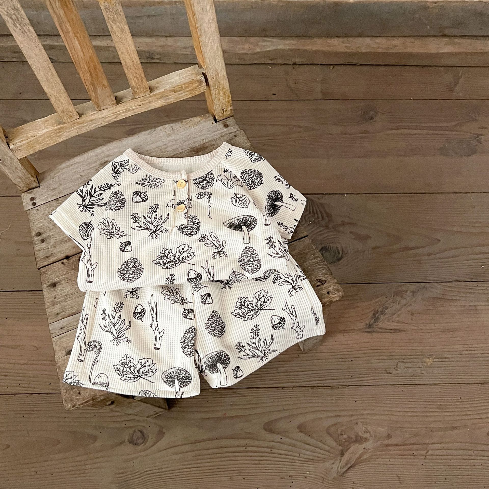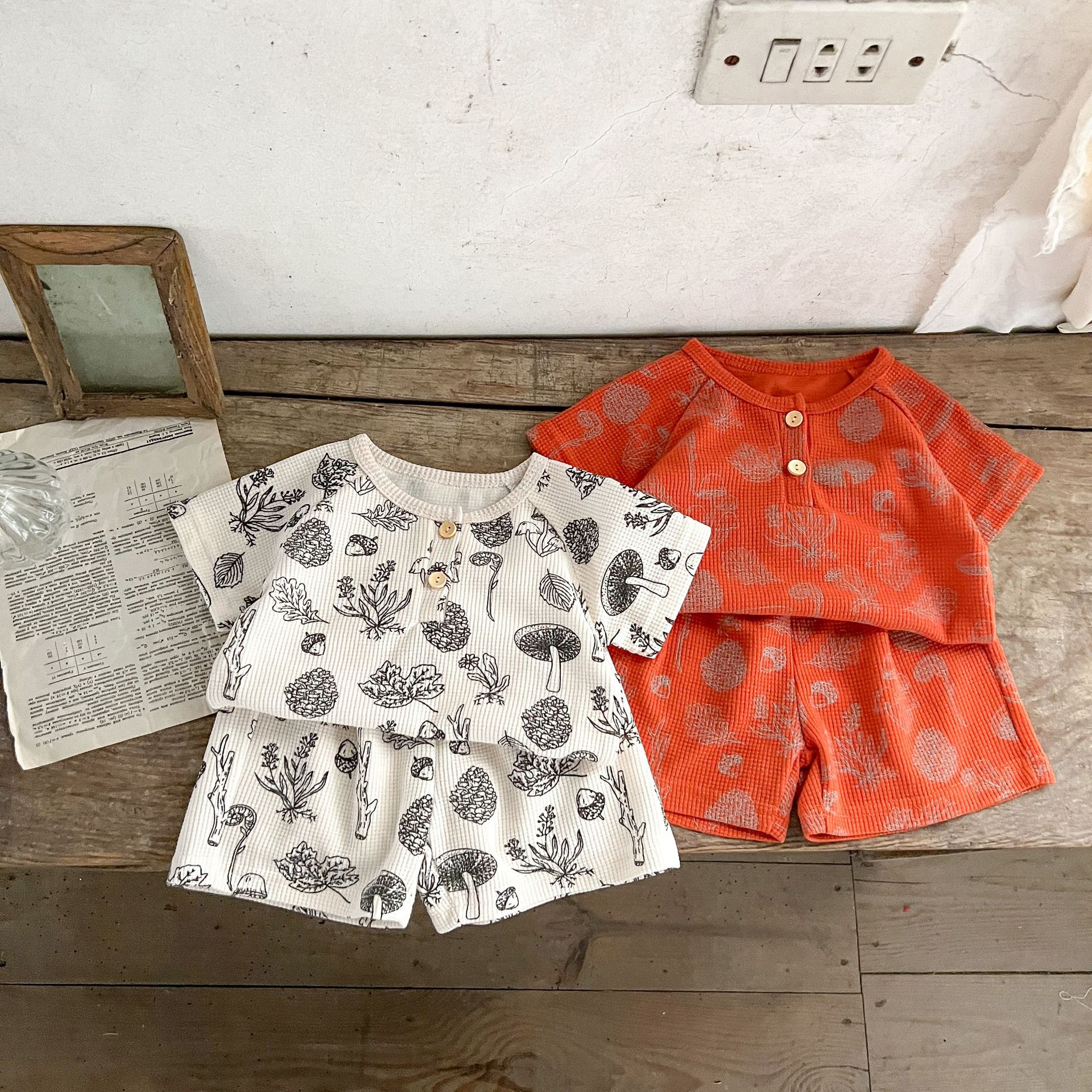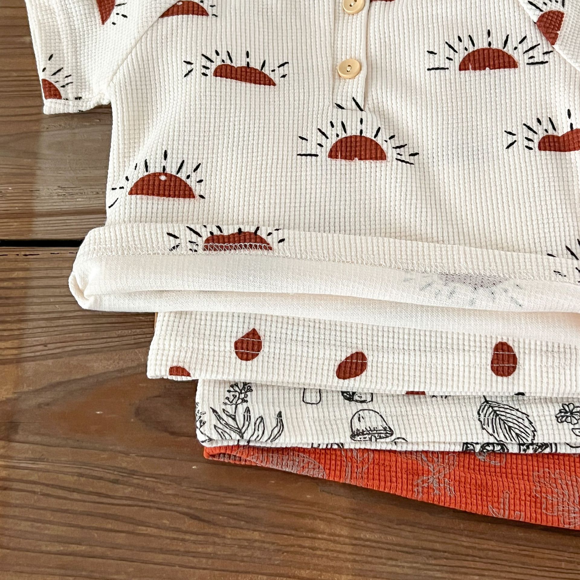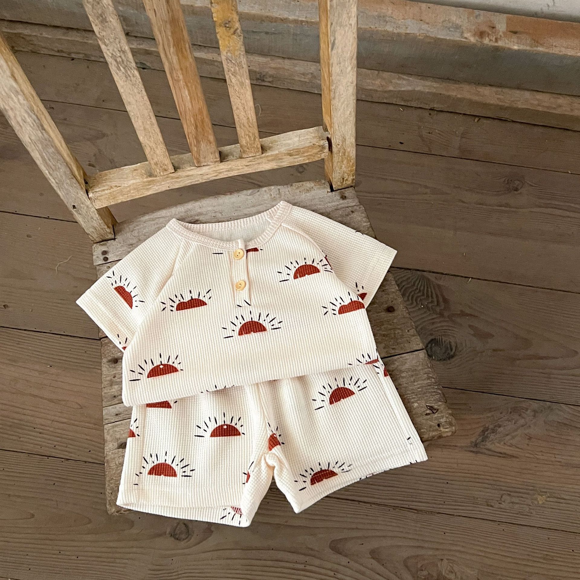 GF25061708丹麥風兒童純棉百搭套裝嬰兒幼童華夫格印花休閒短袖開襟褲兩件套