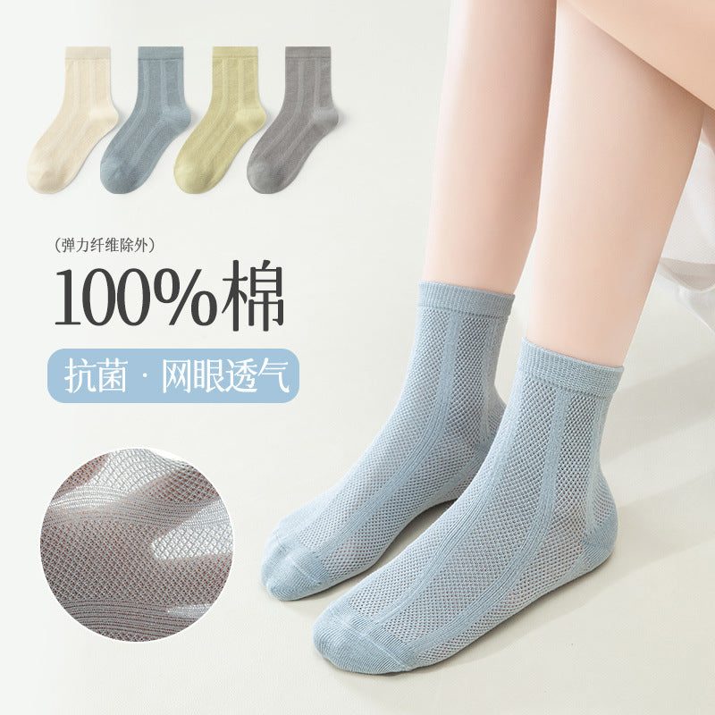 GI25073112 100%棉兒童襪 夏季純色中大童無骨棉襪萊卡抗菌男童網眼中筒