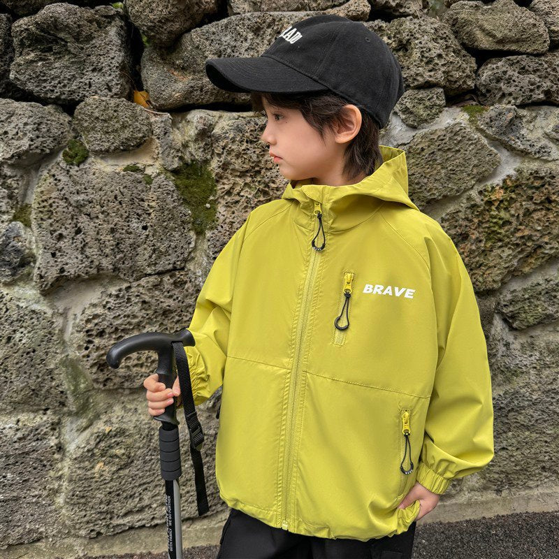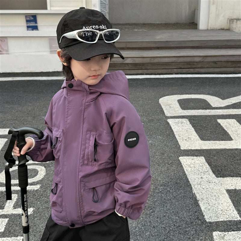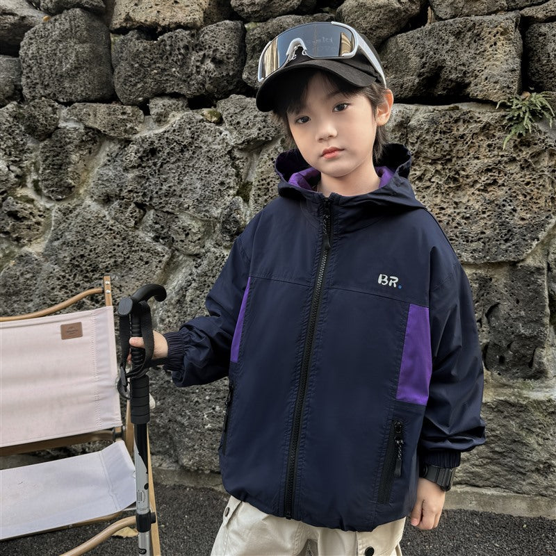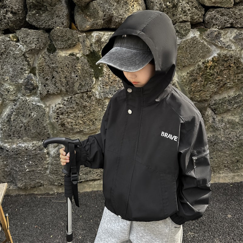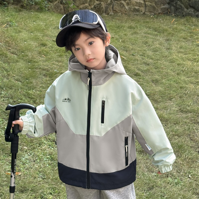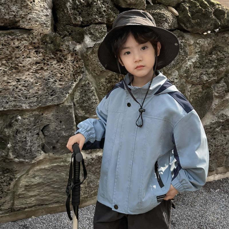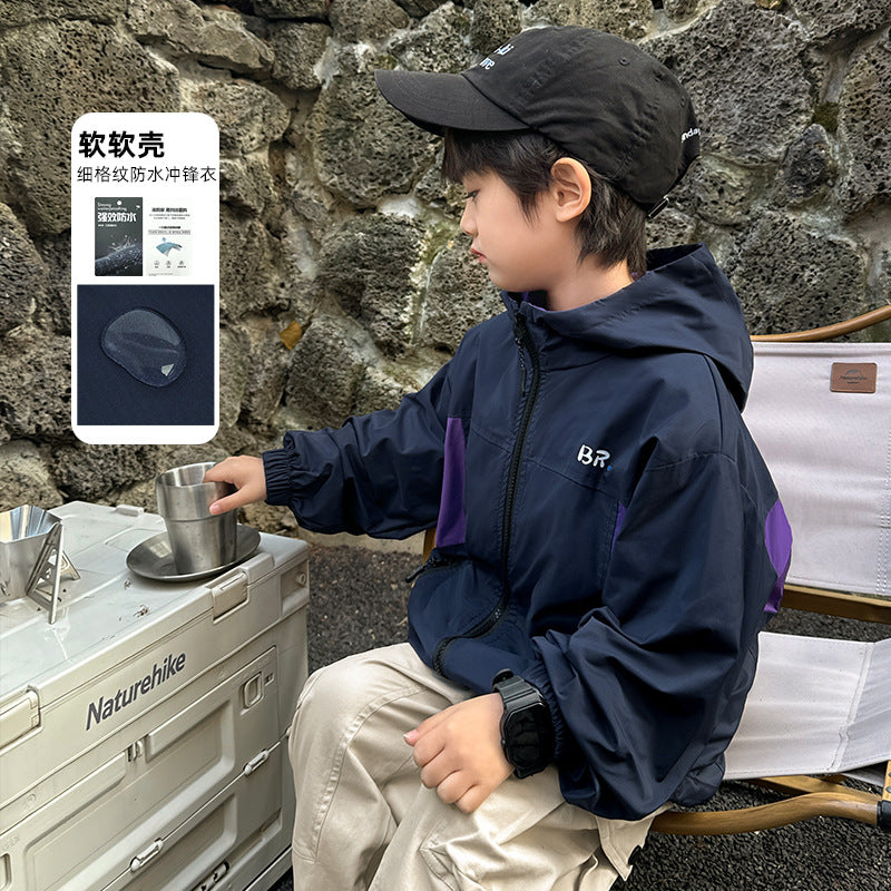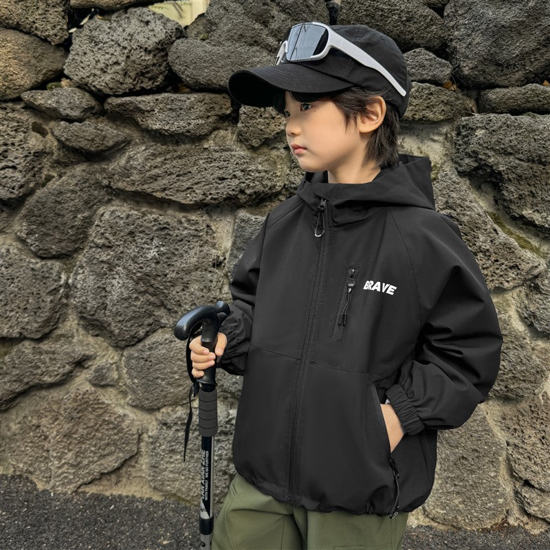 GJ25082703秋季新款男童連帽衝鋒衣軟殼外套兒童戶外秋裝衣服露營