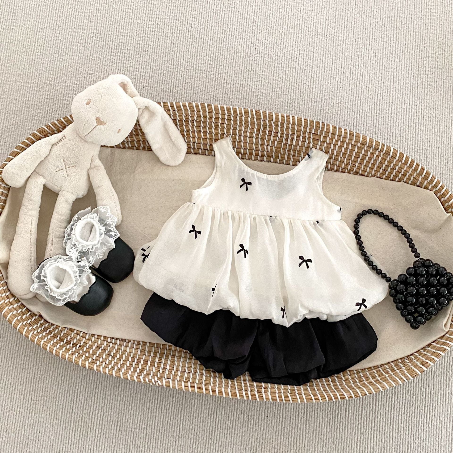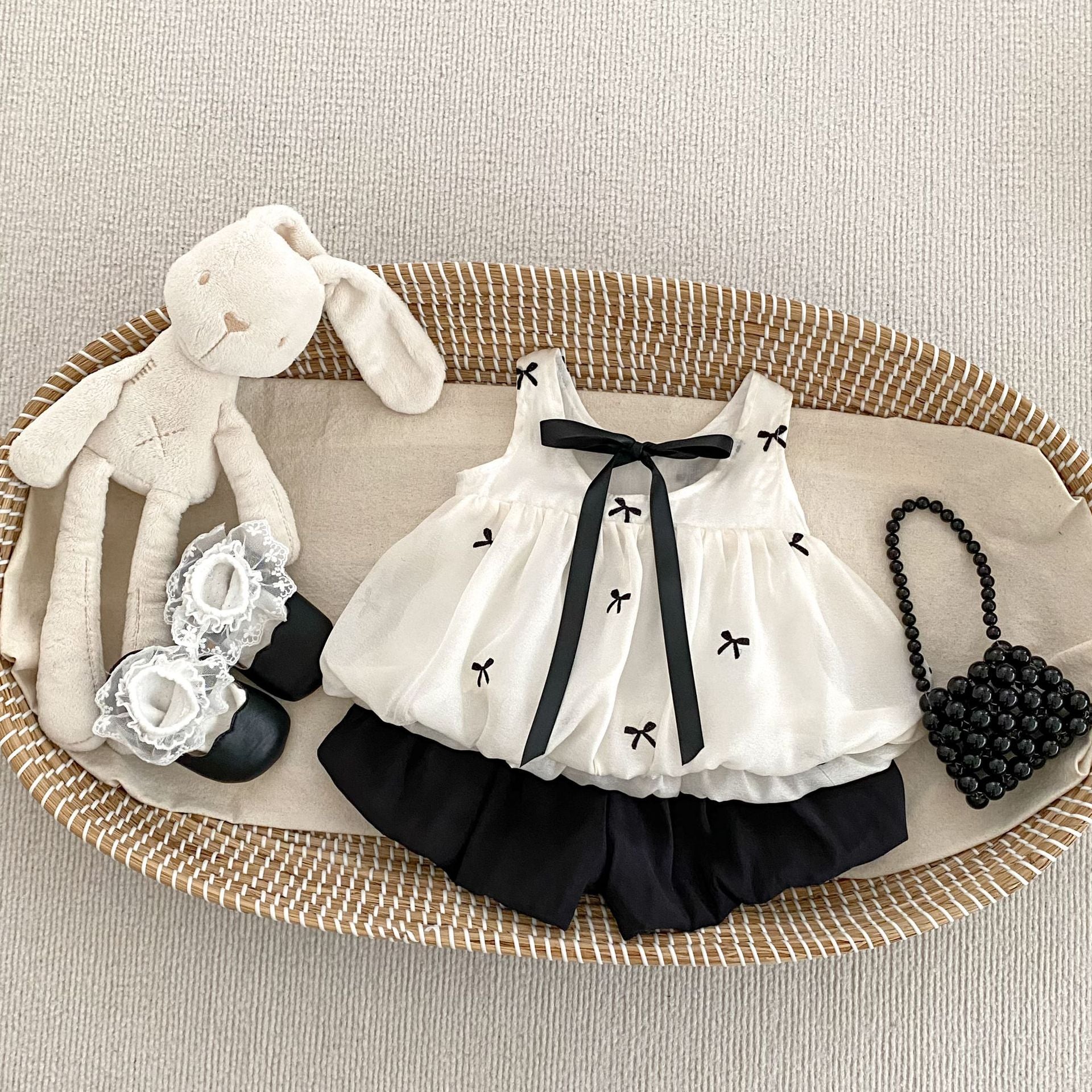 GN26030908新款洋气女童夏天两件套蝴蝶结背心上衣百搭花苞短裤套装(2件起批)GN開頭需下單2款才有出貨,可混搭
