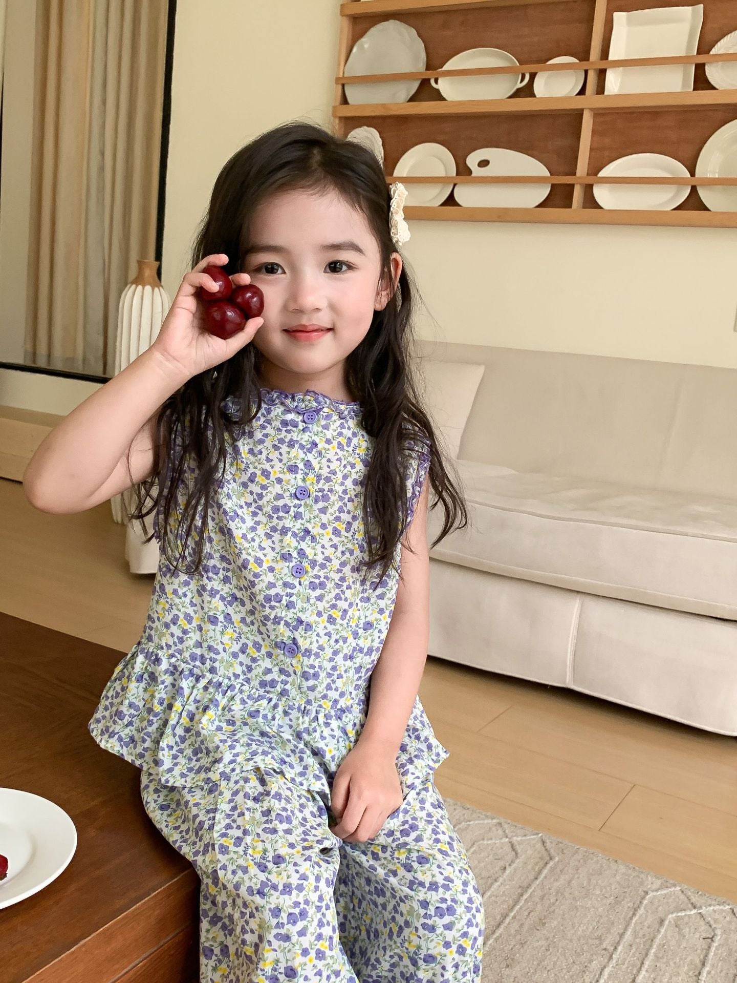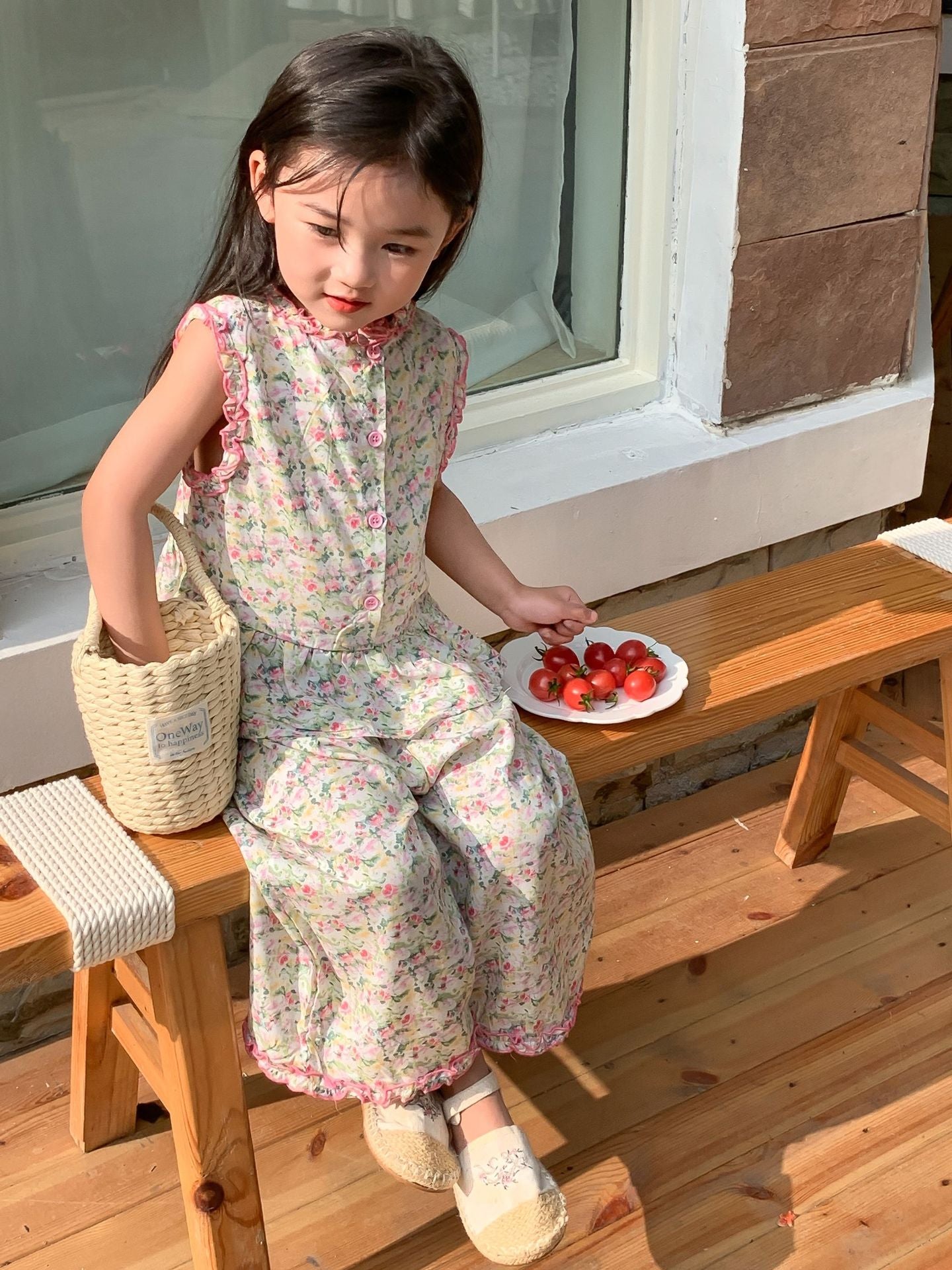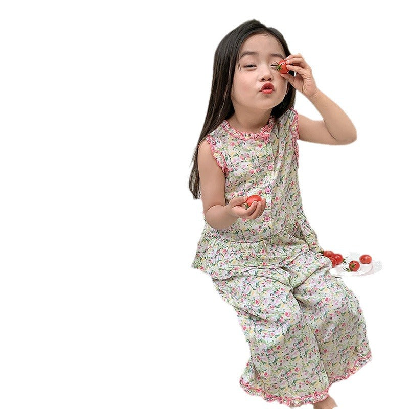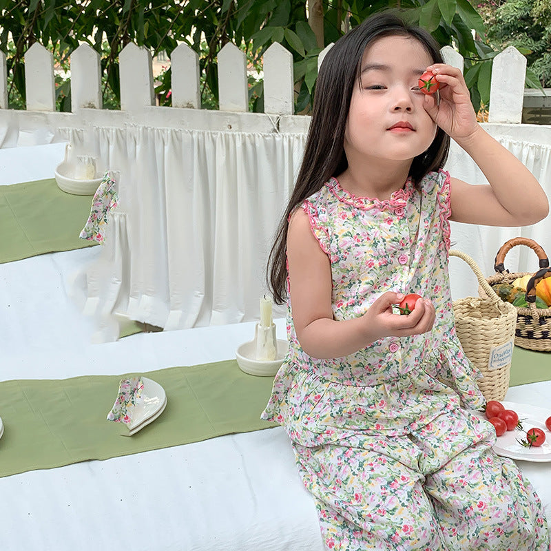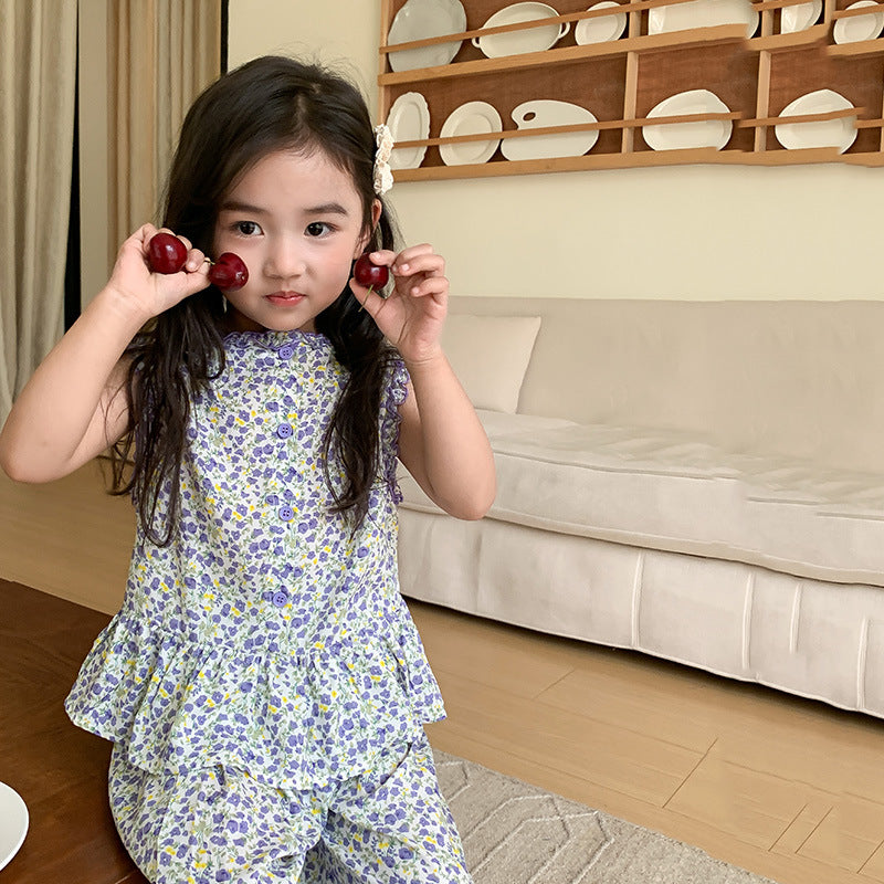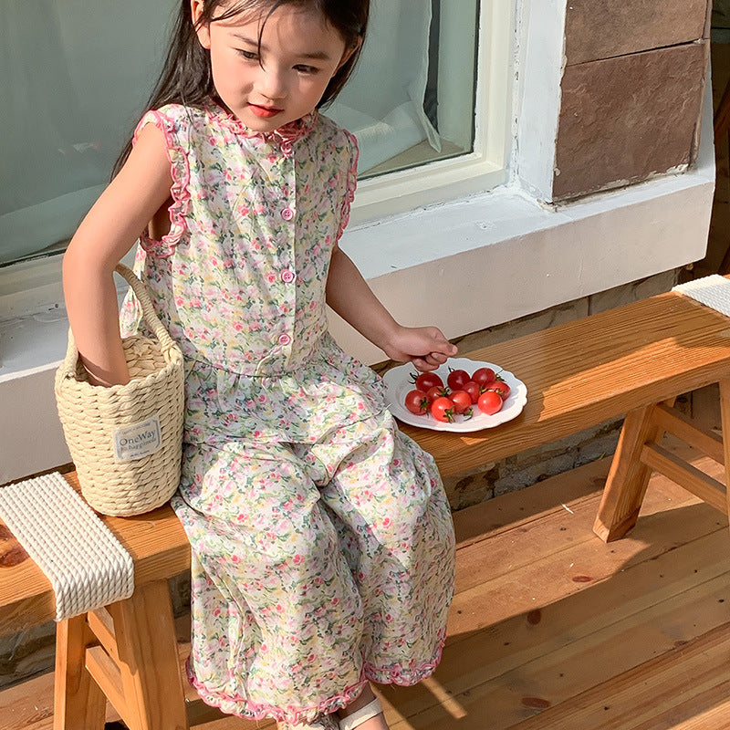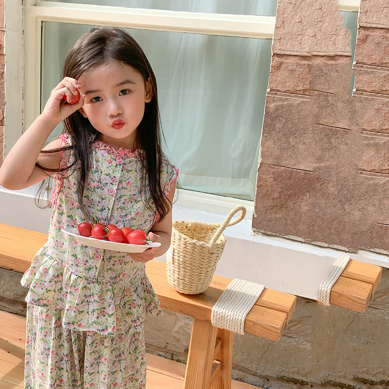 J24022902童套裝2024夏女童公主寬鬆田園風韓版碎花花邊娃娃衫寬褲套裝