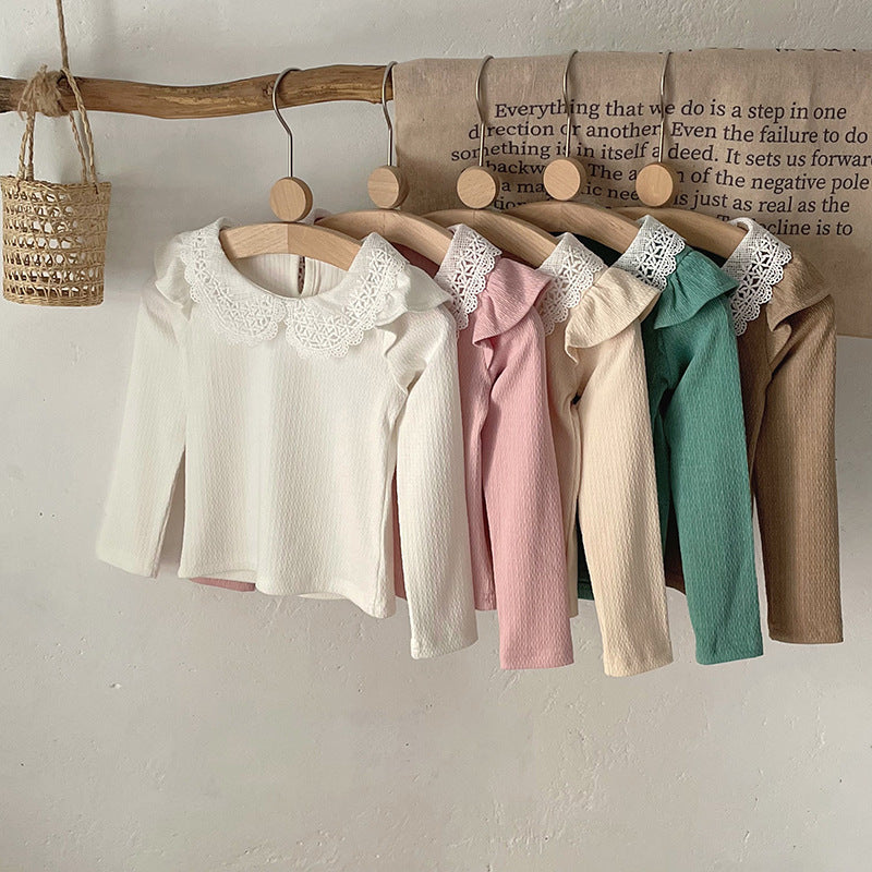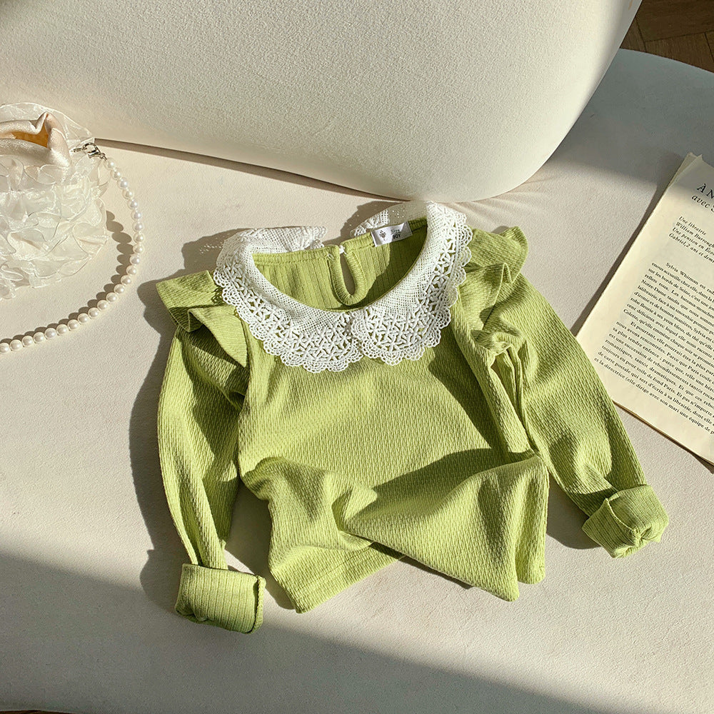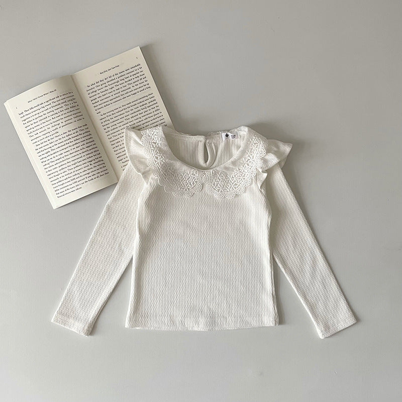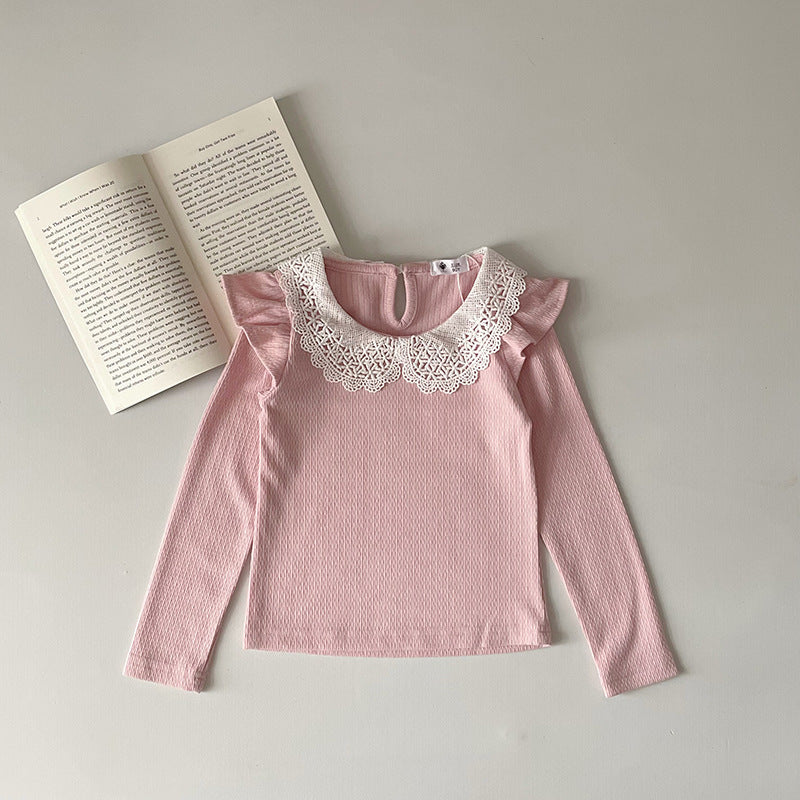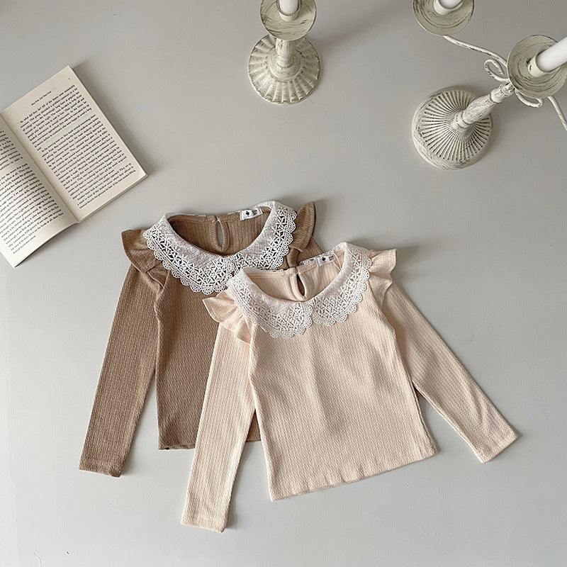 J24022910 INS款春秋女嬰寶寶荷葉邊棉蕾絲領坑條純色打底衫飛袖娃娃領T恤