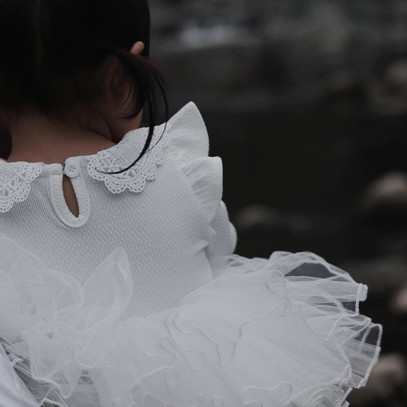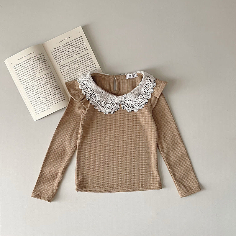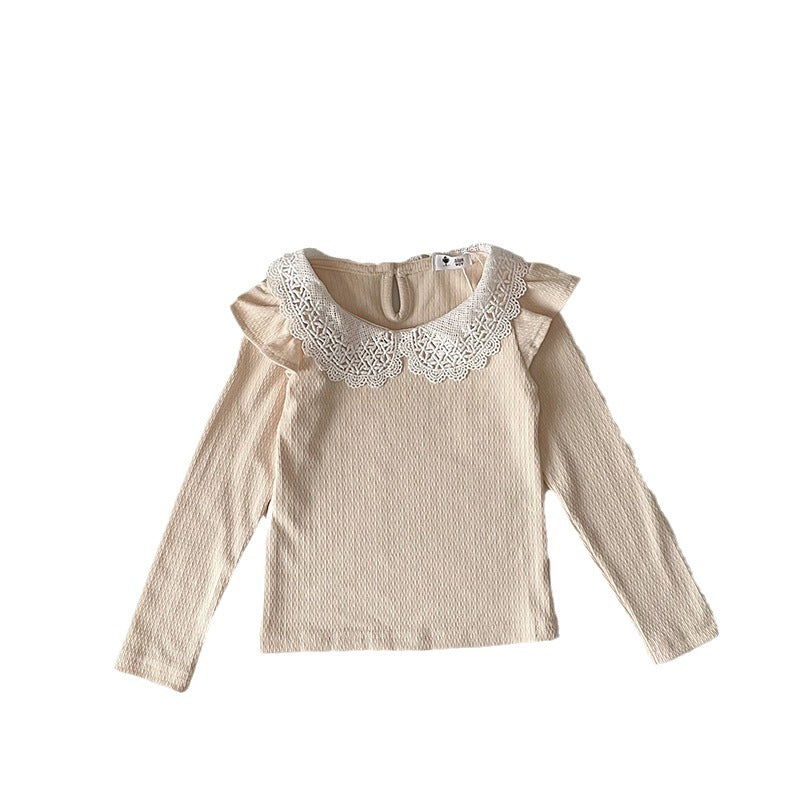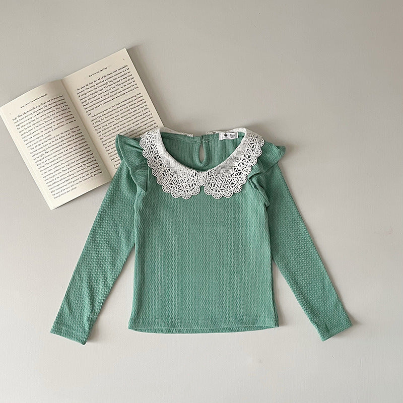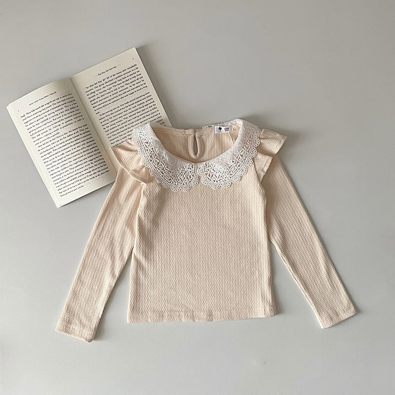 J24022910 INS款春秋女嬰寶寶荷葉邊棉蕾絲領坑條純色打底衫飛袖娃娃領T恤