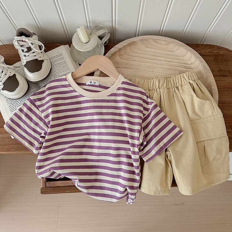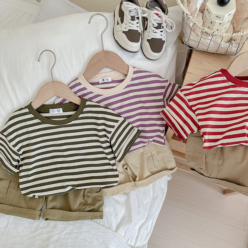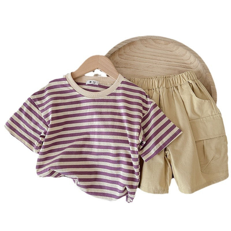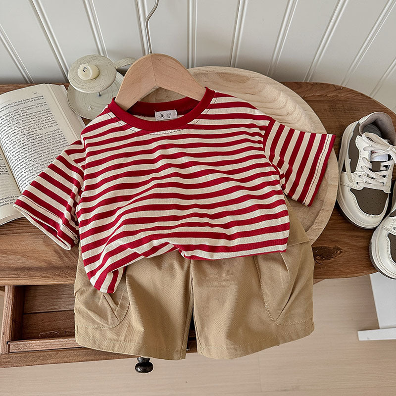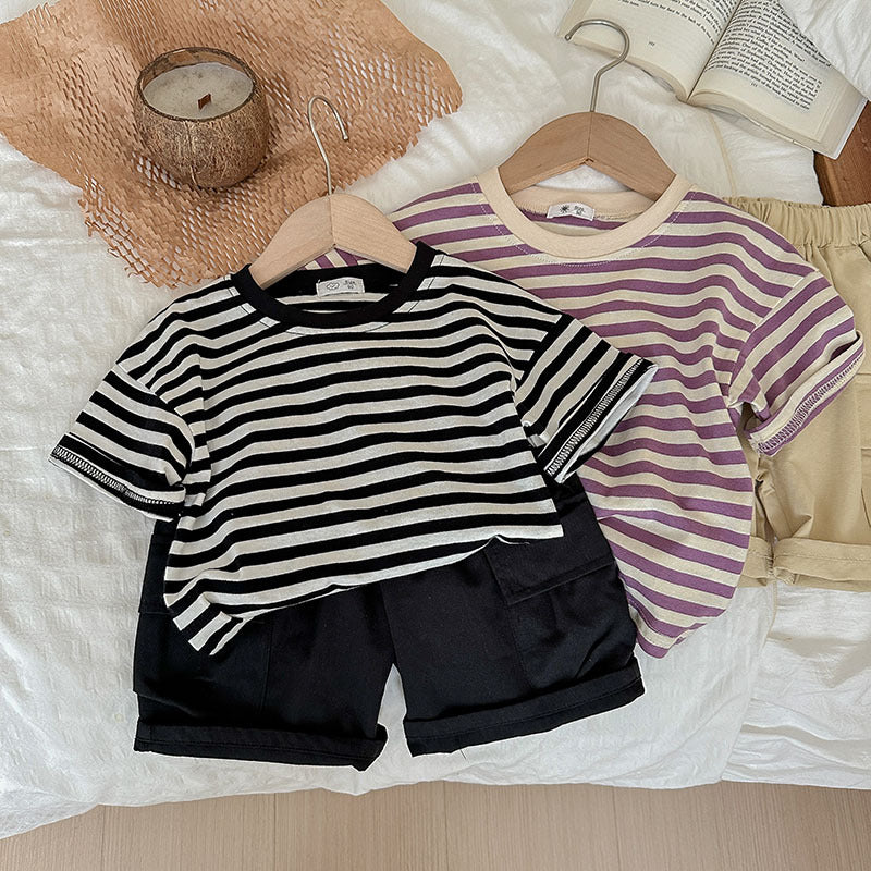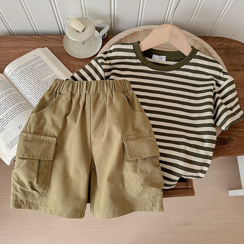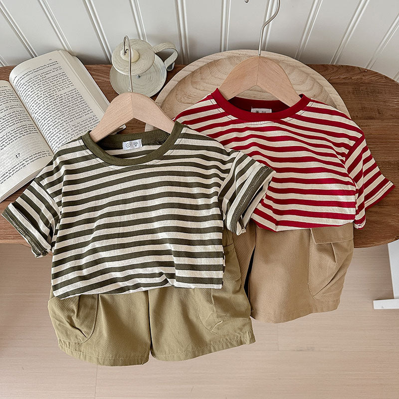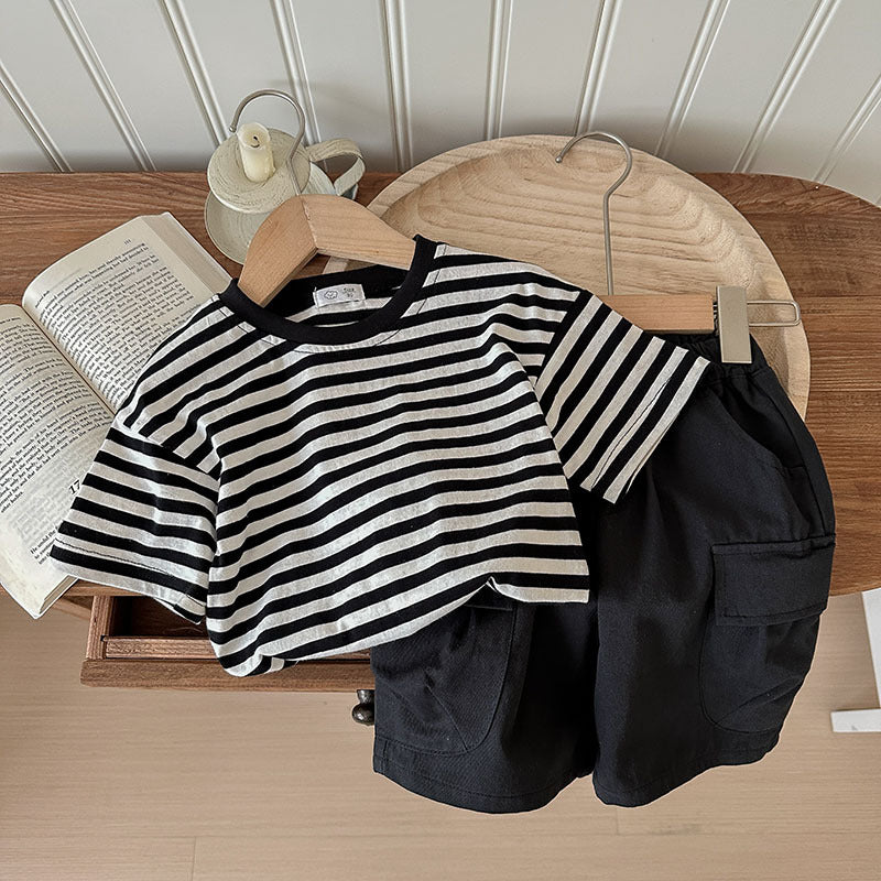 J24022912夏季男女寶寶薄款坑條棉T恤工人短褲兩件套兒童套裝歐美兄妹裝