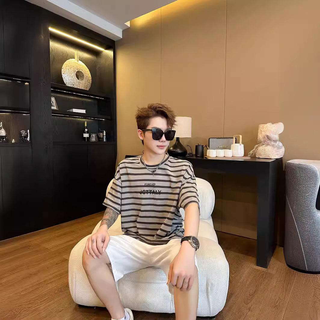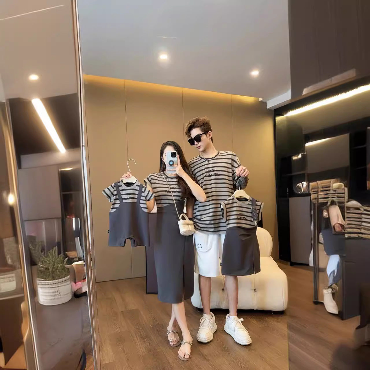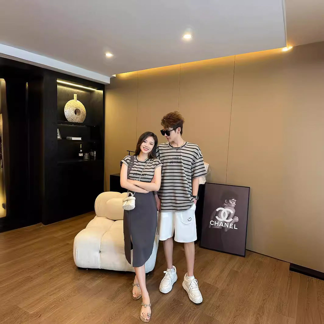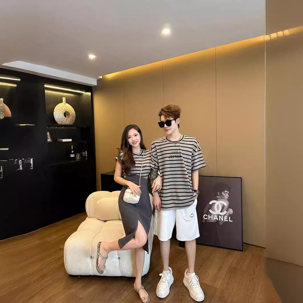 L24071410高端親子裝夏款一家四口條紋短袖時尚洋氣假兩件母女背帶裙度假服